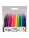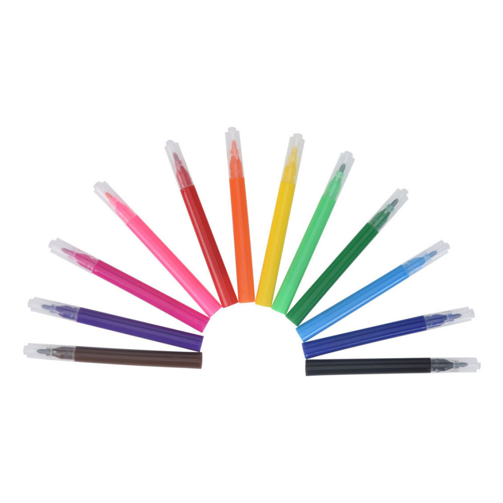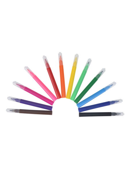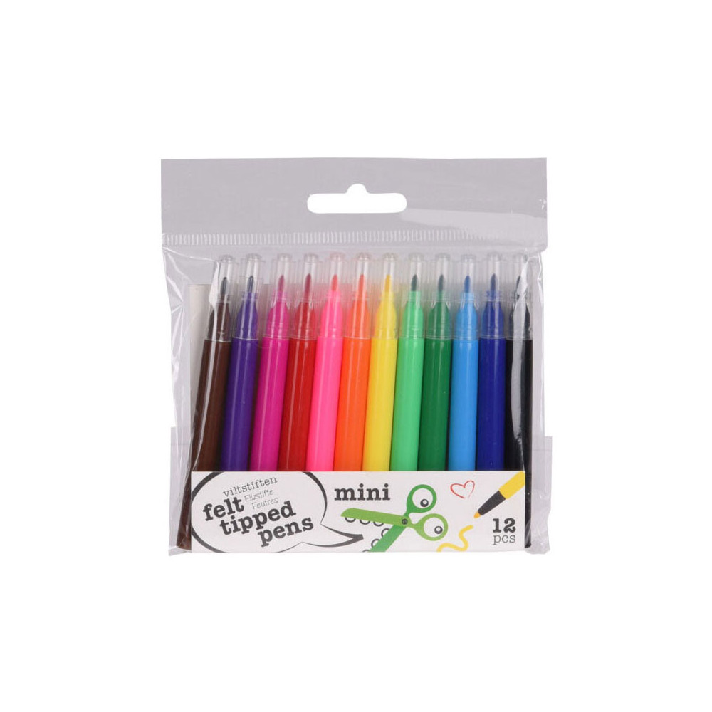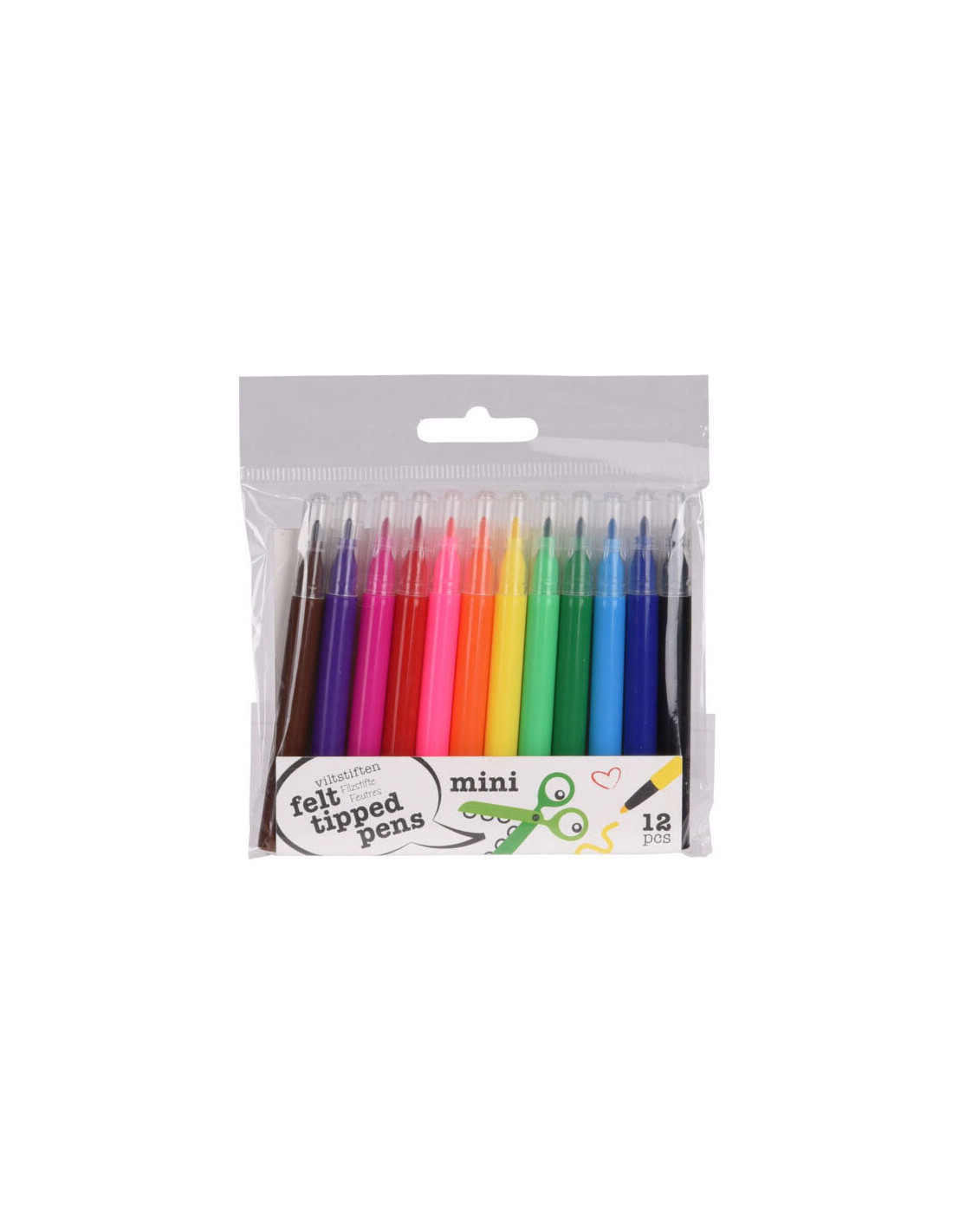 Set van 12 mini viltstiften met de kleuren bruin, paars, donkerroze, lichtroze, rood, oranje, geel, lichtgroen, donkergroen, lichtblauw, donkerblauw en zwart. De stiften hebben een transparante dop.