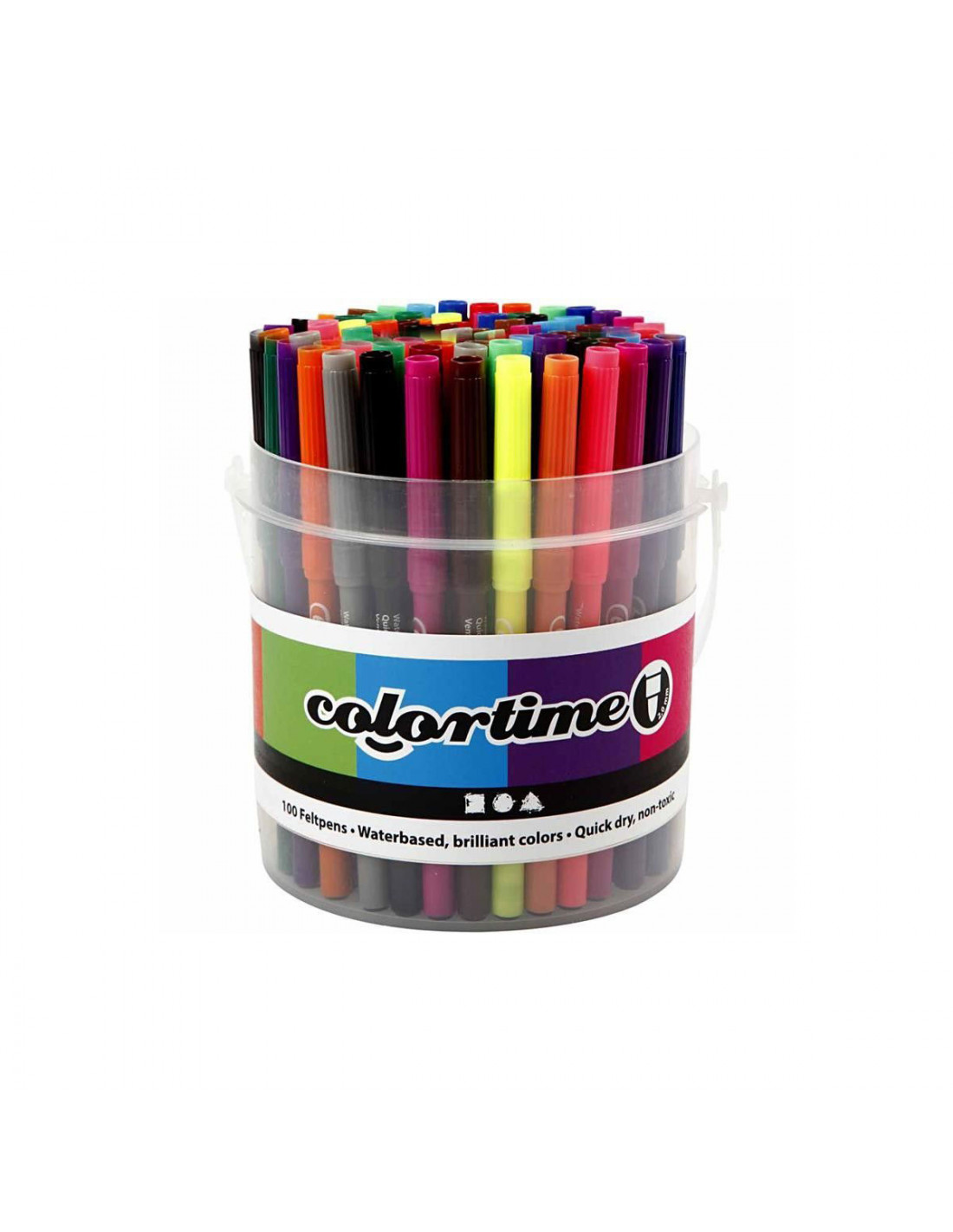 Stift op waterbasis in prachtige kleuren met sterke dekkracht, droogt snel en heeft een veiligheidsdop met ventilatie. Geleverd in een plastic emmer met 18 verschillende kleuren. Lijndikte: 2 mm.