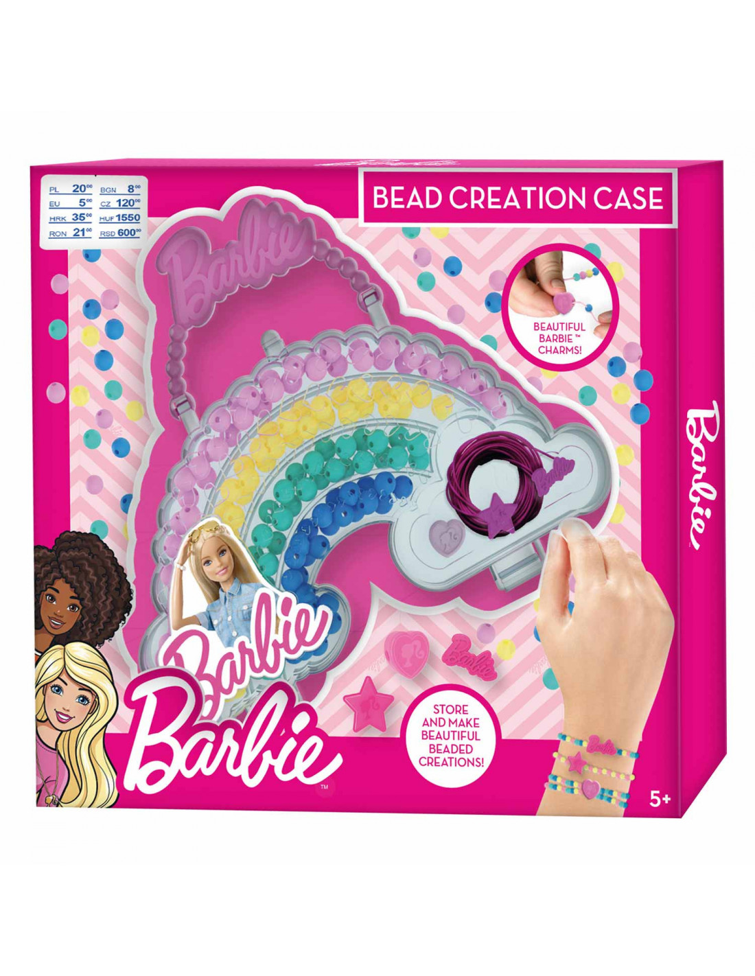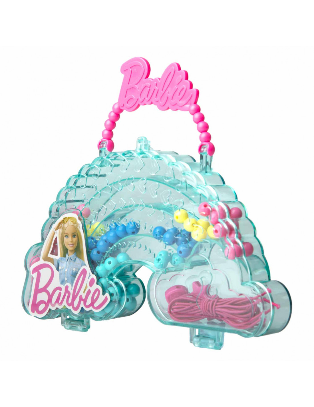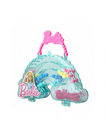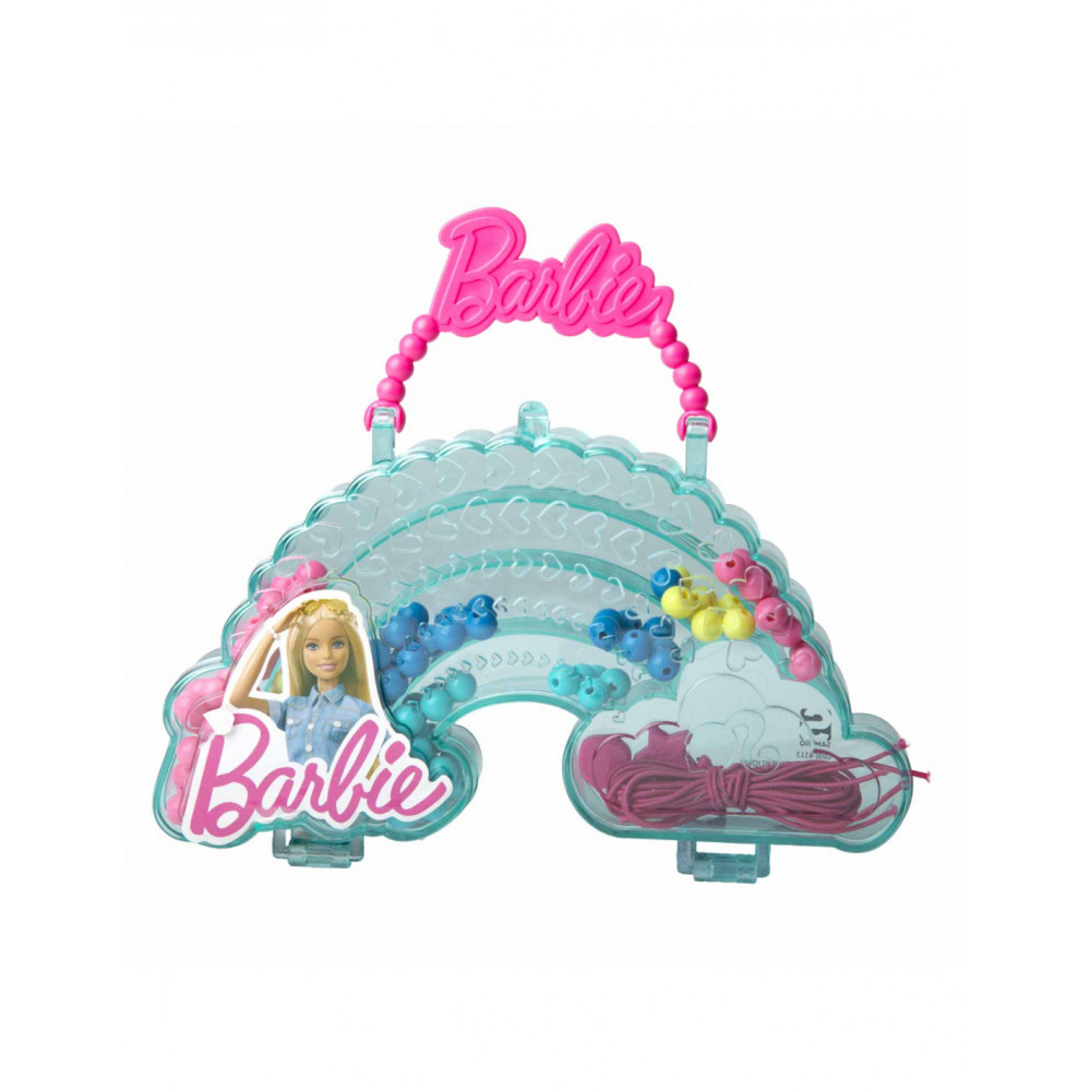 Barbie kralenset is kunststof opbergbox in de vorm van een regenboog. In de box zit draad, 3 Barbie-bedels en kralen in de kleuren roze, blauw, groen en geel. Met het roze handvat is de opbergbox makkelijk mee te nemen. Geschikt voor kinderen vanaf 5 jaar oud.