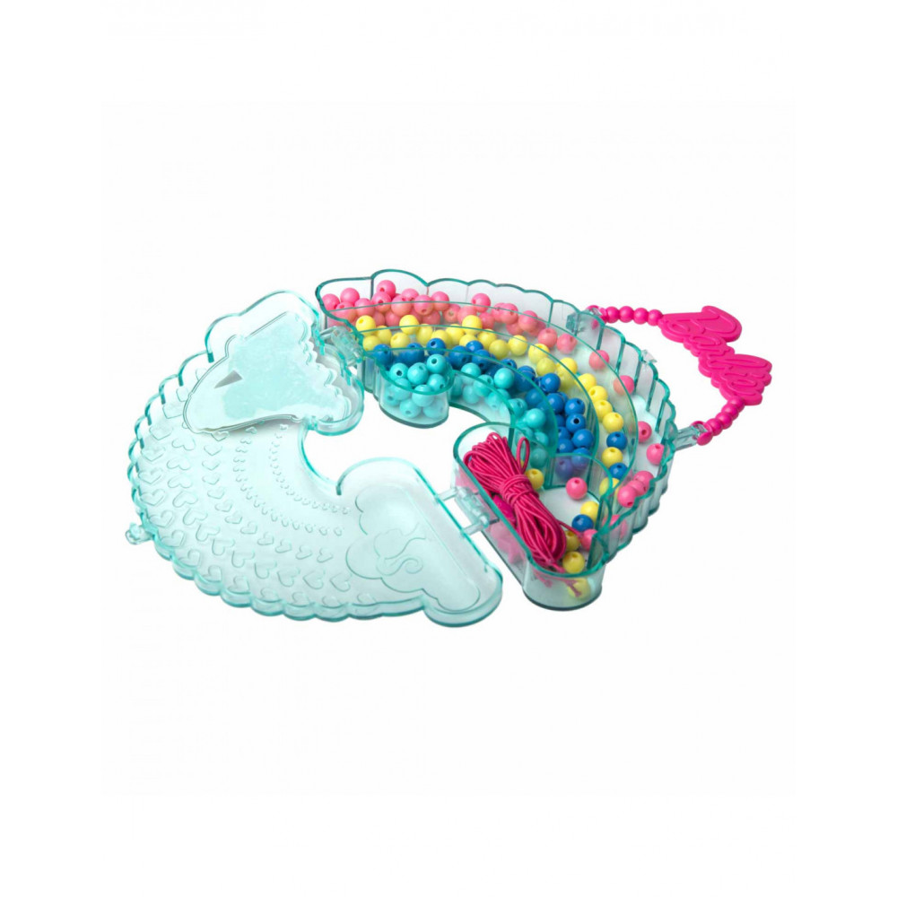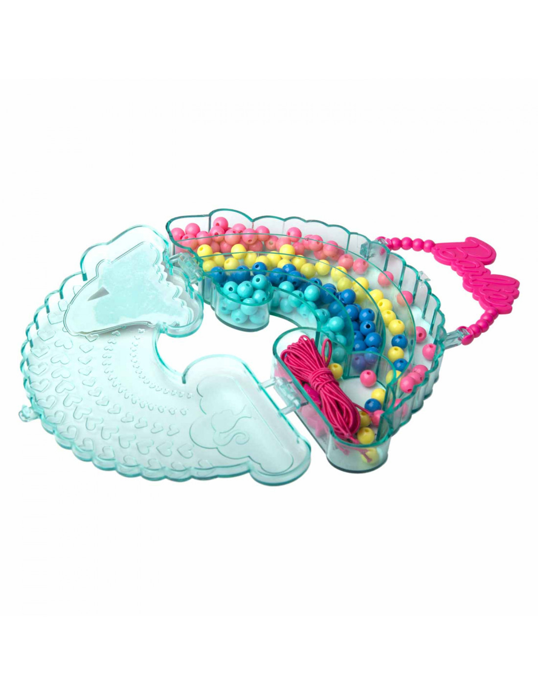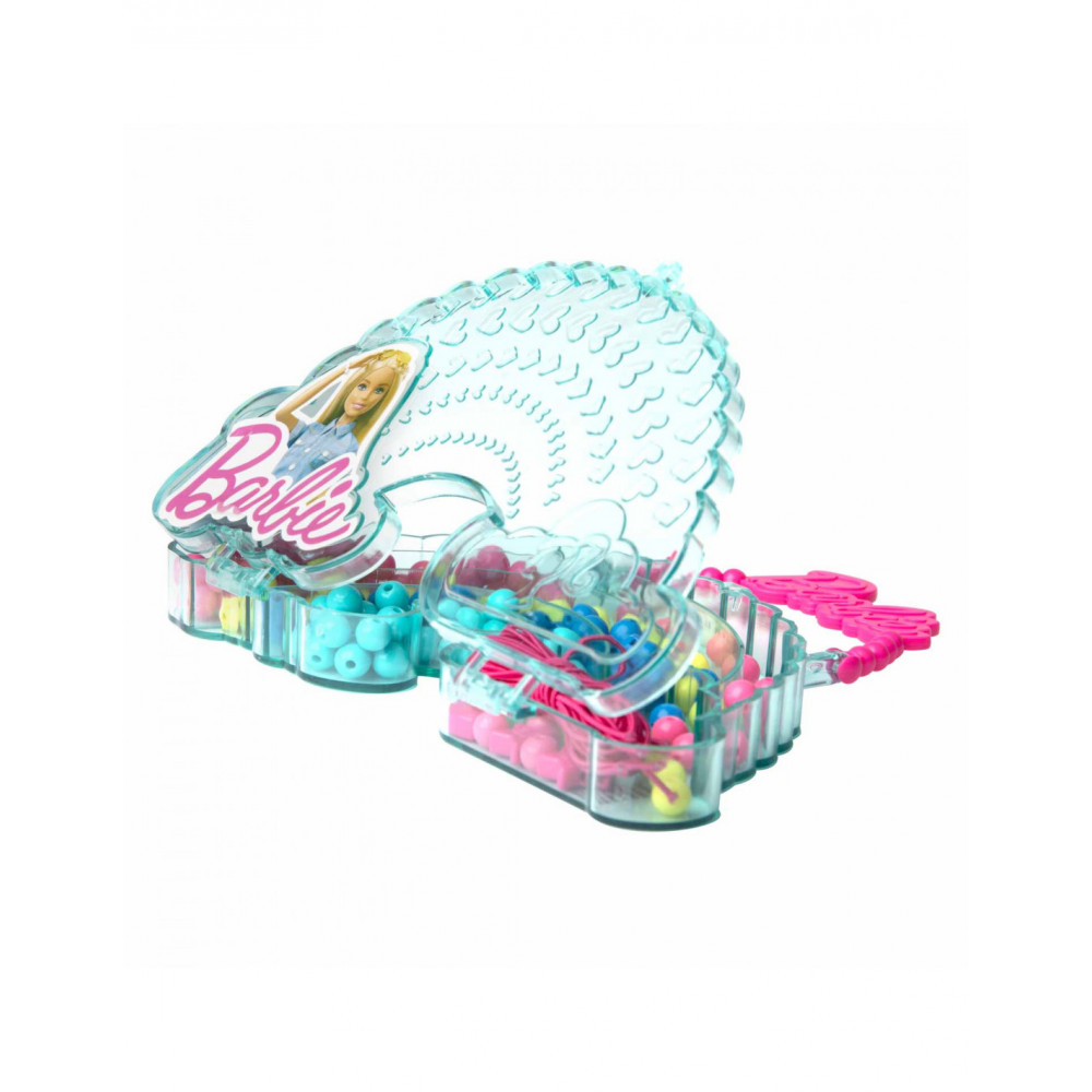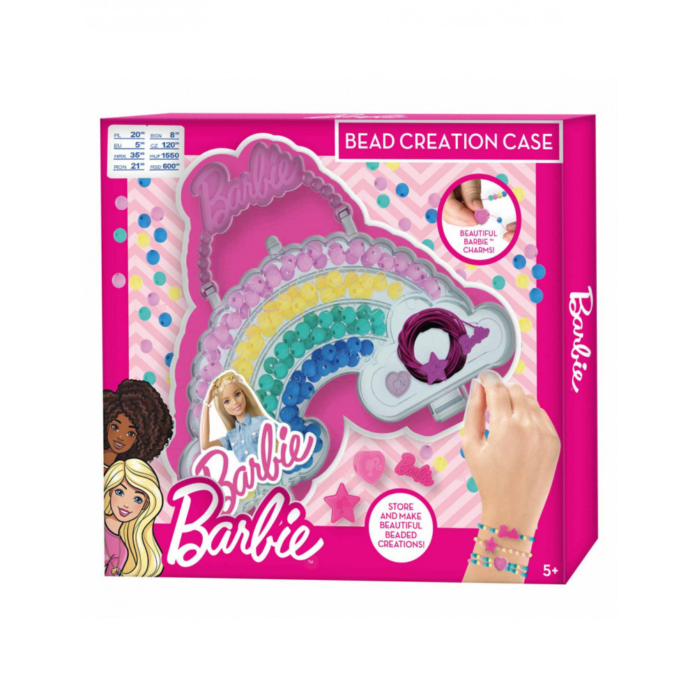 Barbie kralenset is kunststof opbergbox in de vorm van een regenboog. In de box zit draad, 3 Barbie-bedels en kralen in de kleuren roze, blauw, groen en geel. Met het roze handvat is de opbergbox makkelijk mee te nemen. Geschikt voor kinderen vanaf 5 jaar oud.