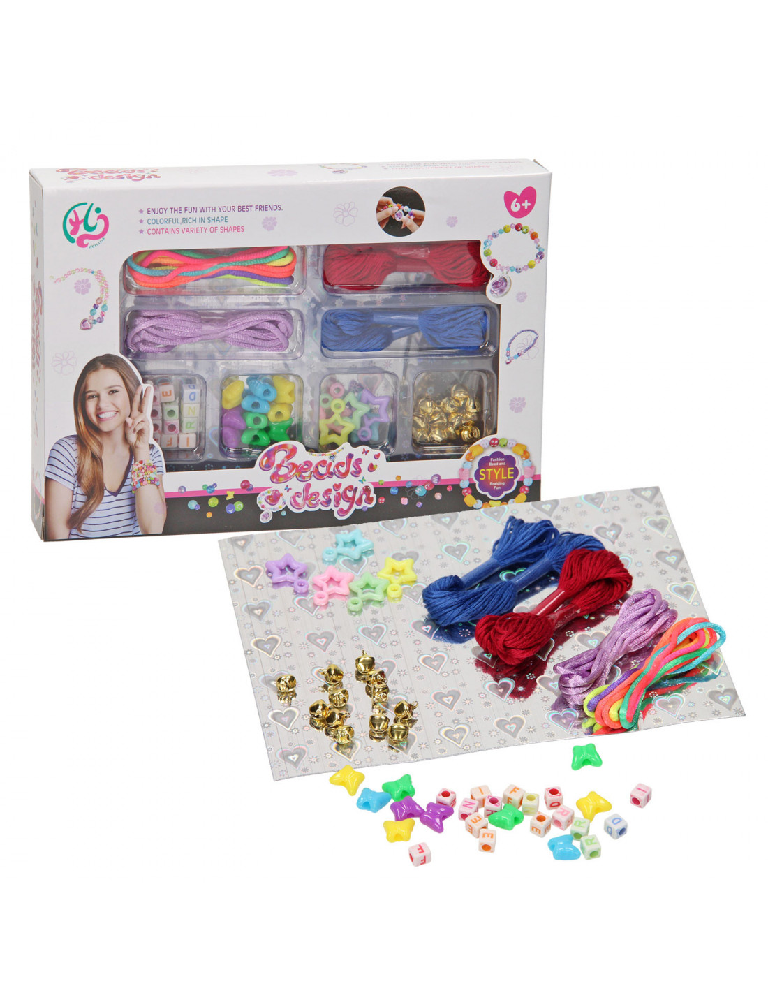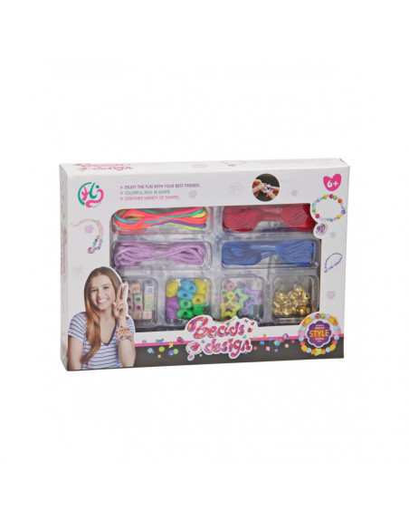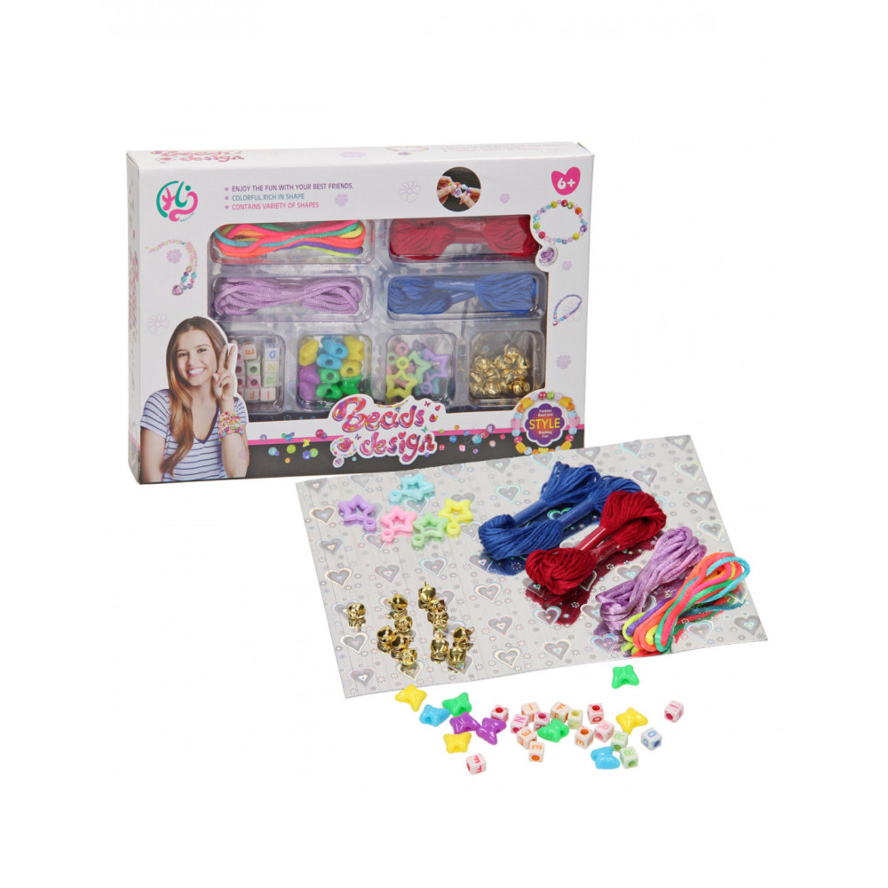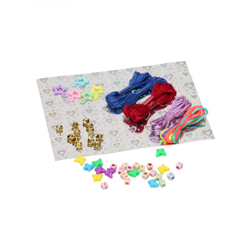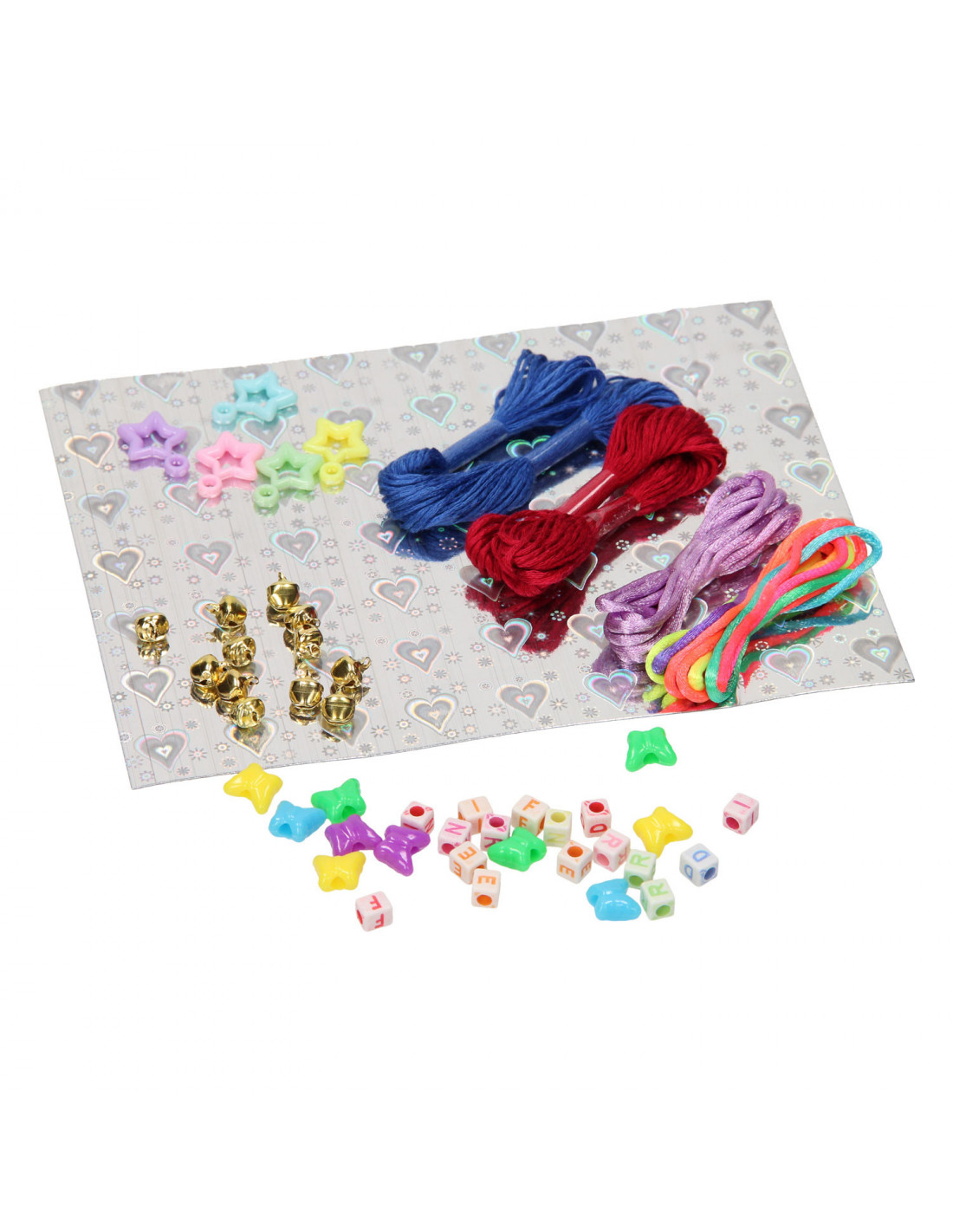 Met deze kleine sieradenset kunnen kinderen hun eigen creatieve sieraden maken, waaronder armbanden, kettingen, ringen of oorbellen. De set bevat een assortiment kunststof kralen en belletjes in diverse kleuren en vormen, samen met rijgdraad om de kralen aan elkaar te rijgen. Op de achterkant van de verpakking zijn instructies te vinden om kinderen te helpen bij het maken van hun sieraden.