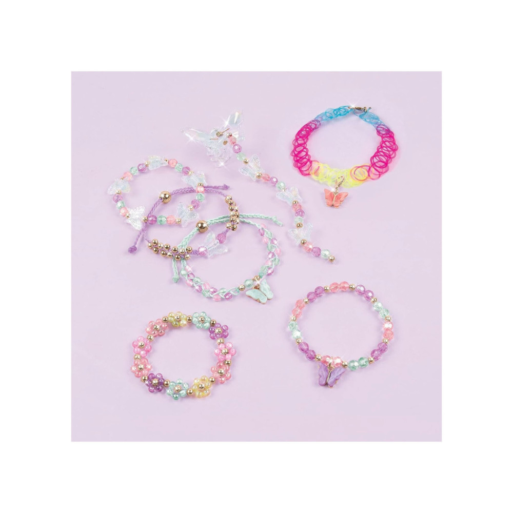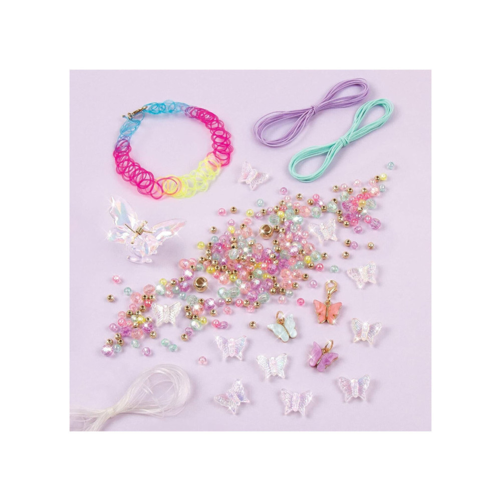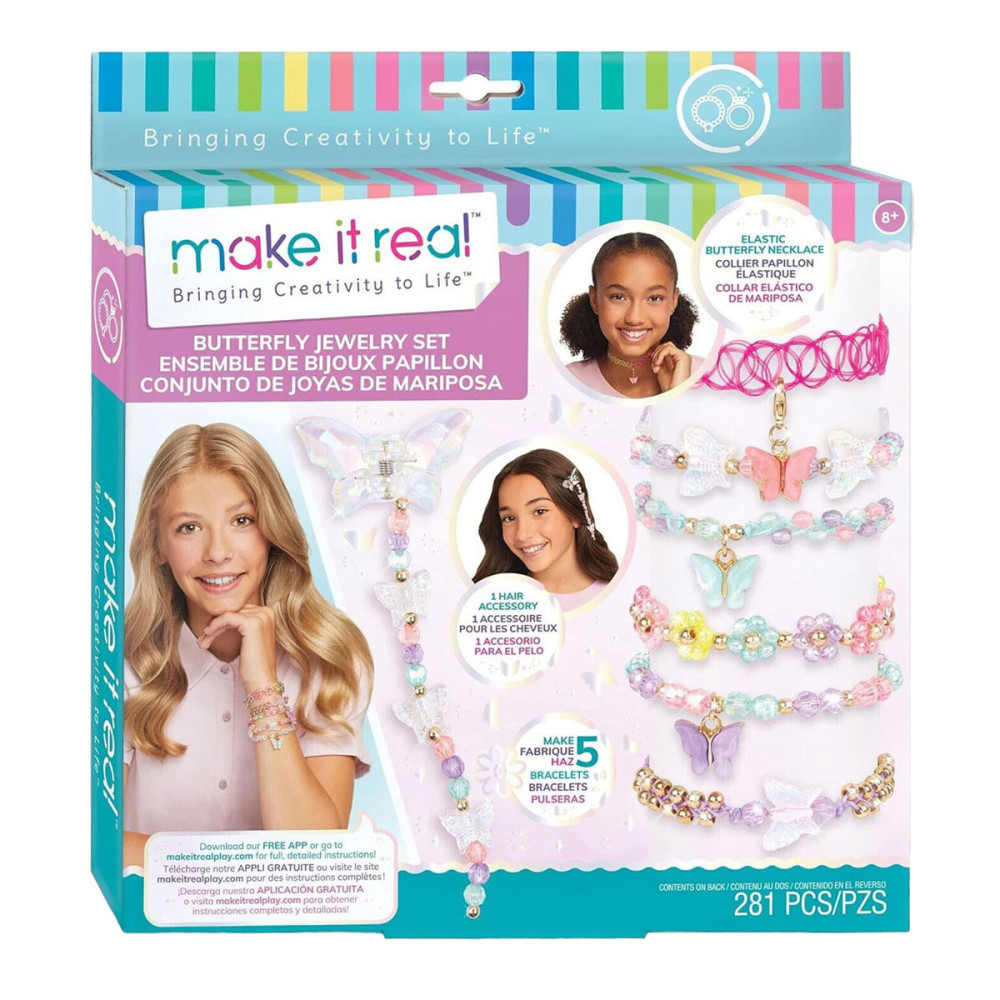 Laat je vleugels uitslaan met deze vlinder sieradenset! Dit doe-het-zelf sieradenpakket begeleidt jonge kinderen en tweens om hun eigen modieuze sieraden en haaraccessoires te ontwerpen en te creëren met geweldige vlinderbedels, gekleurde kralen en koord. ALLES INBEGREPEN. Dit sieradenpakket heeft alles wat je kind nodig heeft om tot 5 opvallende bedelarmbanden, een choker ketting en een haarklem te maken. Het bevat nylon koord, meer dan 270 verschillende kralen, een haarklem in vlindervorm, een elastische choker met karabijnsluiting, bedels en meer! GEWELDIG CADEAU-IDEE. De ontwikkelingsspeelgoed van Make It Real zijn geweldige cadeaus voor kinderen en tweens, waardoor ze vaardigheden ontwikkelen die hen zullen helpen succesvol te zijn als de toekomstige leiders en makers van morgen. Dit doe-het-zelf vlinder sieradenpakket biedt een leuke en creatieve activiteit PERFECT VOOR KINDEREN VANAF 8 JAAR.