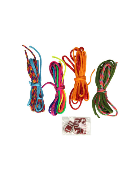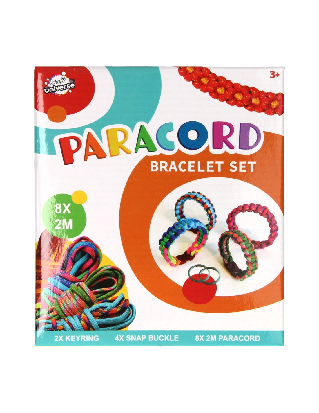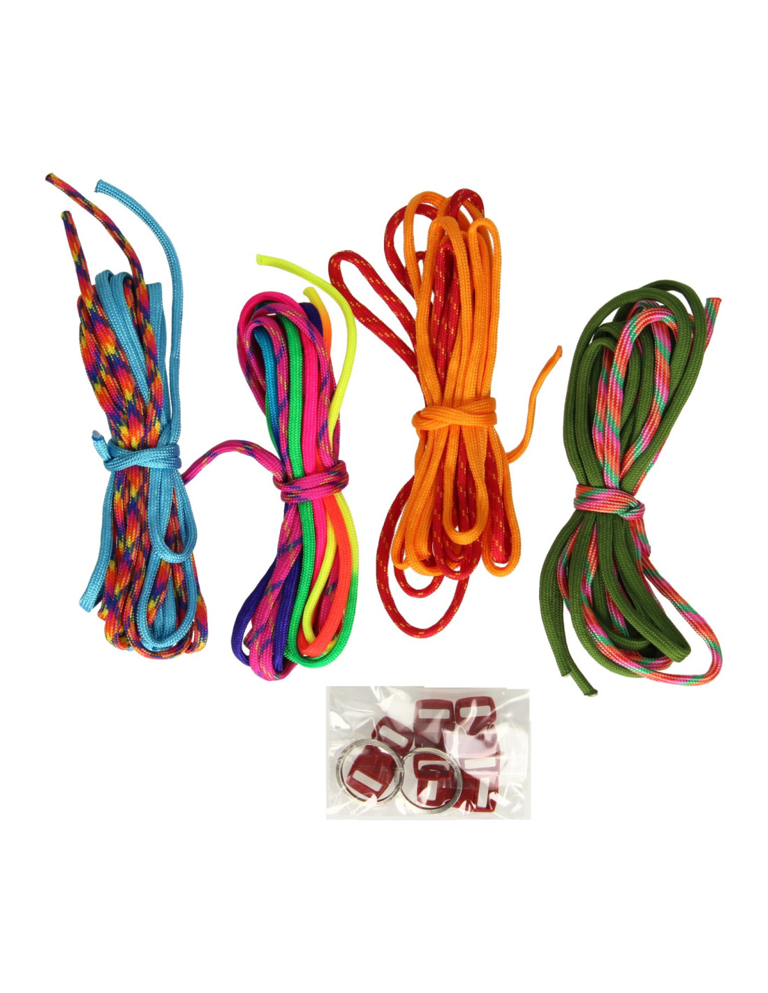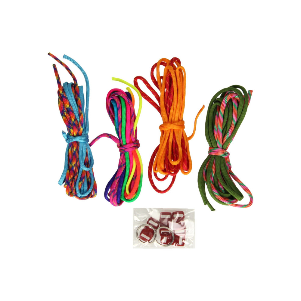 DIY knutselset voor het maken van paracord armbanden. Inhoud: 16 meter touw, 2x sleutelhangers en 4 sluitingen. Geschikt vanaf 3 jaar.