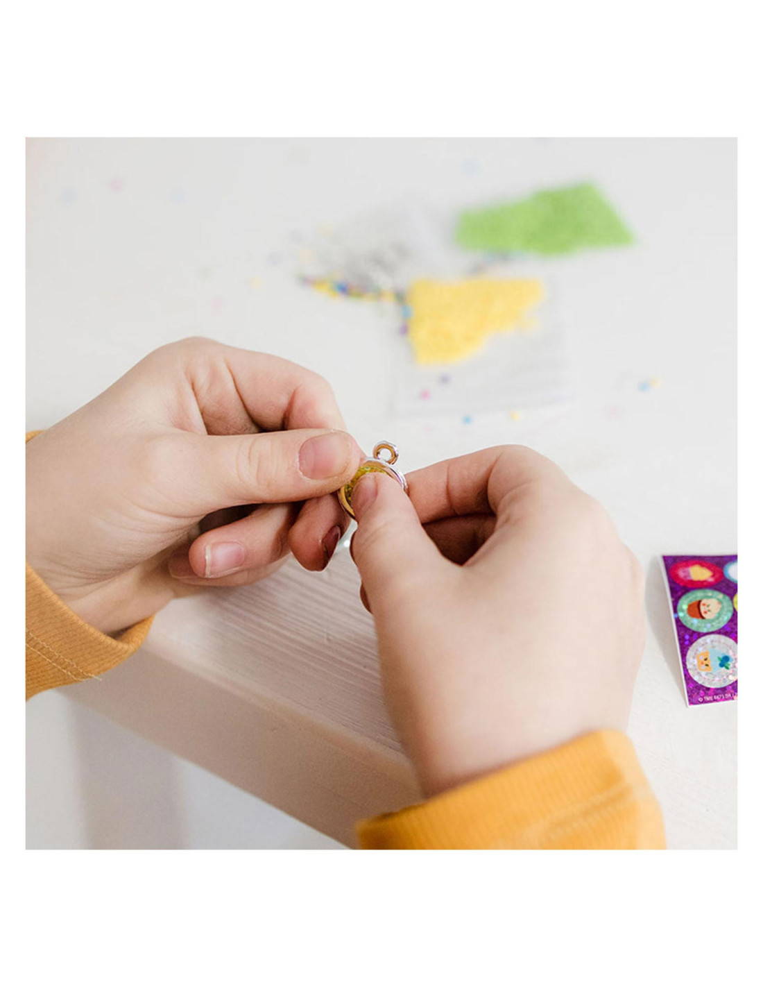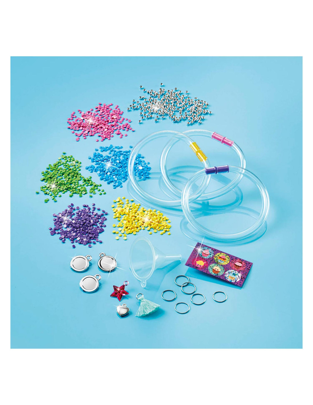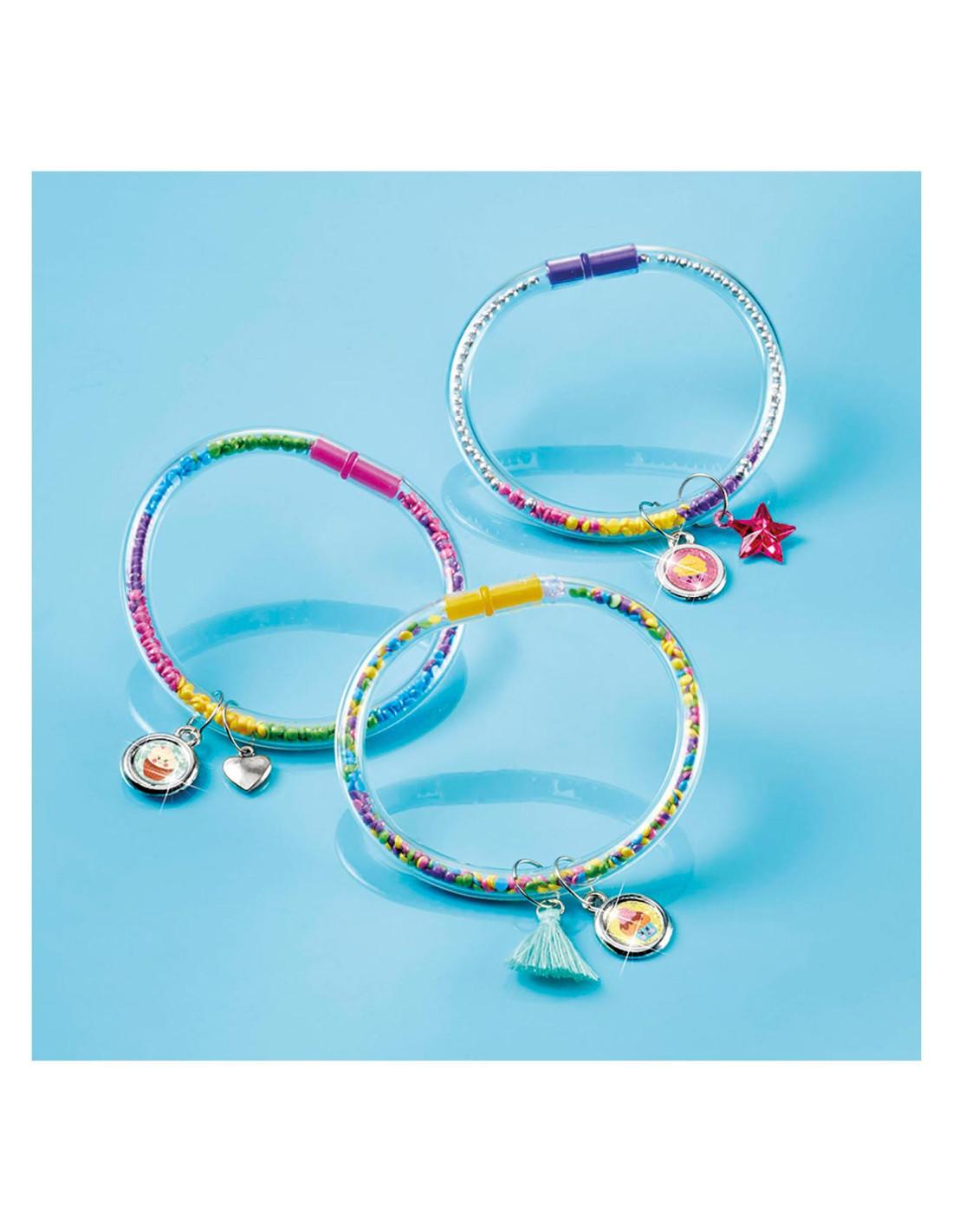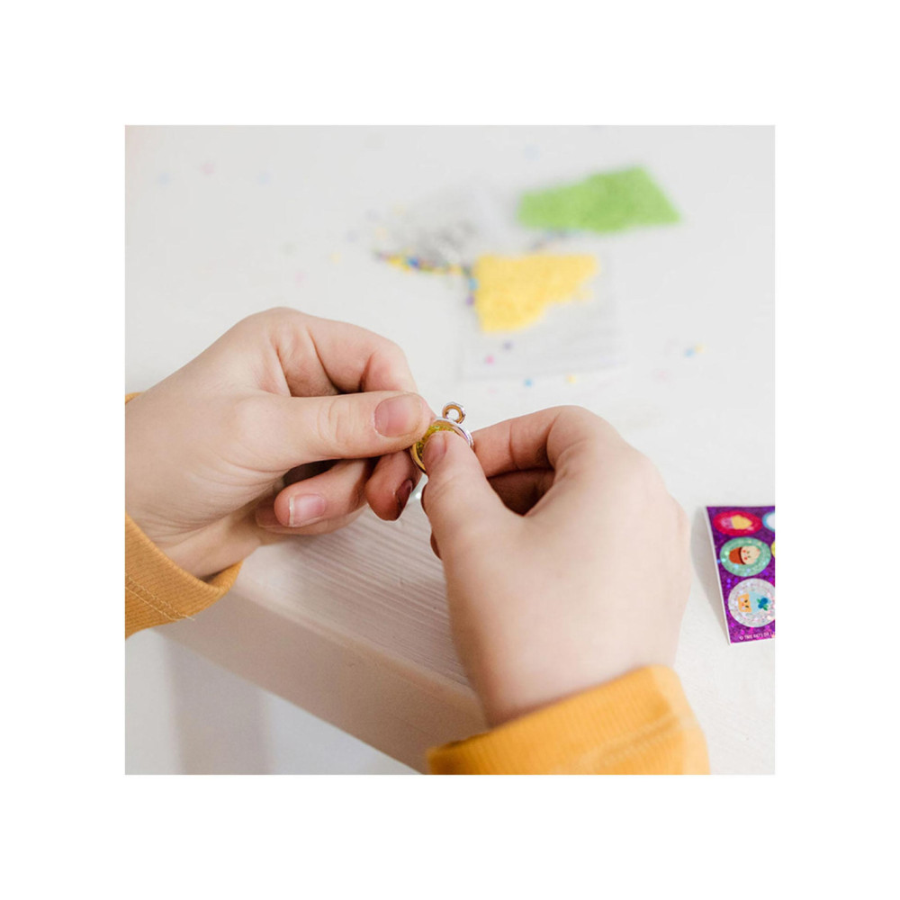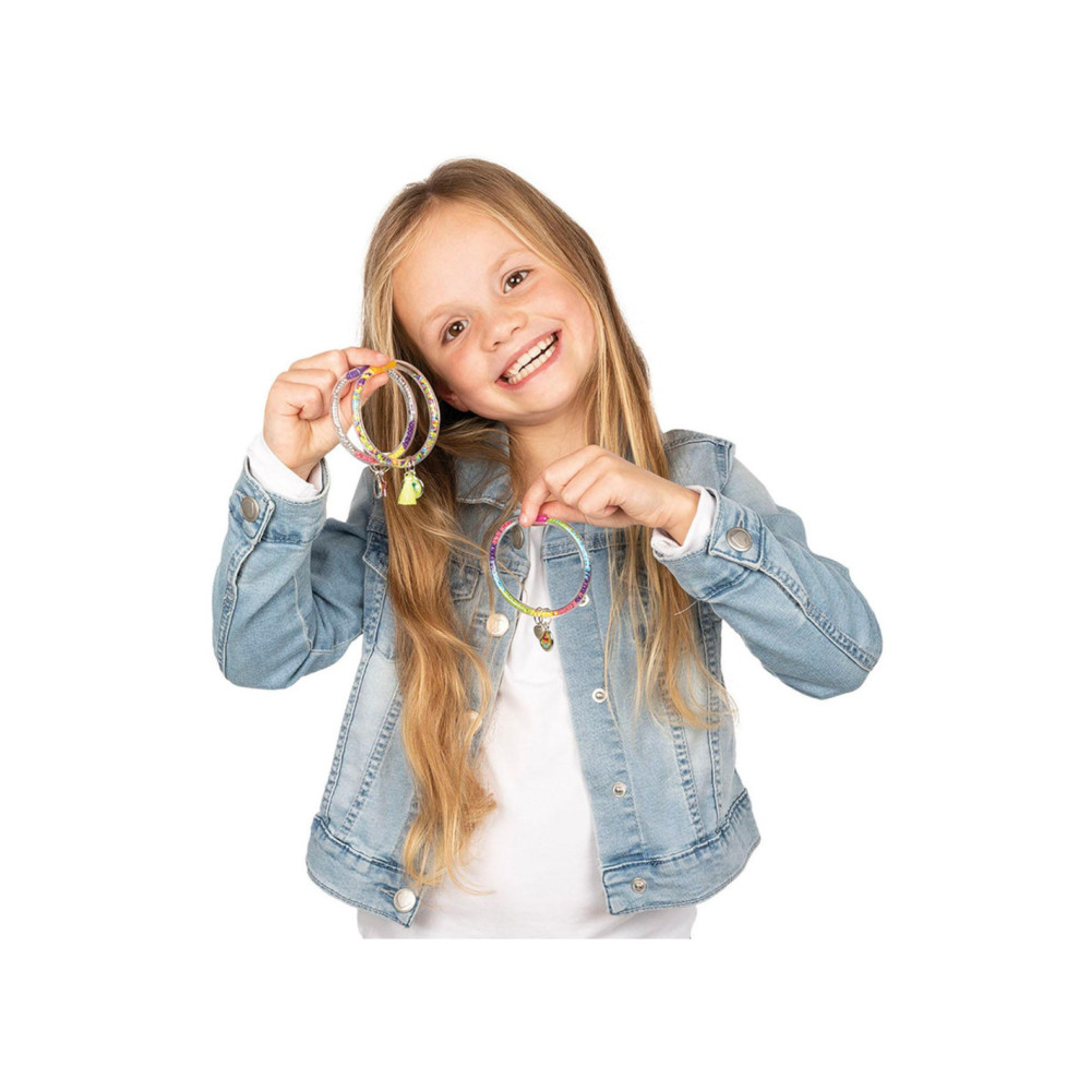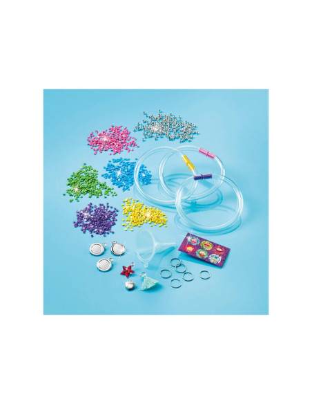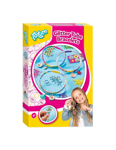 Maak prachtige armbanden met de Totum glitter tubes knutselset. Stop de gekleurde glitters in een armband en maak de armband af met een bedel. Inhoud: 4 kleuren glitter, 6 bedels, 6 kleine ringetjes, 3 armbanden, trechter en stickers.