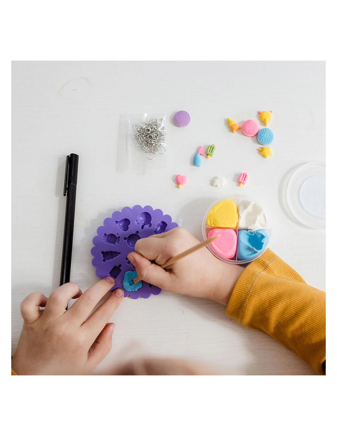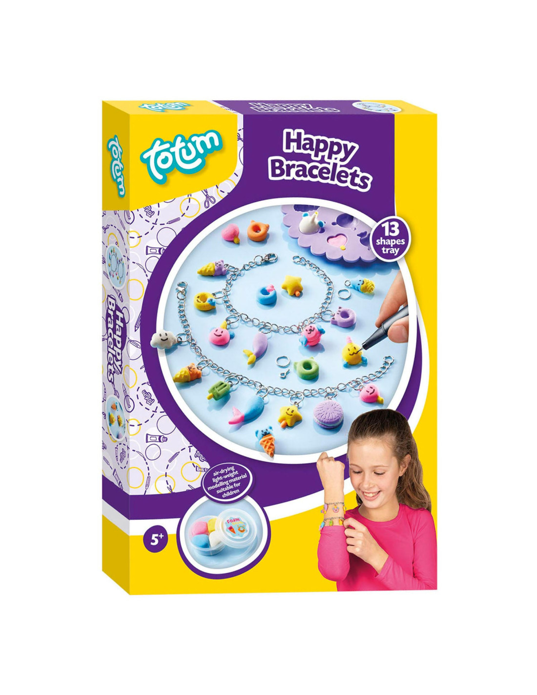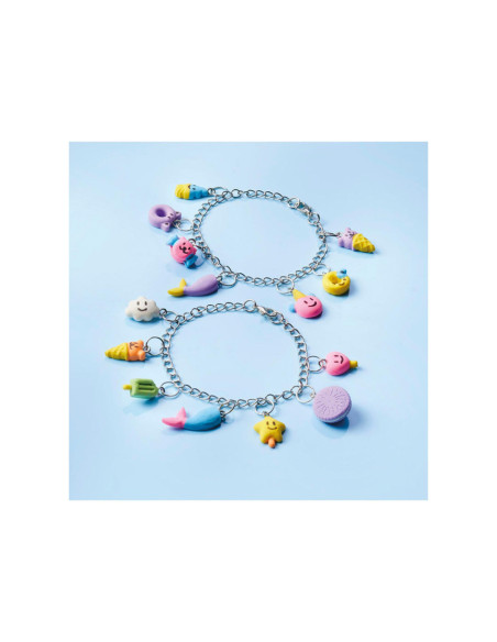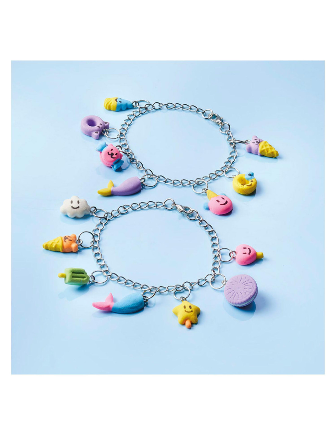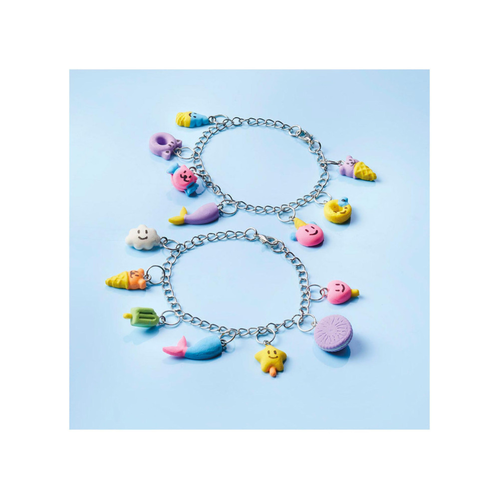 Knutselset voor het maken van je eigen armbandjes. Maak zelf bedels in vrolijke vormpjes van klei en versier ze met de meegeleverde pen. Geschikt vanaf 5 jaar.