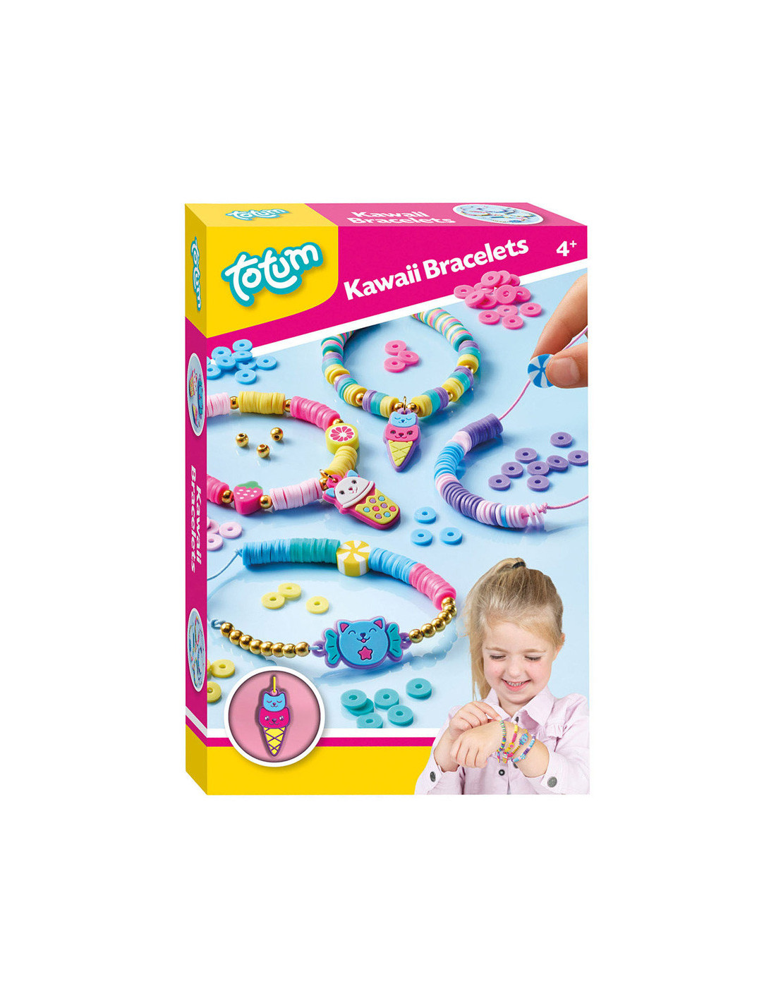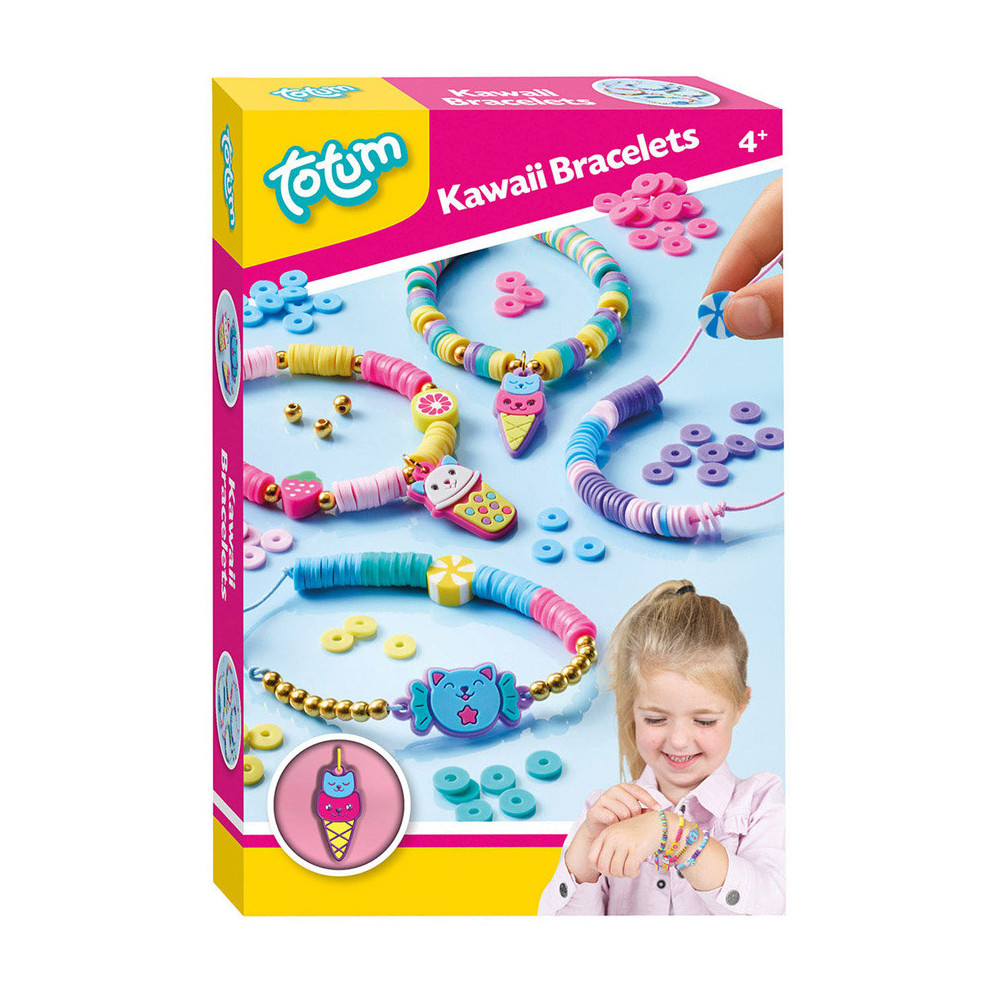 Totum knutselset voor het maken van 4 kawaii-armbanden. Met 6 kleuren platte kraaltjes, gouden kraaltjes, fruitkralen en 3 kawaii-hangers. Geschikt voor kinderen vanaf 4 jaar.
