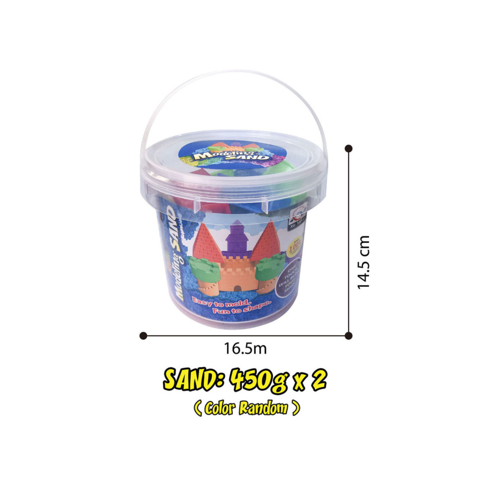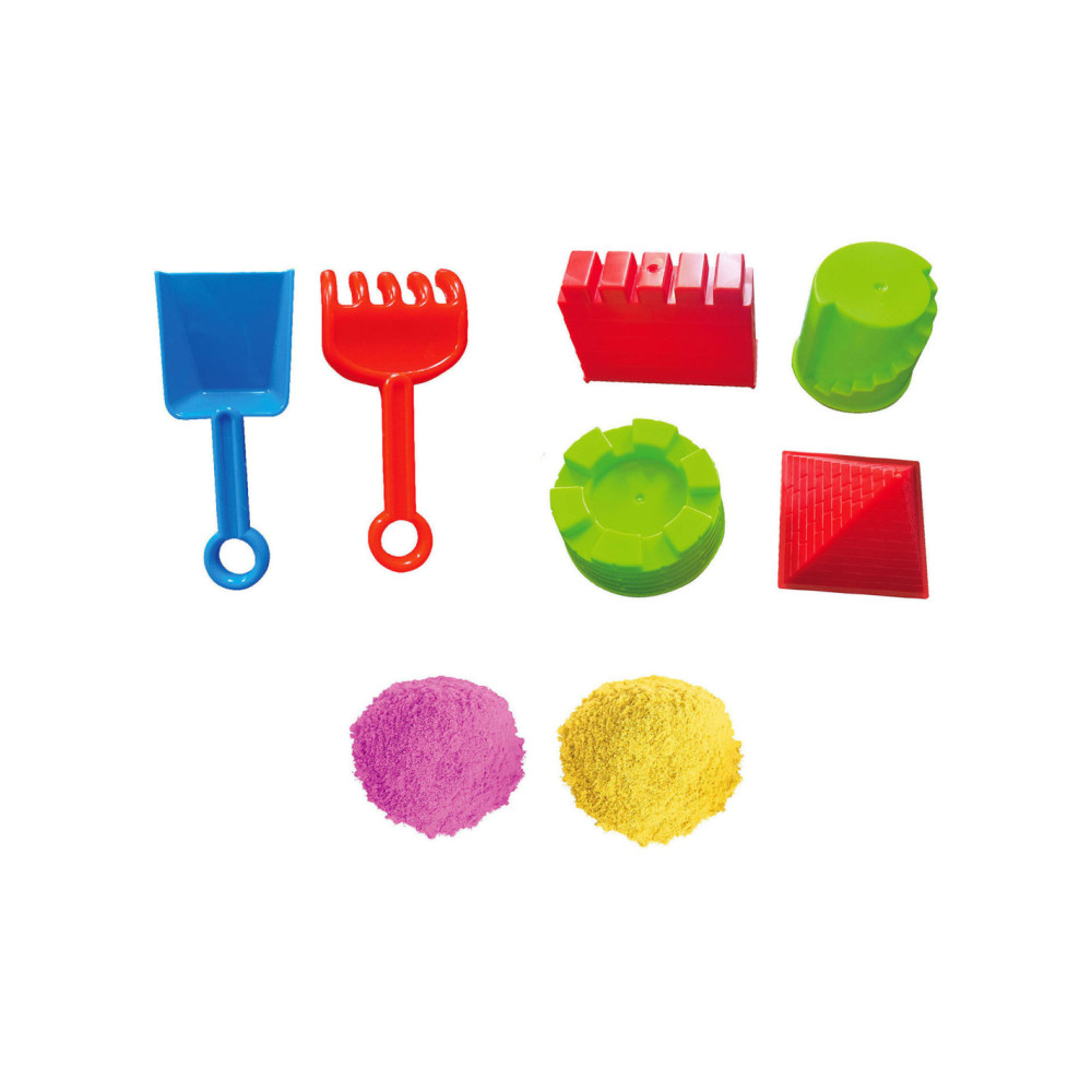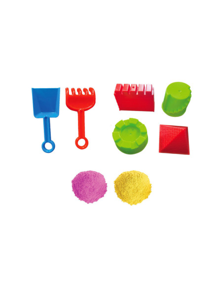 Speelset met 900 gram gekleurd binnenspeelzand (2x 450 gram, willekeurige kleuren), 2 stukken gereedschap en 4 zandvormen. Afmetingen opbergemmer: 16,5 x 14,5 centimeter. Geschikt voor kinderen vanaf 3 jaar oud.