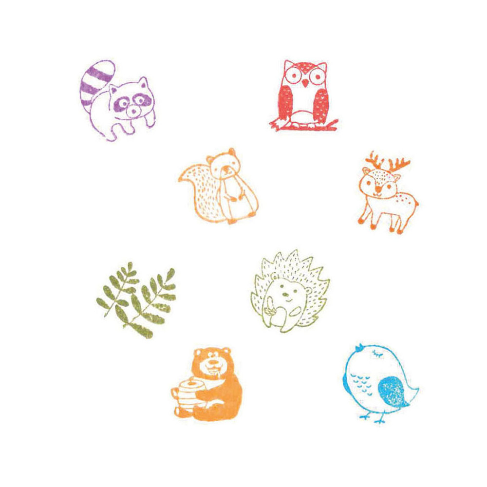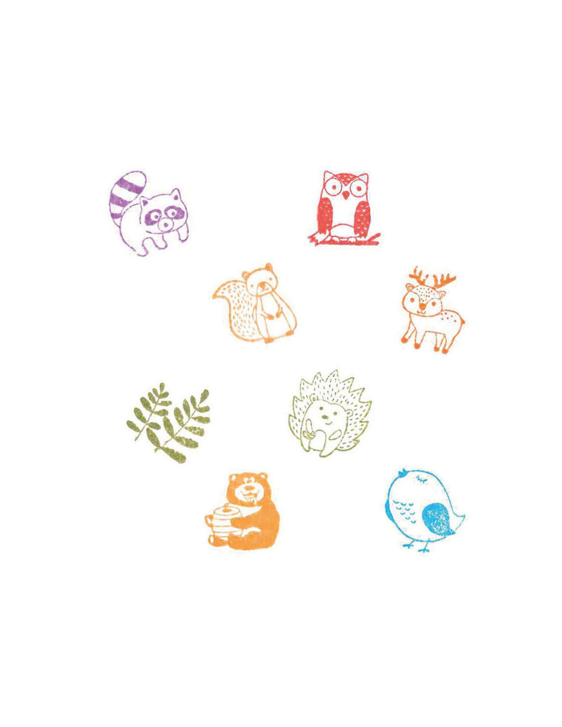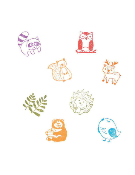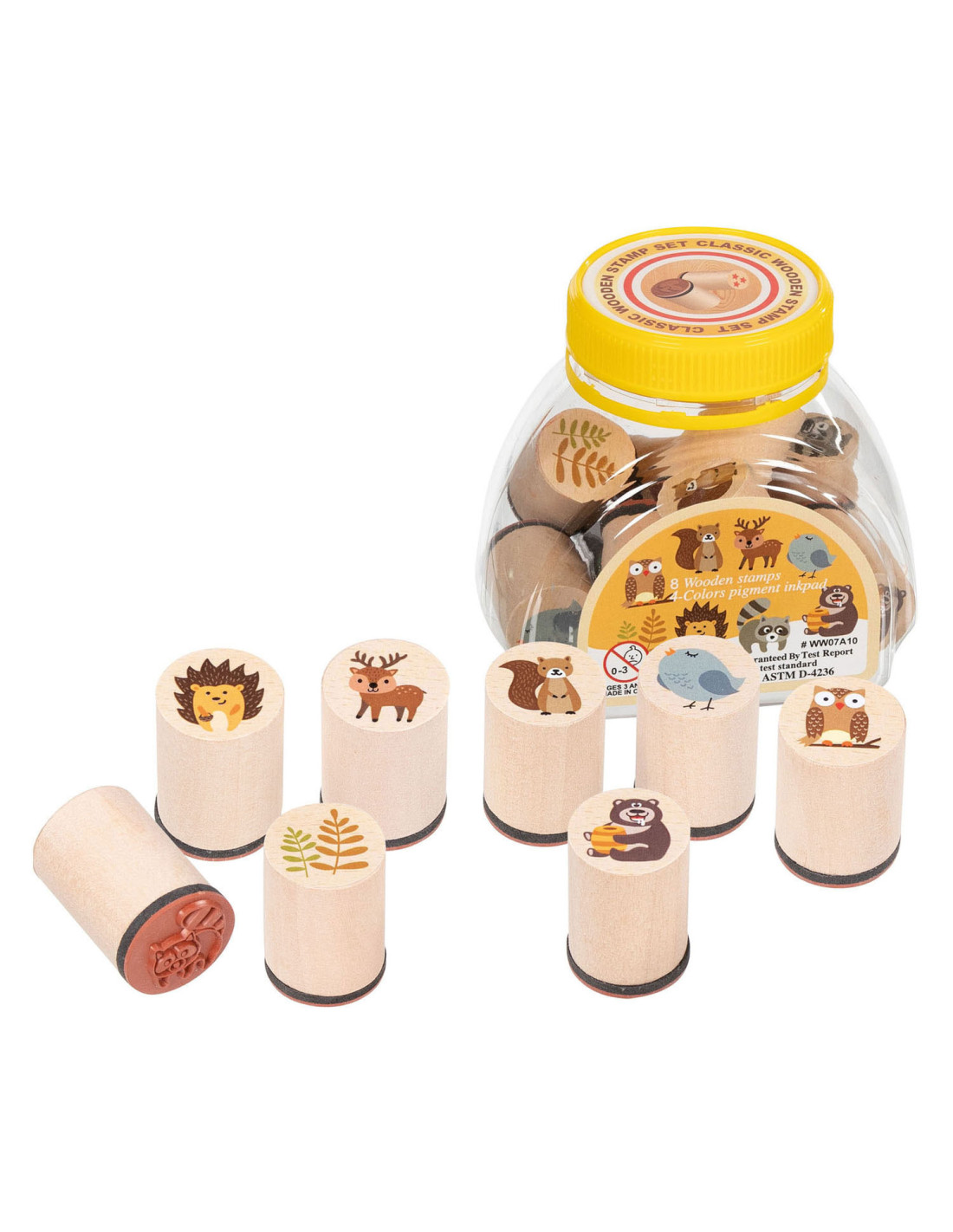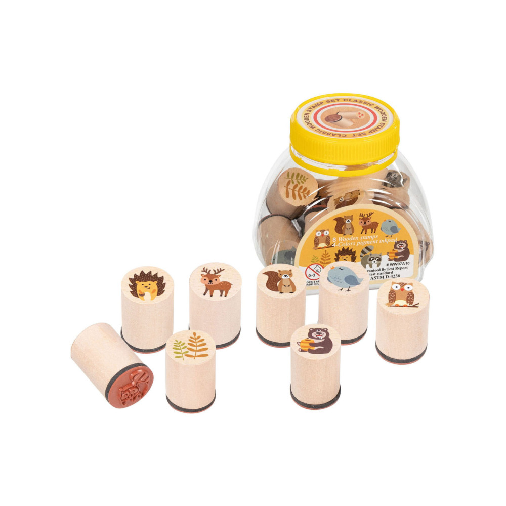 Set Houten Bosdierenstempels (8 stuks) incl. Stempelkussen met 4 kleuren inkt. Geschikt vanaf 3 jaar.
