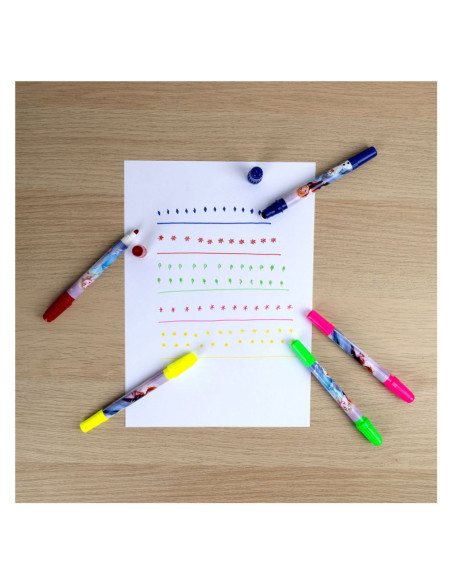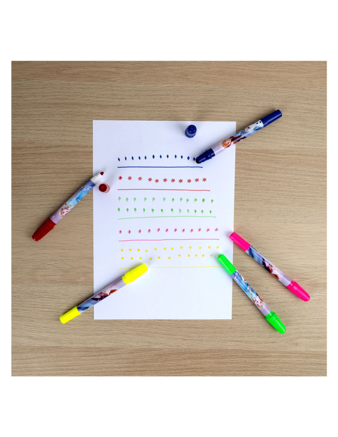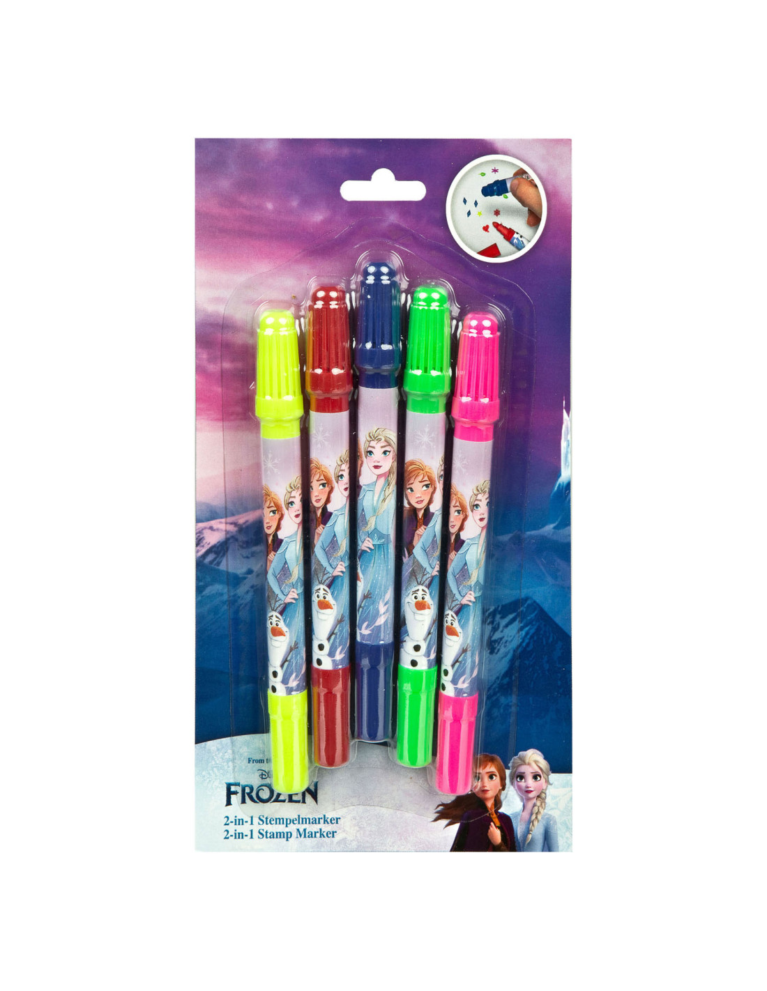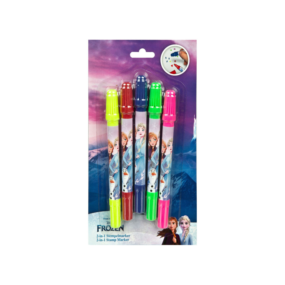 Set van vijf 2in1 stempelstiften van Frozen, met aan de ene kant een stiftpunt en aan de andere kant een stempel. Inhoud: 1x roze, 1x groen, 1x blauw, 1x rood en 1x geel. Geschikt vanaf 3 jaar.