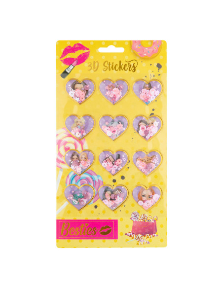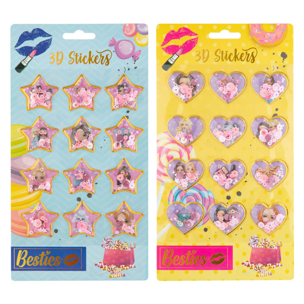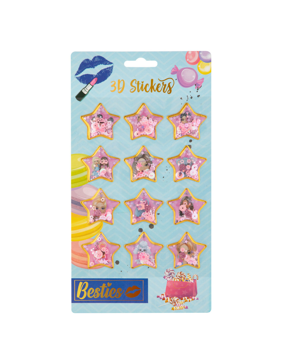 Stickervel met 12 ster- of hartvormige 3D-stickers van Besties. In de stickers 'drijven' kleurrijke pailleten voor een mooi glinstereffect. Niet geschikt voor kinderen jonger dan 3 jaar.