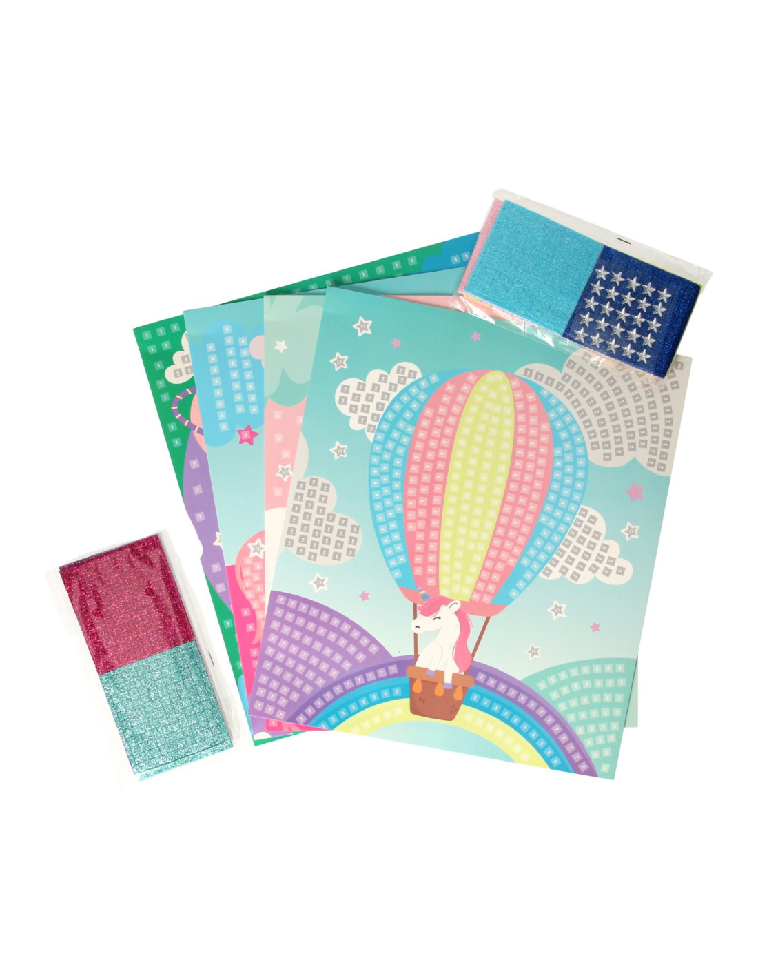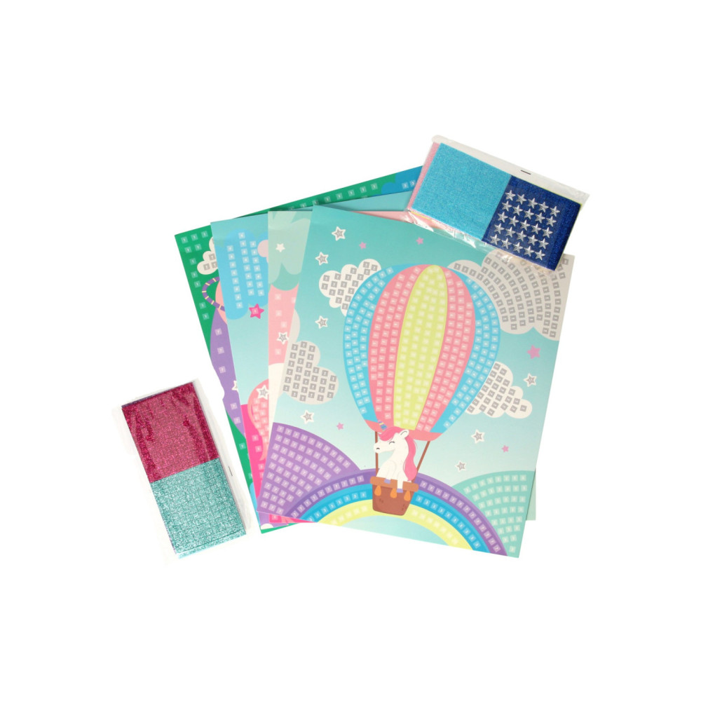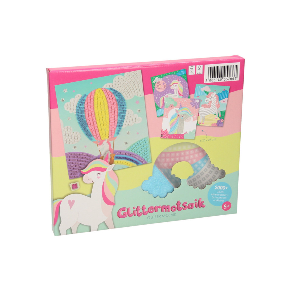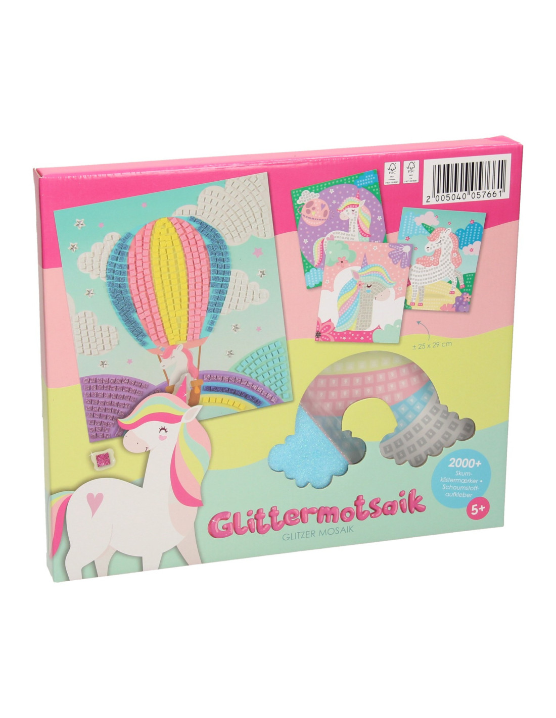 Mozaïek knutselset met 4 eenhoornafbeeldingen en meer dan 2000 glinsterende mozaïekstickertjes. Geschikt voor kinderen vanaf 5 jaar oud.