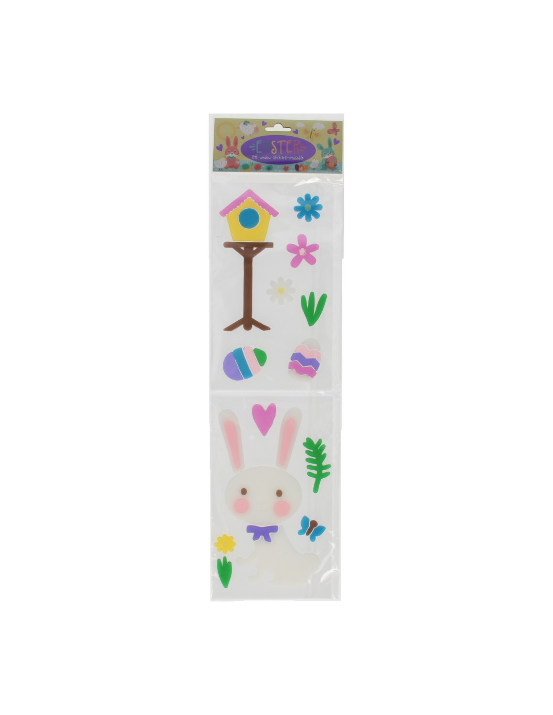 Set raamstickers van gel in leuke paas-/lentevormen, waaronder een paasei, konijn en vogelhuisje. Geschikt voor kinderen van 3 jaar en ouder.