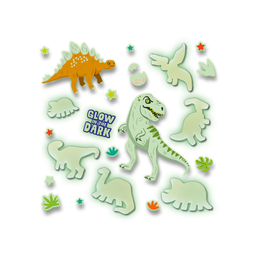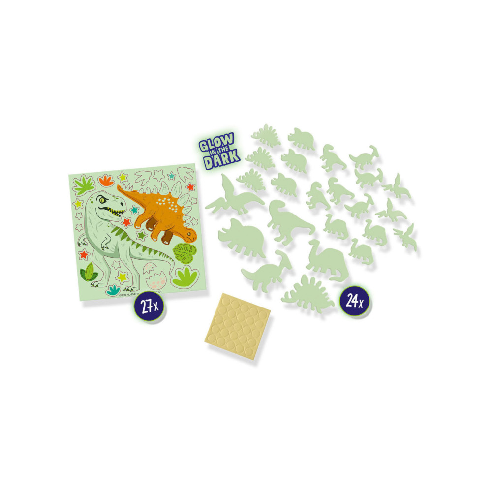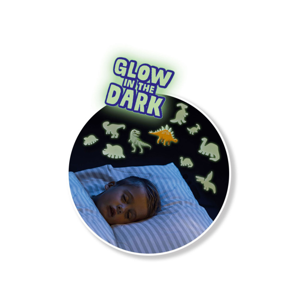 Met deze Glowing Dino’s tover jij jouw slaapkamer om tot een heus verlicht dinopark. Combineer jouw favoriete dino’s met elkaar en wacht tot het donker is om alle dino’s te zien oplichten. Deze set bestaat uit 24 dino stickers en dubbelzijdige foam plakkers die je kunt bevestigen aan de muur. Door het speciale Glow in the Dark effect komt jouw slaapkamer tot leven!
