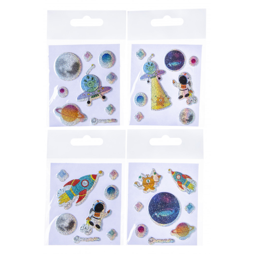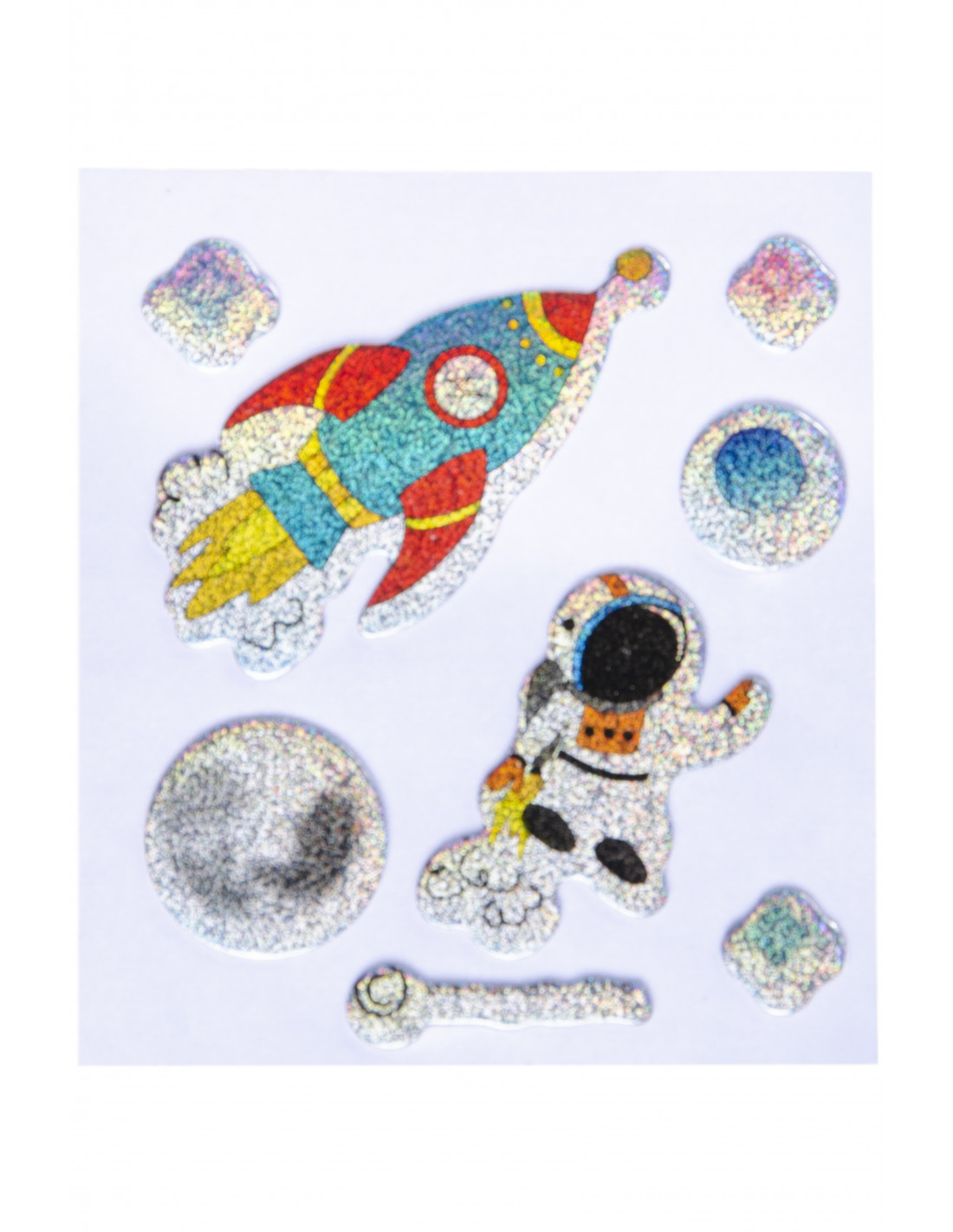 Bent u op zoek naar een manier om uw persoonlijke bezittingen een ruimtelijk tintje te geven? Dan is dit setje van glinsterende ruimtevaartstickers op een klein vel perfect voor u! Met maar liefst 100 vellen met verschillende ontwerpen, zult u zeker iets vinden wat u aanspreekt. Op deze vellen vindt u onder andere afbeeldingen van raketten, ruimtevaarders en planeten.