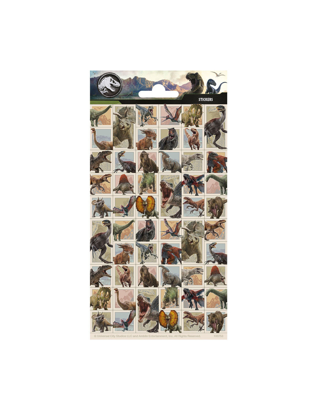 Stickervel met 54 vierkante en langwerpige stickers van dinosauriers uit Jurassic World. De stickers zijn 1,5 x 1,5 en 1,5 x 3 centimeter groot en geschikt voor kinderen van 3 jaar en ouder.