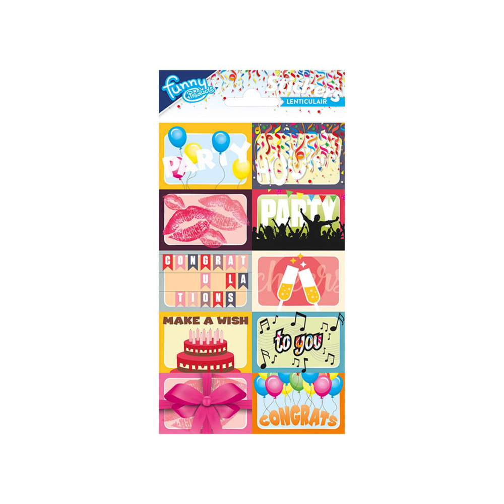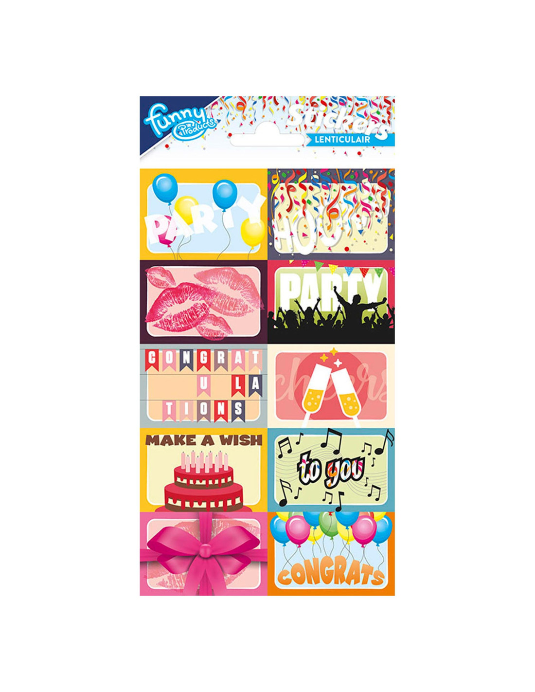 Versier je cadeautjes, kaartjes of knutselwerkjes met deze vrolijke feeststickers! Er zitten 10 stickers op het vel met o.a. ballonnen, slingers en verjaardagszoenen. Het stickervel is 20 x 10 centimeter groot en geschikt voor kinderen vanaf 4 jaar oud.