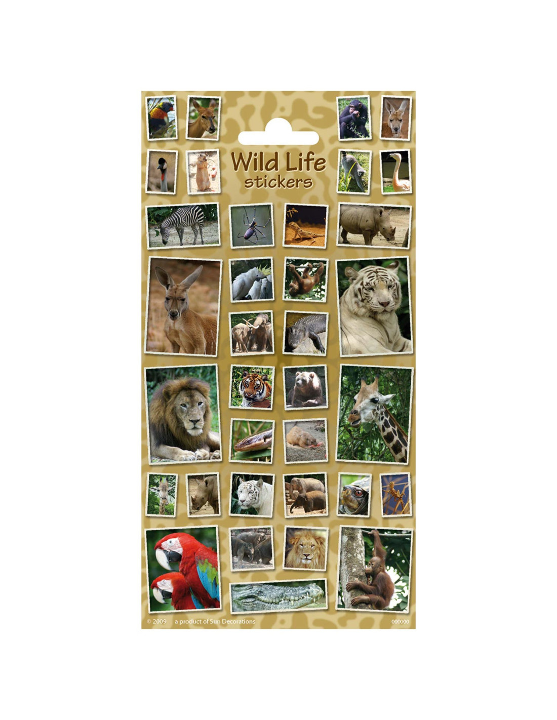 Stickervel met 35 stickers met levensechte afbeeldingen van een zebra, een leeuw en andere wilde dieren.