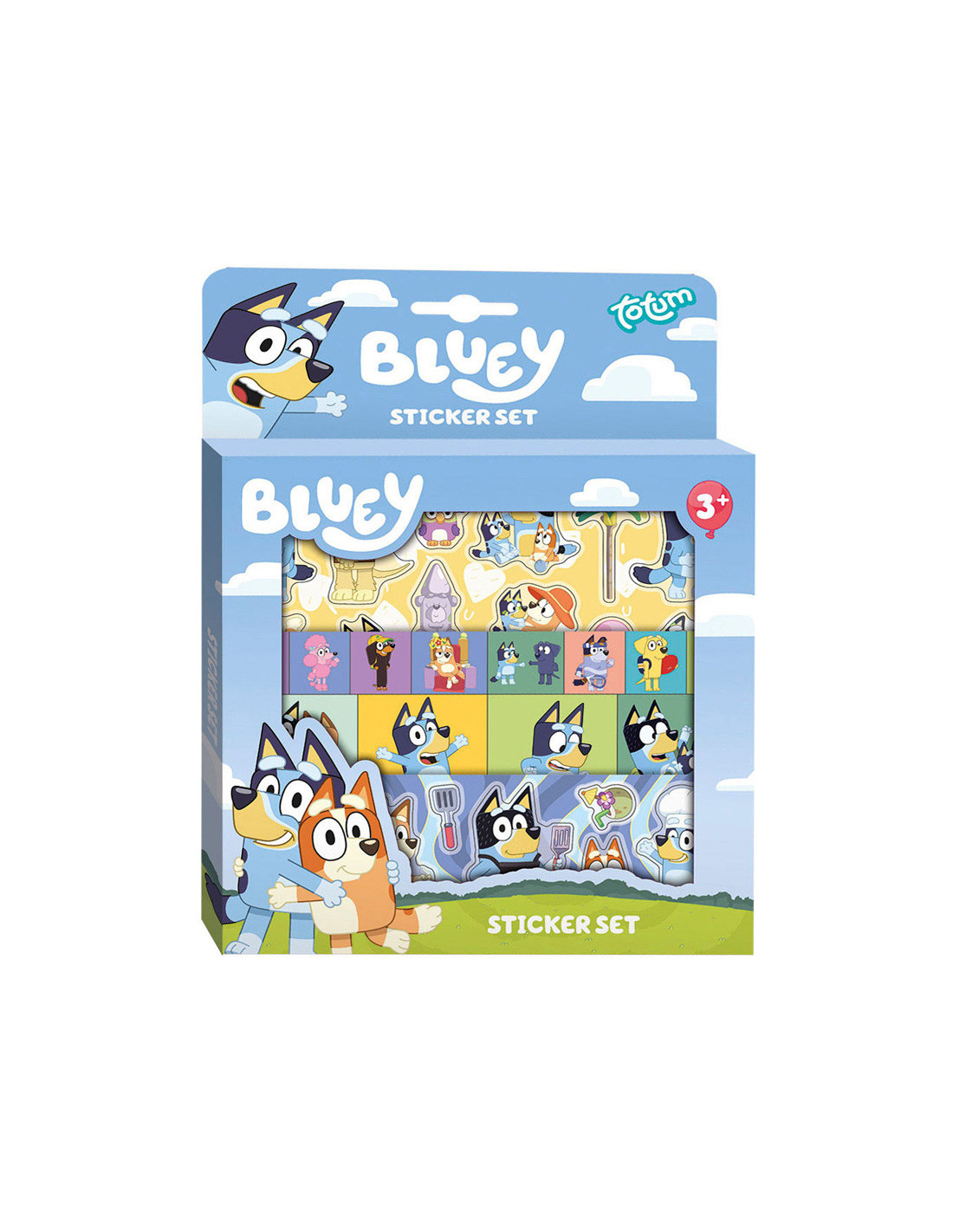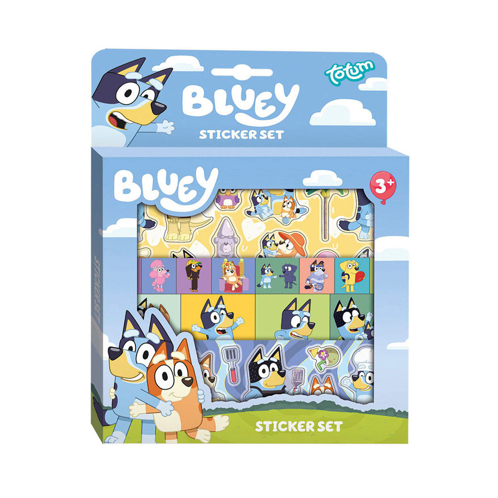 Bluey stickerset met diverse stickervellen en een plakachtergrond op het doosje. Geschikt voor kinderen vanaf 3 jaar oud.