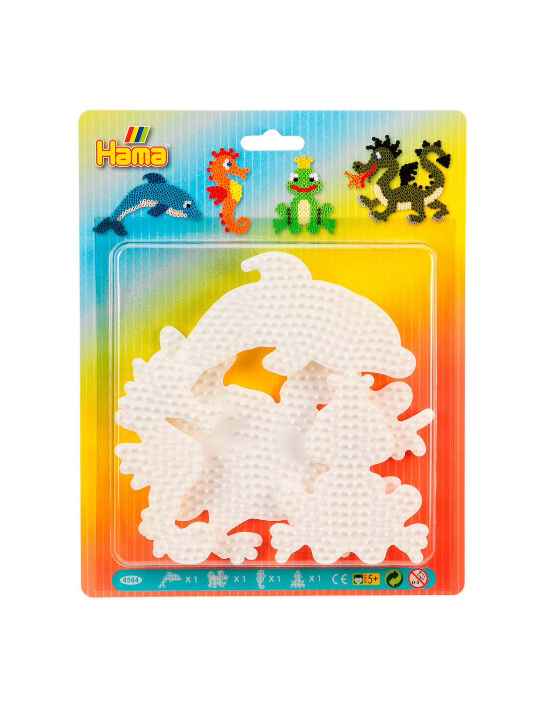 Hama strijkkralenbordje in de vorm van een dolfijn, draak, paard en een kikker. Exclusief strijkkralen.
