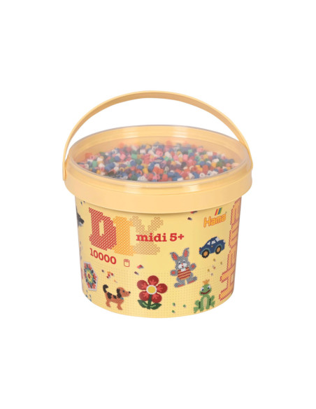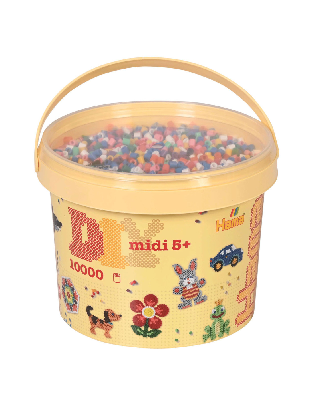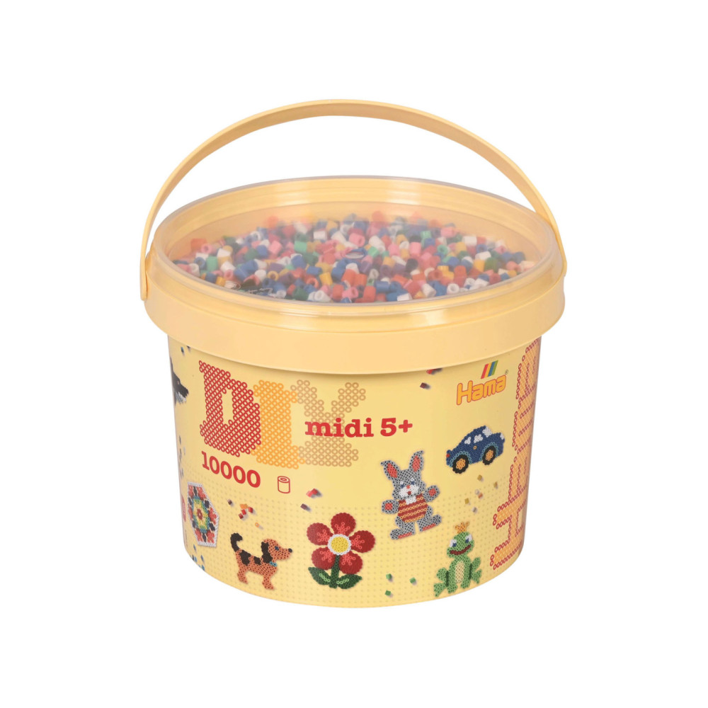 Emmer met 10.000 Hama Midi strijkkralen in verschillende kleuren (No. 01, 03, 04, 05, 06, 07, 09, 10, 11, 18). Geschikt voor kinderen vanaf 5 jaar oud,.