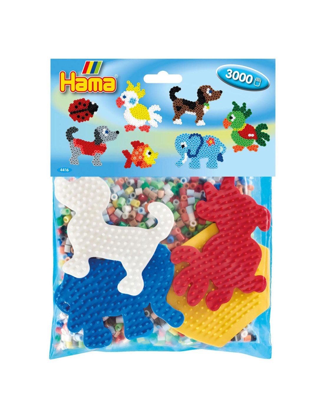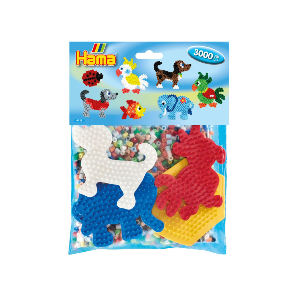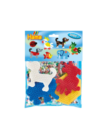 Hama group pack met 4 platen (zeshoek, olifant, papegaai & hond) en 3000 kralen in verschillende kleuren