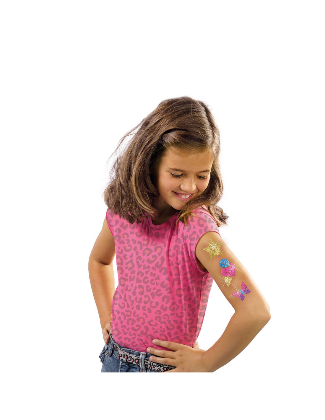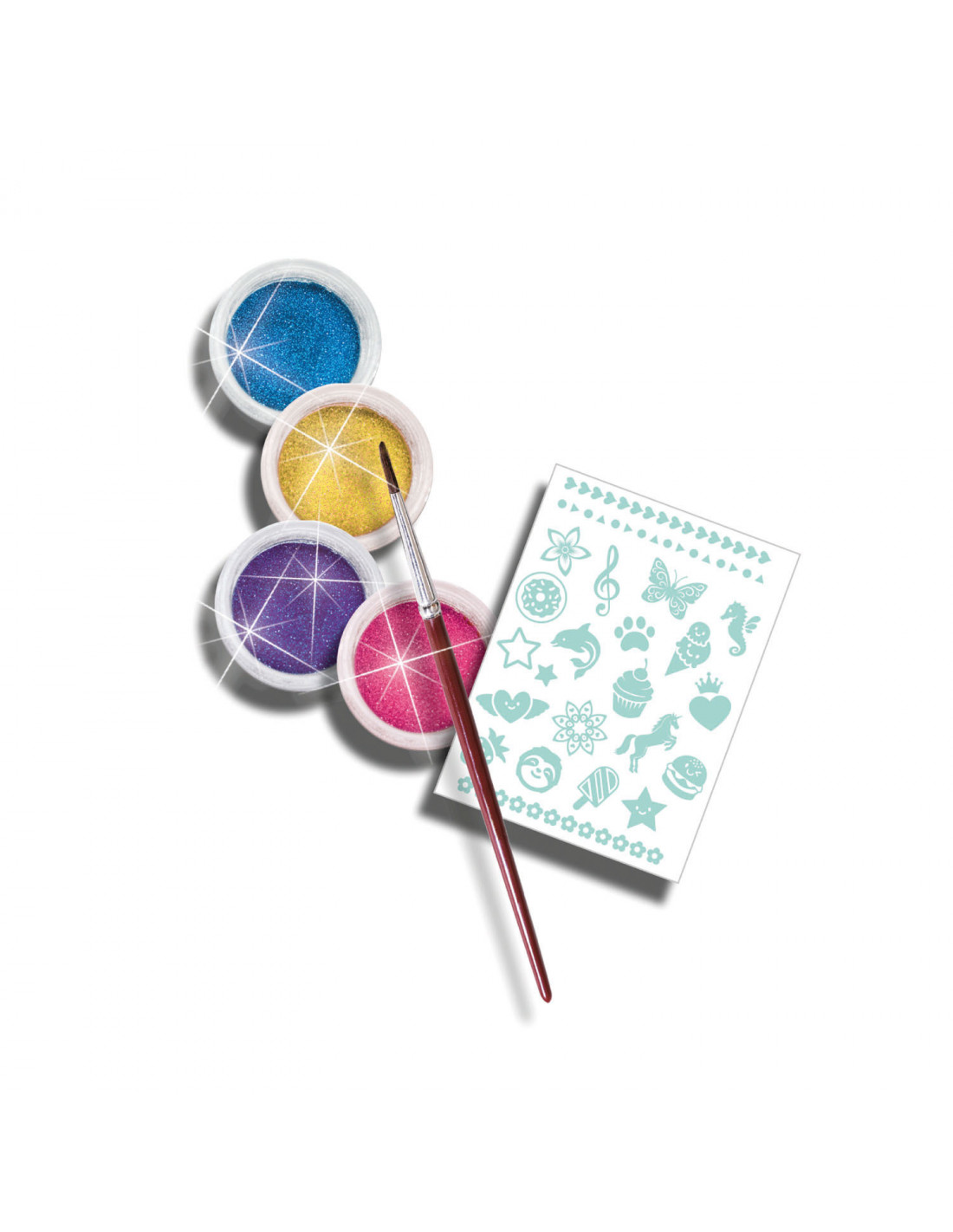 Maak je eigen Fashion glitter tattoos met deze set van SES Creative. Plak de dubbelzijdige transparante stickers op je huid en breng de glitters met behulp van de penseel aan op het klevende gedeelte. Personaliseer je tattoos door te spelen met de verschillende kleuren glitter of zelfs glitter te mixen. Cosmetisch getest en makkelijk afwasbaar van de huid. Inhoud: dubbelzijdige tattoo stickers, 4 kleuren glitters, penseel en een handleiding.