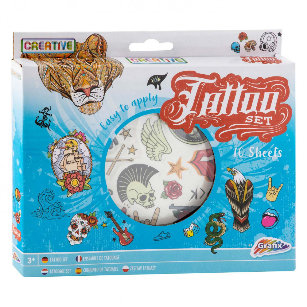 Deze doos is gevuld met 10 vellen tatoeages. De tatoeages variëren. De tattoos zijn eenvoudig op te brengen.
