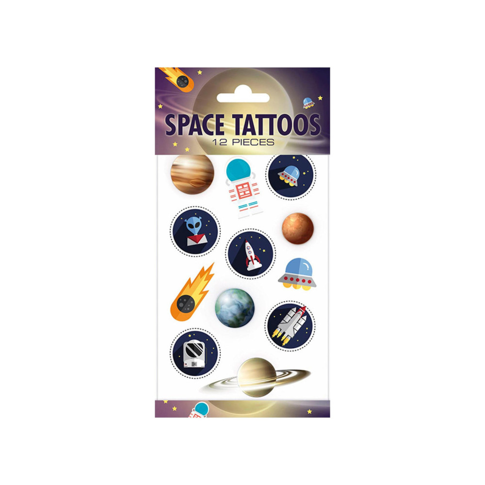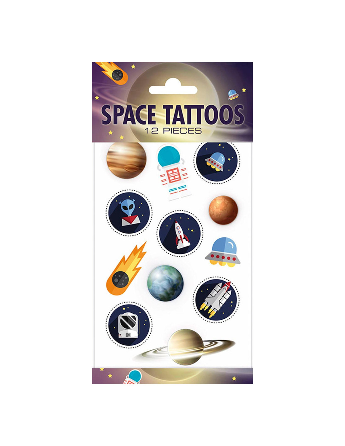Vel met 12 tijdelijke plaktattoos in ruimtevaartthema. Niet geschikt voor kinderen jonger dan 3 jaar.