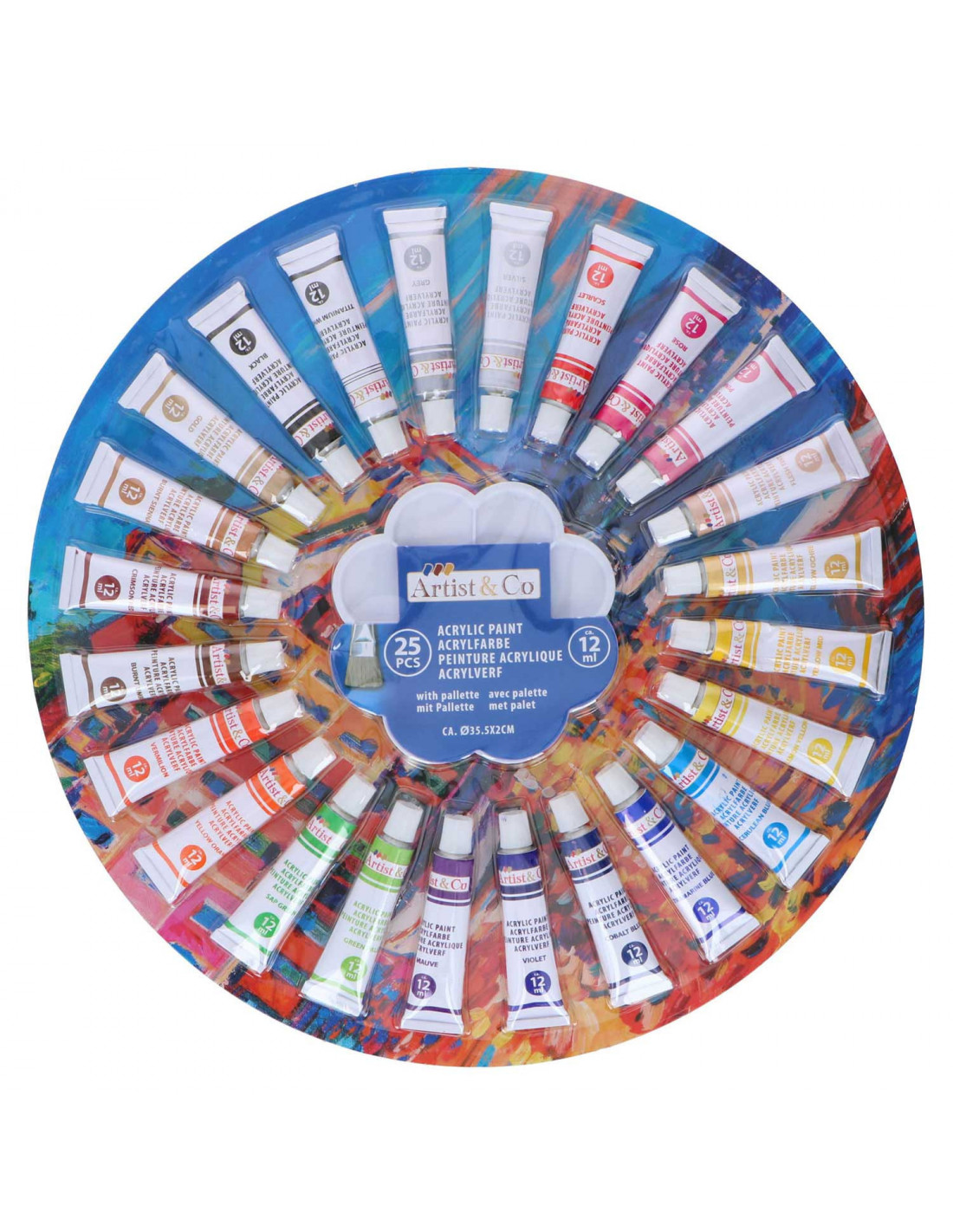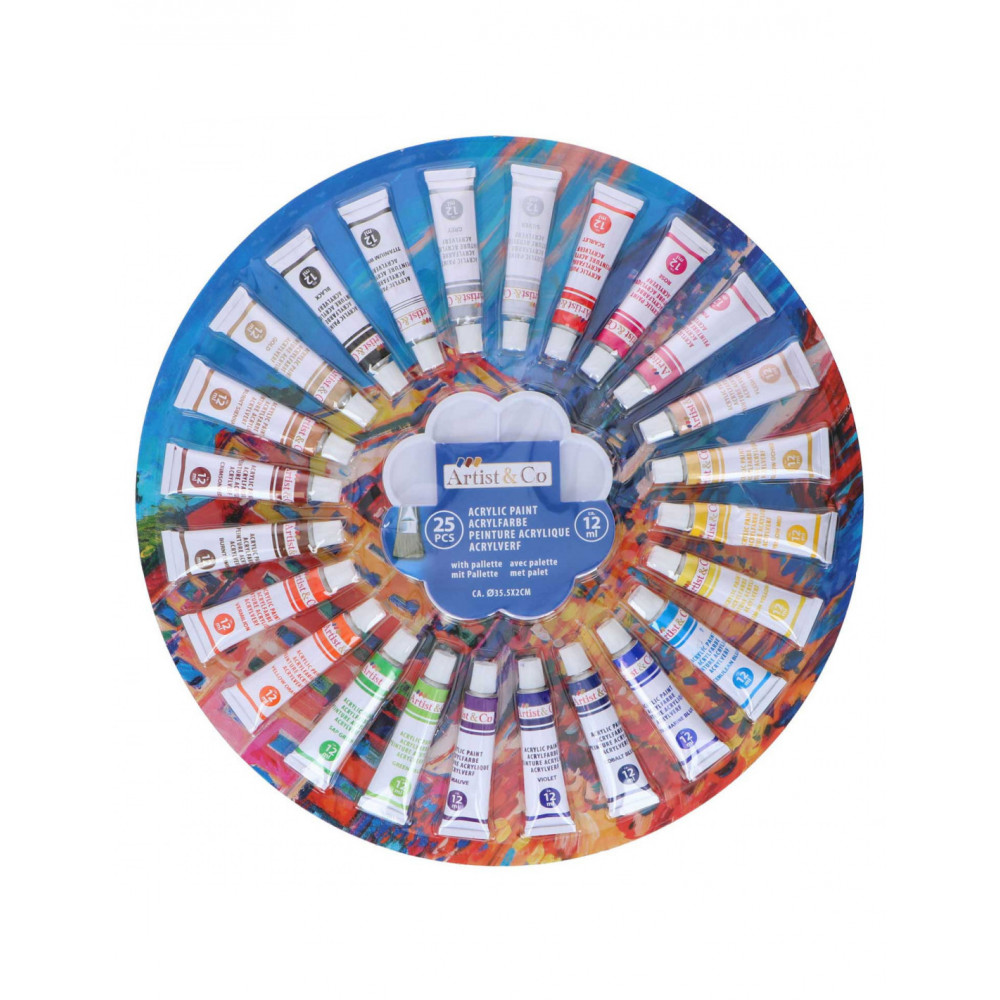 Acrylverf, 25 kleuren, 12 ml per tube. Inclusief mengpalet.