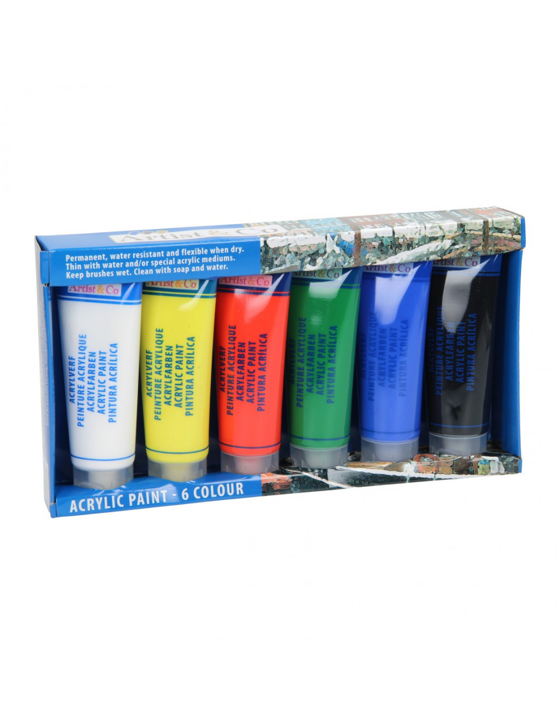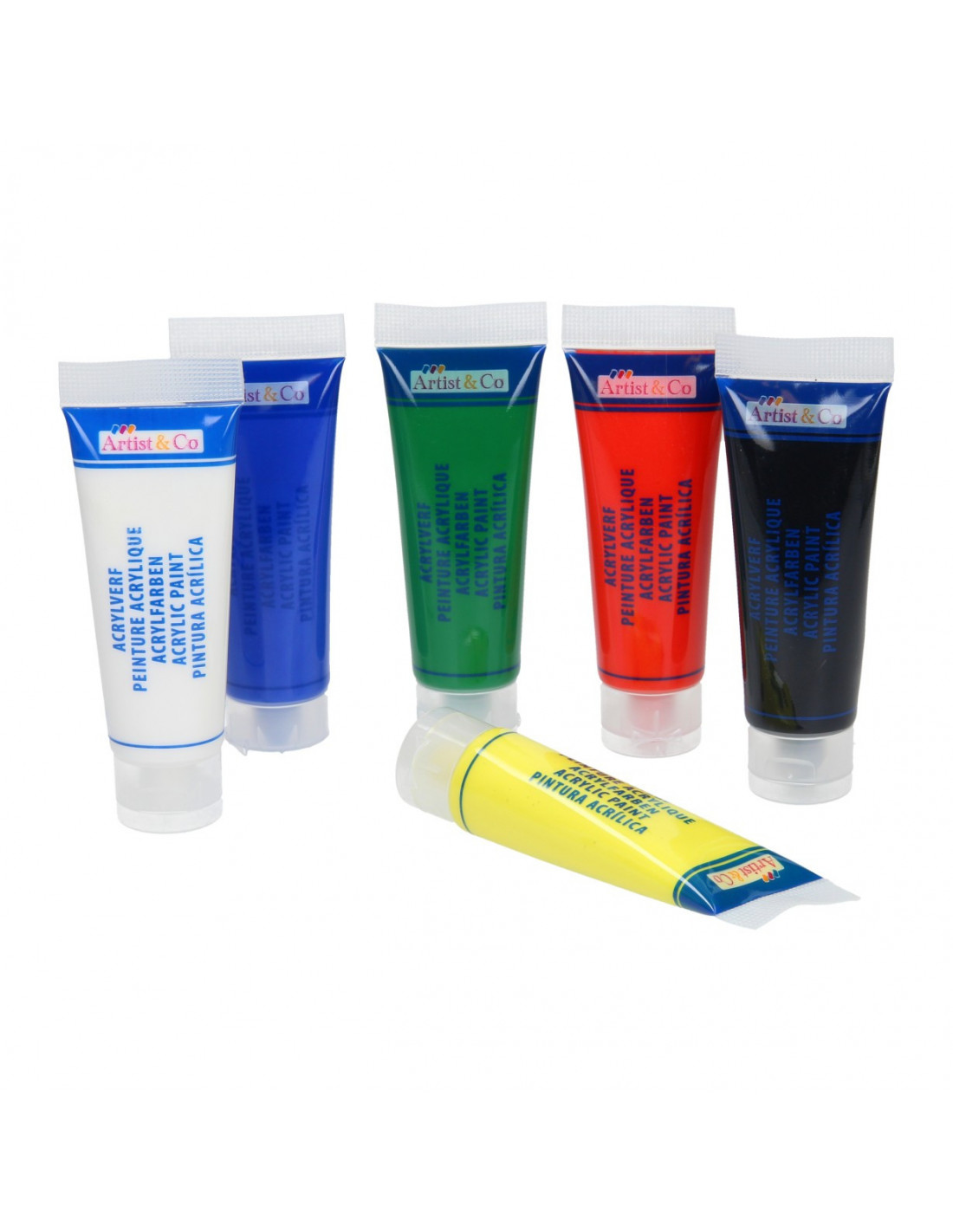 Set van 6 tubes acrylverf in verschillende kleuren. Na het drogen is de verf permanent, watervast en flexibel. Met water en/of speciale acrylverfmiddelen verdunbaar.