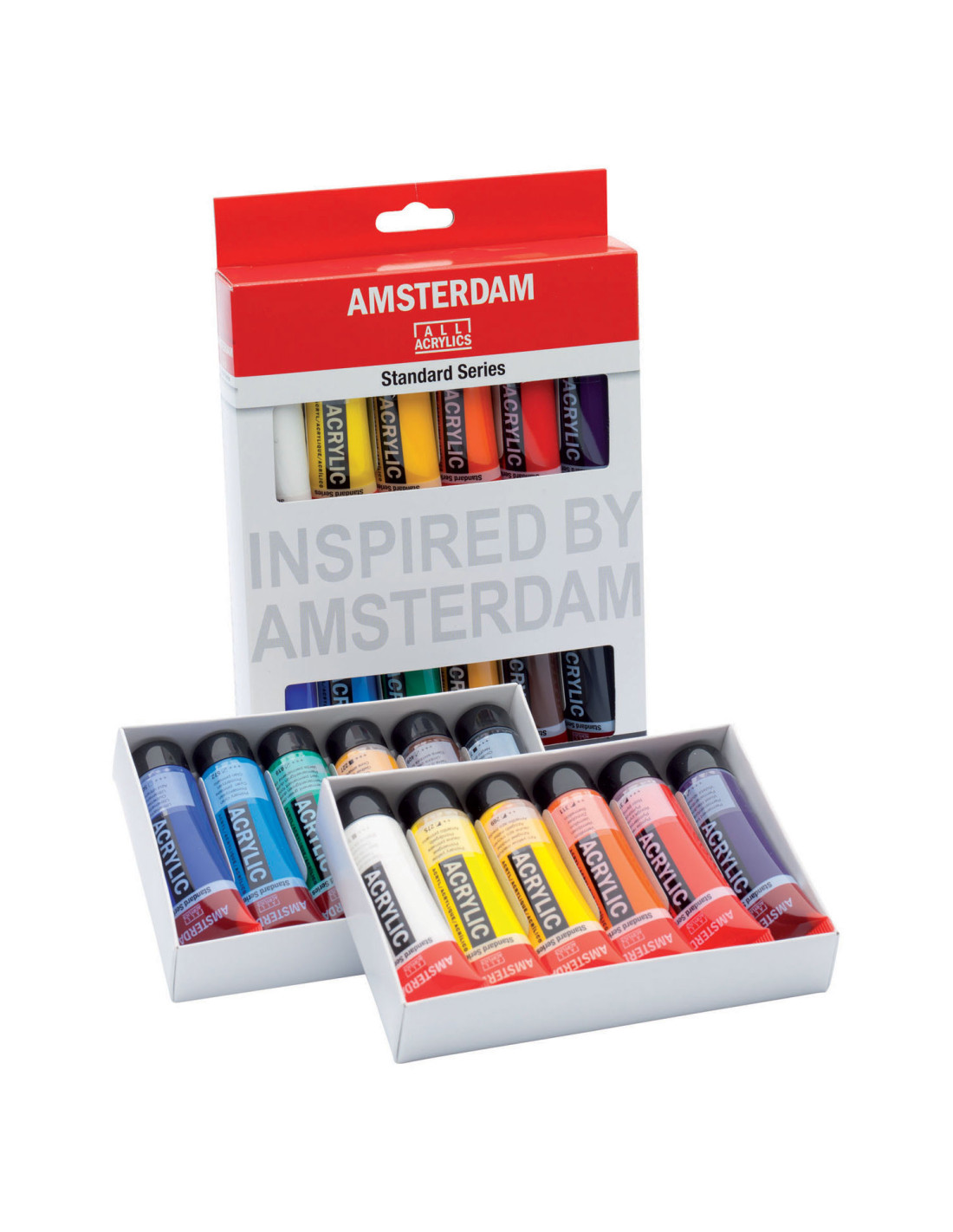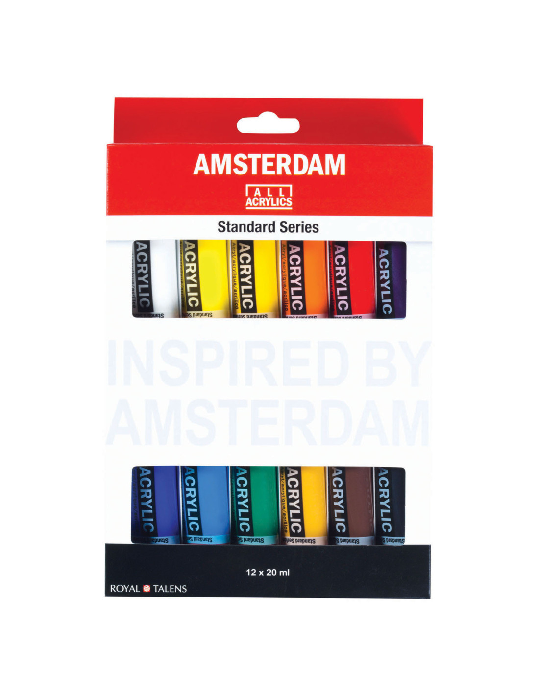Maak de mooiste professionele schilderijen met Talens Amsterdam acrylverf. Deze professionele standard set bevat 12 tubes van 20 ml acrylverf van hoge kwaliteit. Dankzij de uitstekende hechting is de verf gemakkelijk aan te brengen op elke vet- en stofvrije ondergrond. De verf kan zowel verdund met water, puur of gemengd met een medium gebruikt worden. De set bevat de kleuren titaanwit, primairgeel, azogeel midden, vermiljoen, pyrrolerood, permanentblauwviolet, ultramarijn, primaircyaan, permanentgroen donker, gele oker, omber gebrand en oxydzwart.
