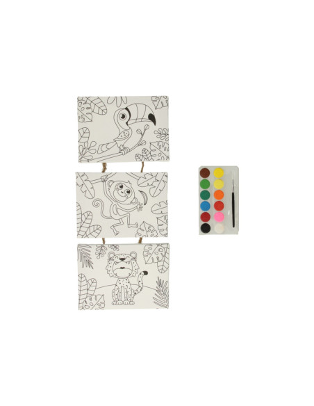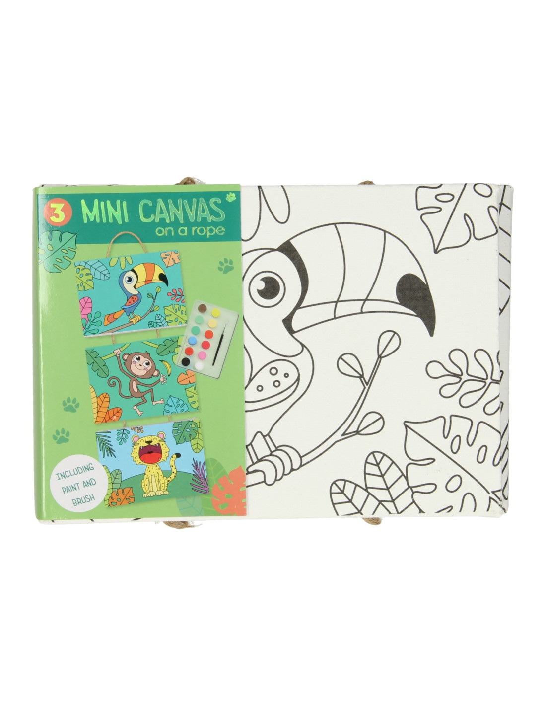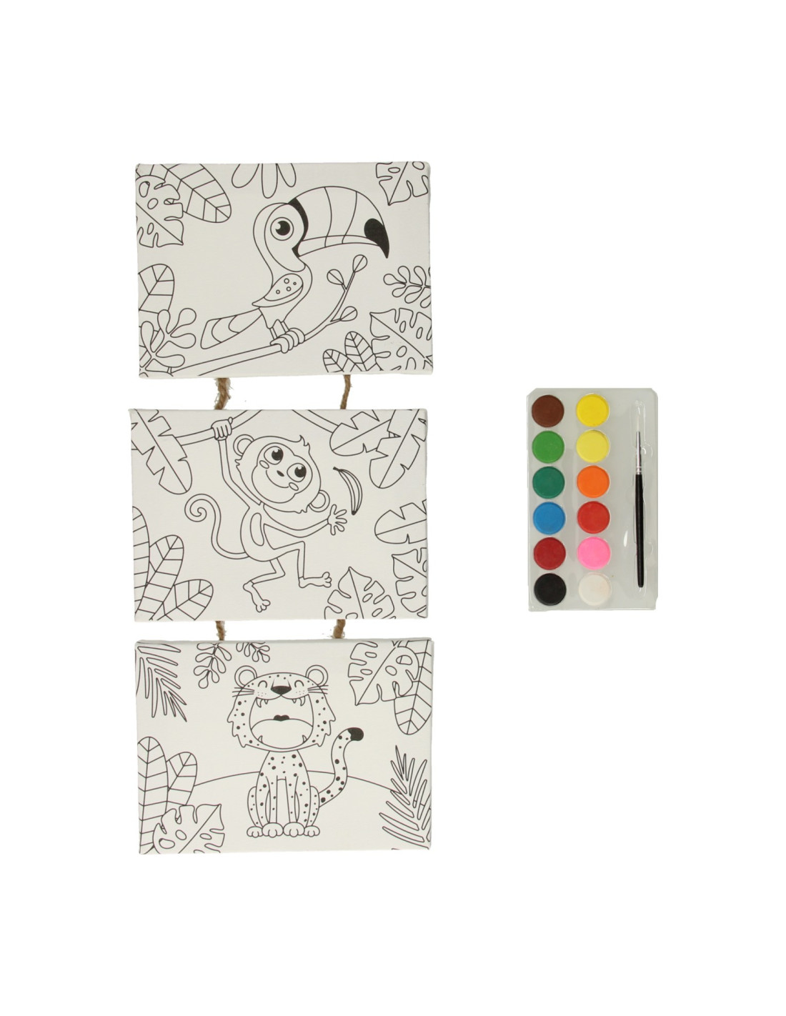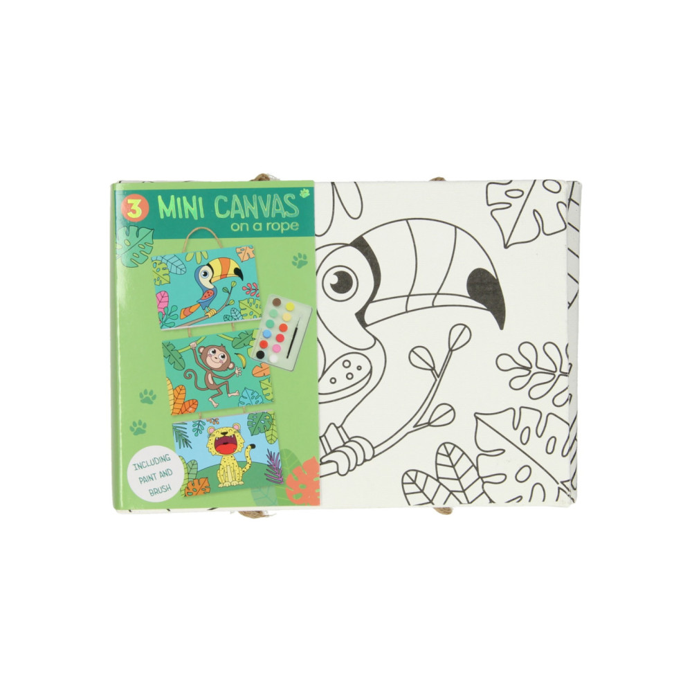 Set van 3 mini canvassen aan touw. Inclusief verf en penseel. Variant: wilde dieren. Afmetingen: 17,5 x 12,5 centimeter. Geschikt voor kinderen vanaf 3 jaar oud.