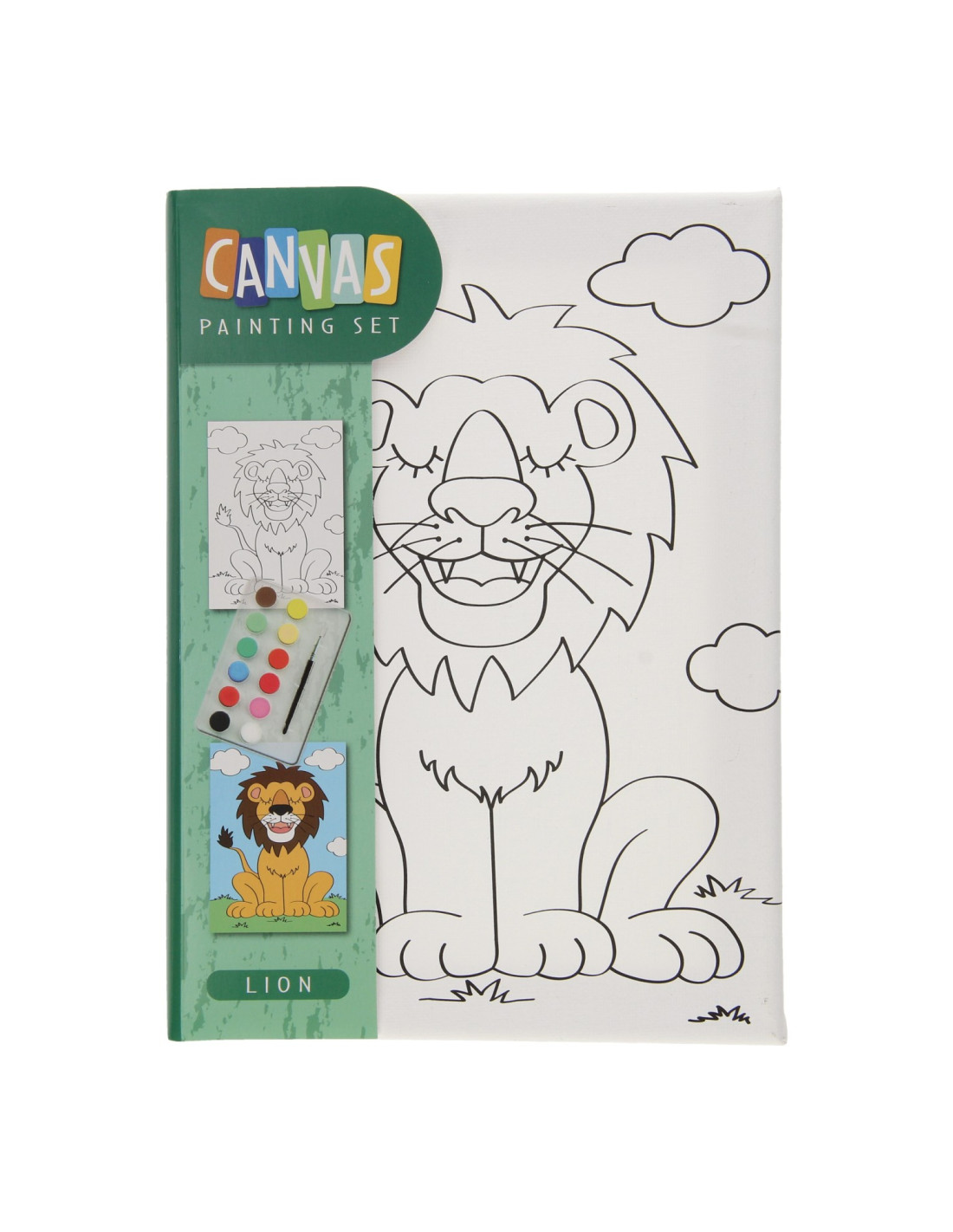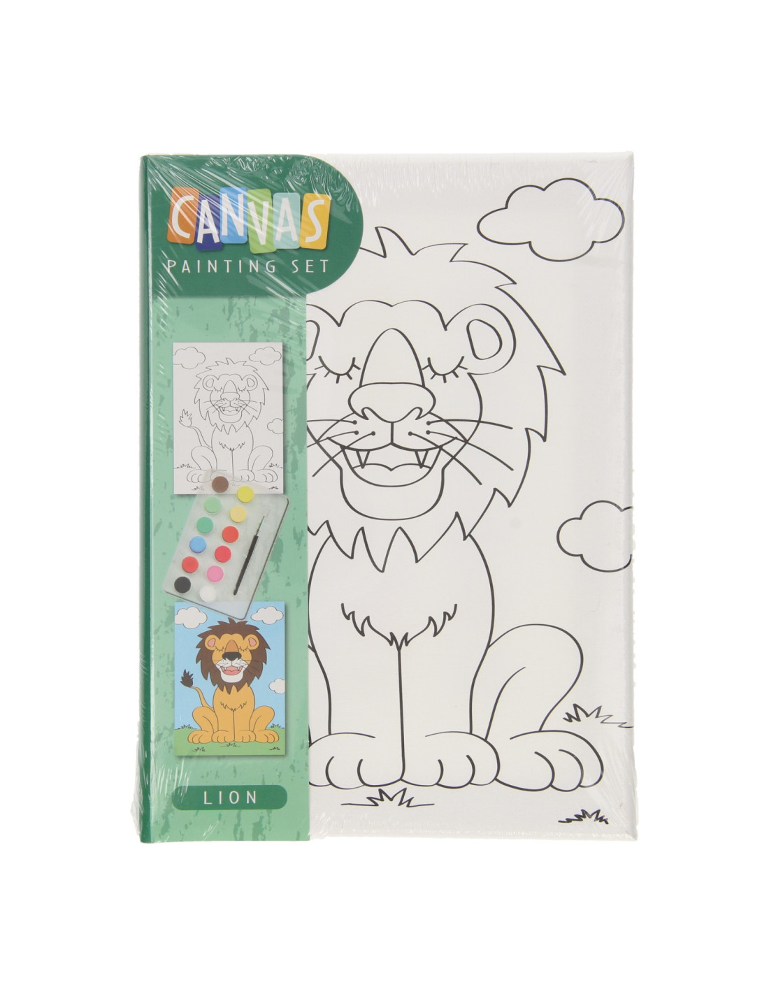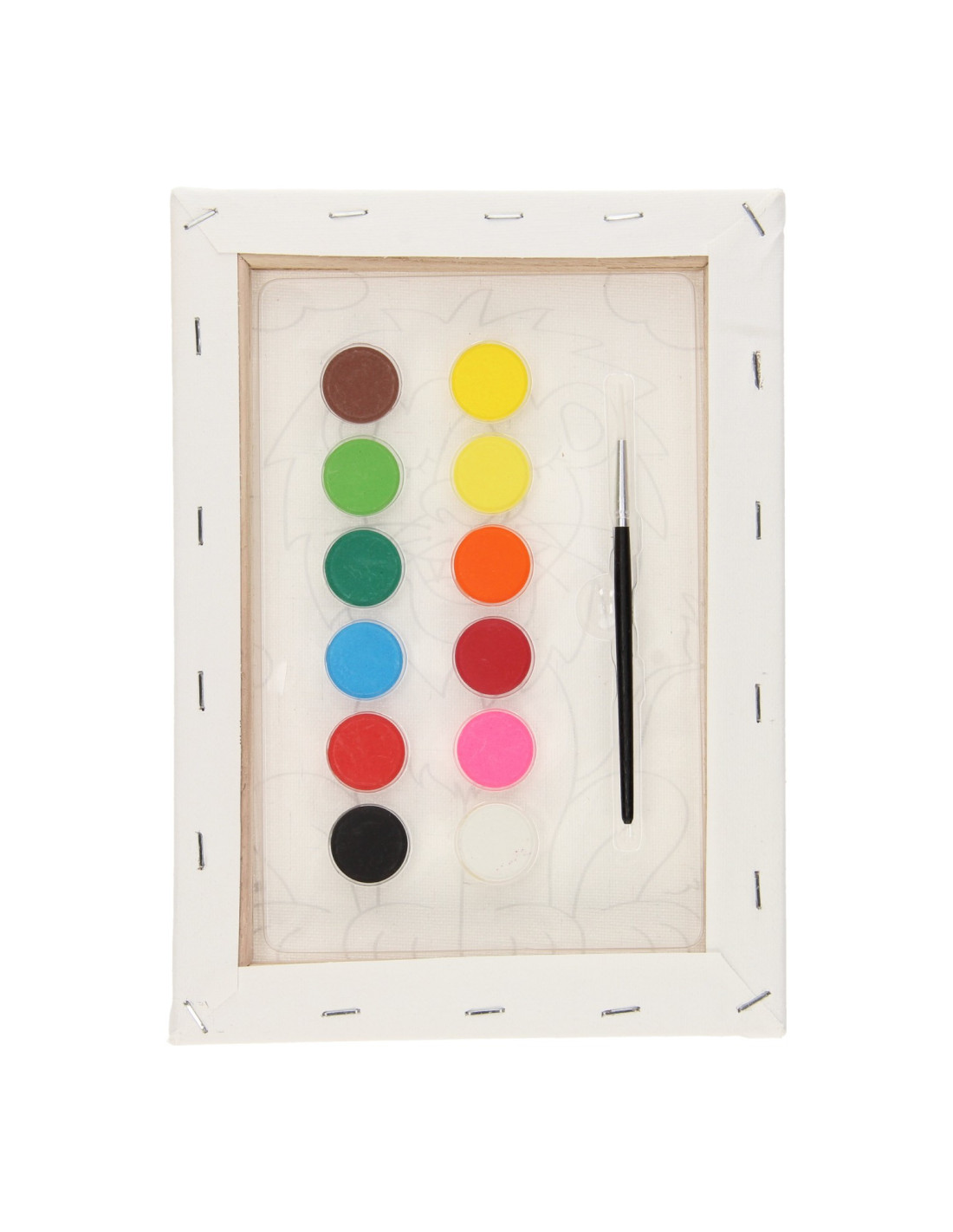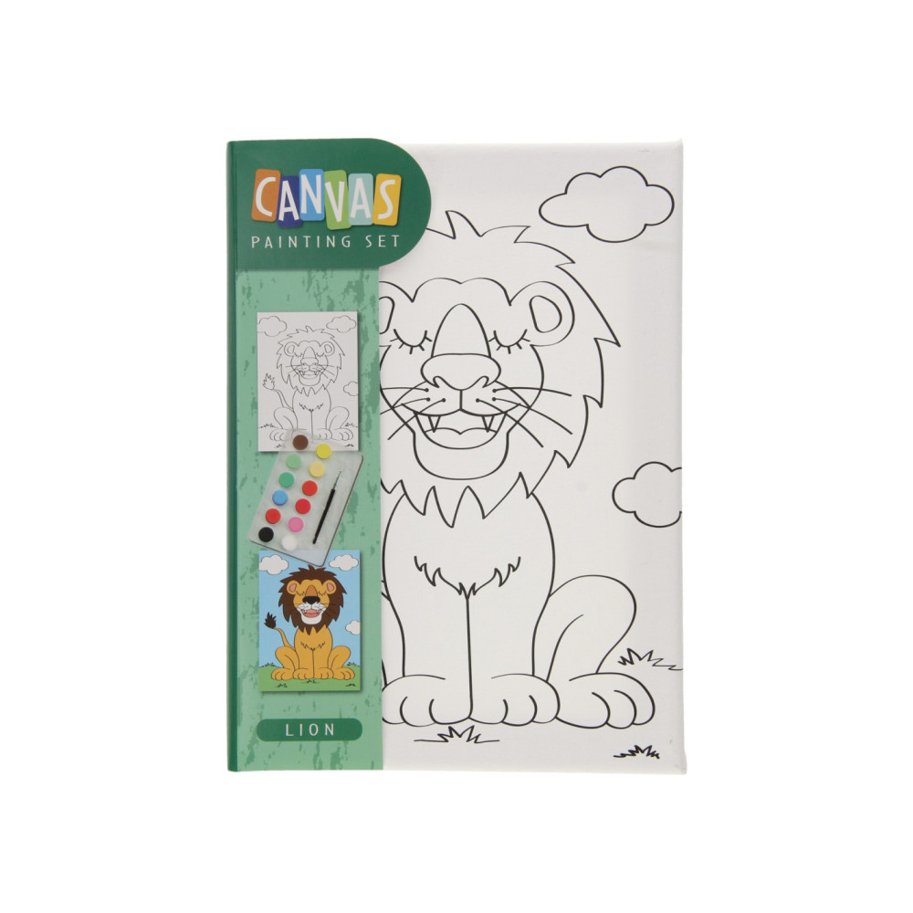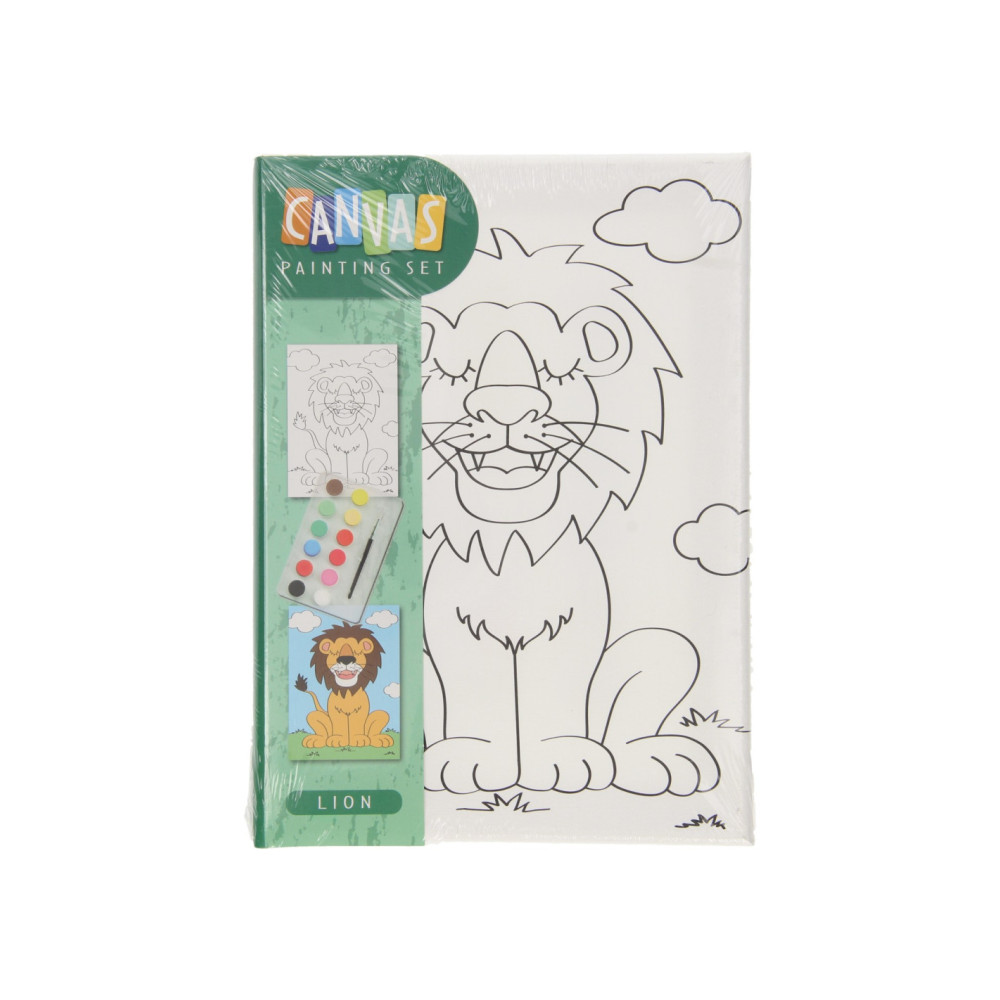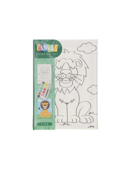 Deze schilderset bestaat uit een canvas met afgebeelde leeuw en pallet met 12 kleuren verf en een penseel.