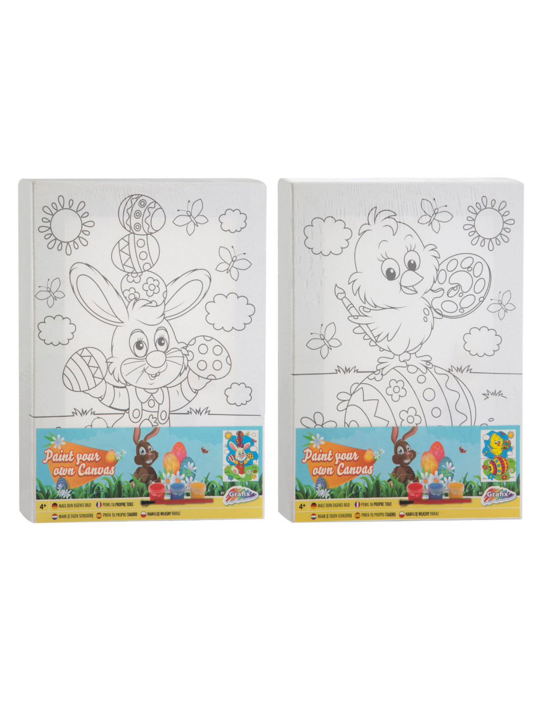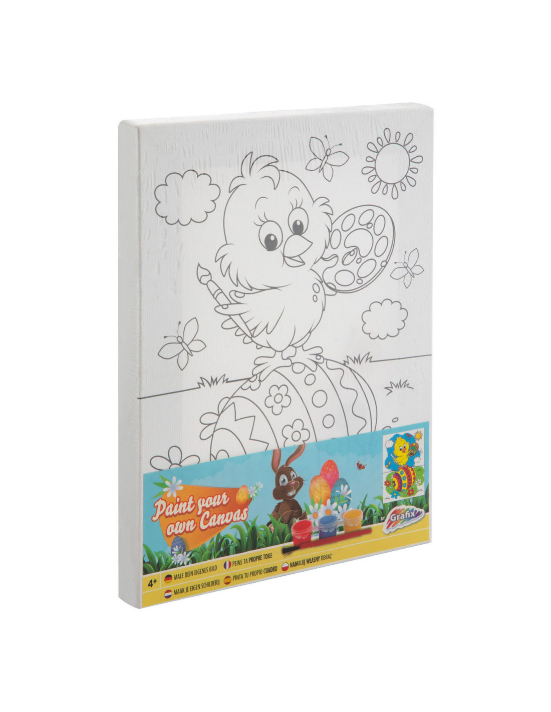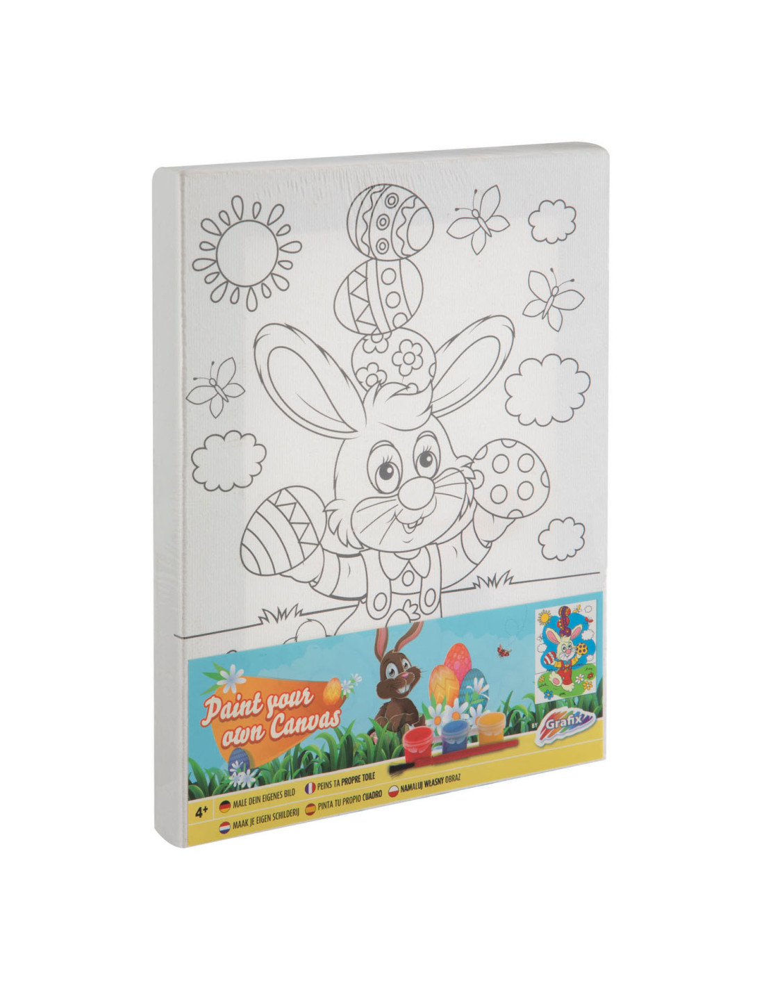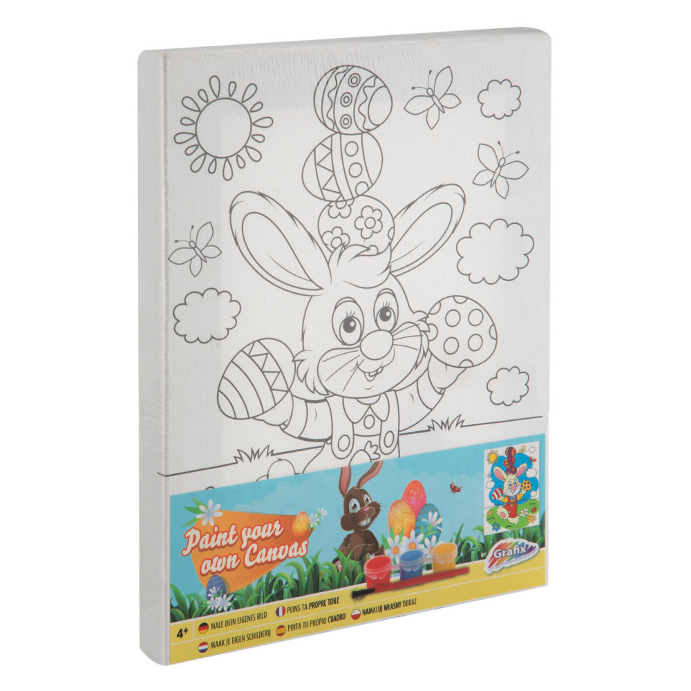 Met dit voorbedrukte canvas, kun je je eigen mooie Paas schilderij maken. Het canvas is voorzien van een afbeelding van een Paasdier (kuiken of konijn) met paaseieren en vlinders, een gezellig tafereel, perfect voor Pasen! Het canvas wordt geleverd met 3 kleuren verf (rood, blauw en geel) en een penseel. Hiermee kun je je creativiteit de vrije loop laten en je eigen unieke Paas schilderij maken. Dit product is geschikt voor kinderen van 4 tot 8 jaar oud.