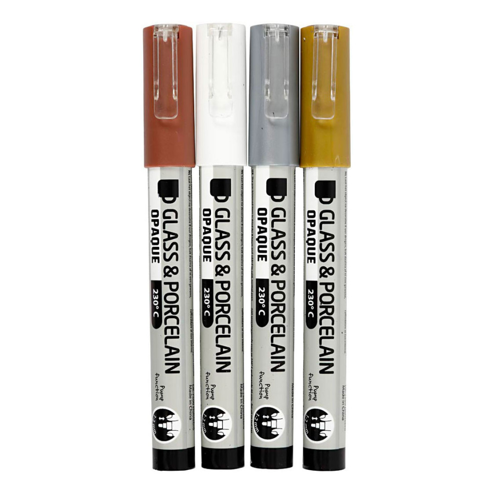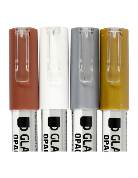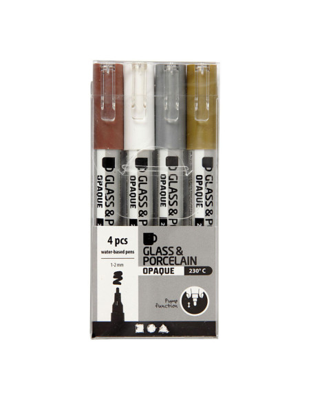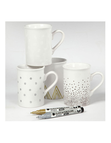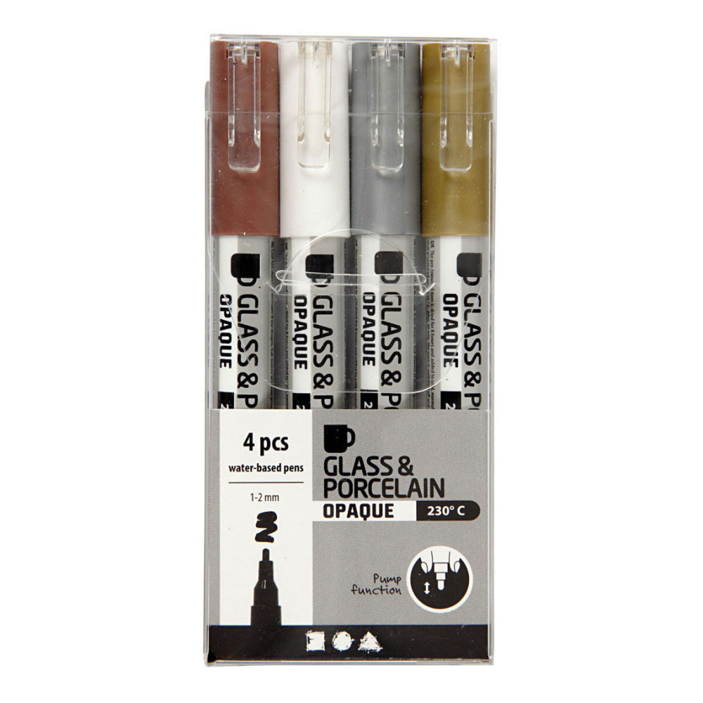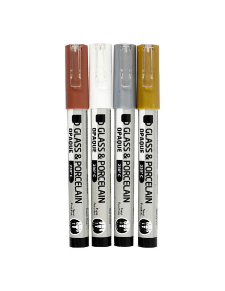 Dekkende stift op waterbasis geschikt voor zowel glas als porselein. Het gedecoreerde item is vaatwasmachinebestendig op lage temperatuur na fixatie in de oven..Deze marker hecht het beste op een schone, droge en vetvrije ondergrond. Schud de marker goed en duw deze op de punt voorzichtig op en neer totdat de verf naar de punt stroomt. Laat het versierde artikel 8 uur drogen, plaats het in een koude oven (geen heteluchtoven of stoomoven). Stel de temperatuur in op 230°C. Het item is na 40 minuten gefixeerd. Zet de oven uit en laat het item afkoelen in de oven.