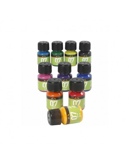 Transparante, glanzende, all-round verf op waterbasis met goed hechtvermogen op glas, porselein, terracotta, plastic etc Niet afbakken in een oven. Droogtijd circa 15-20 min. Uitgehard na 24 uur. Set bevat 10 kleuren van elk 30 ml geel, oranje, rood, roze, rood/violet, brilliant blauw, kiwi, brilliant groen, zwart, turquoise.