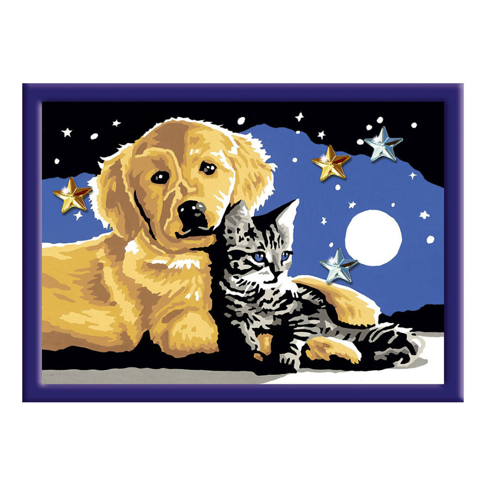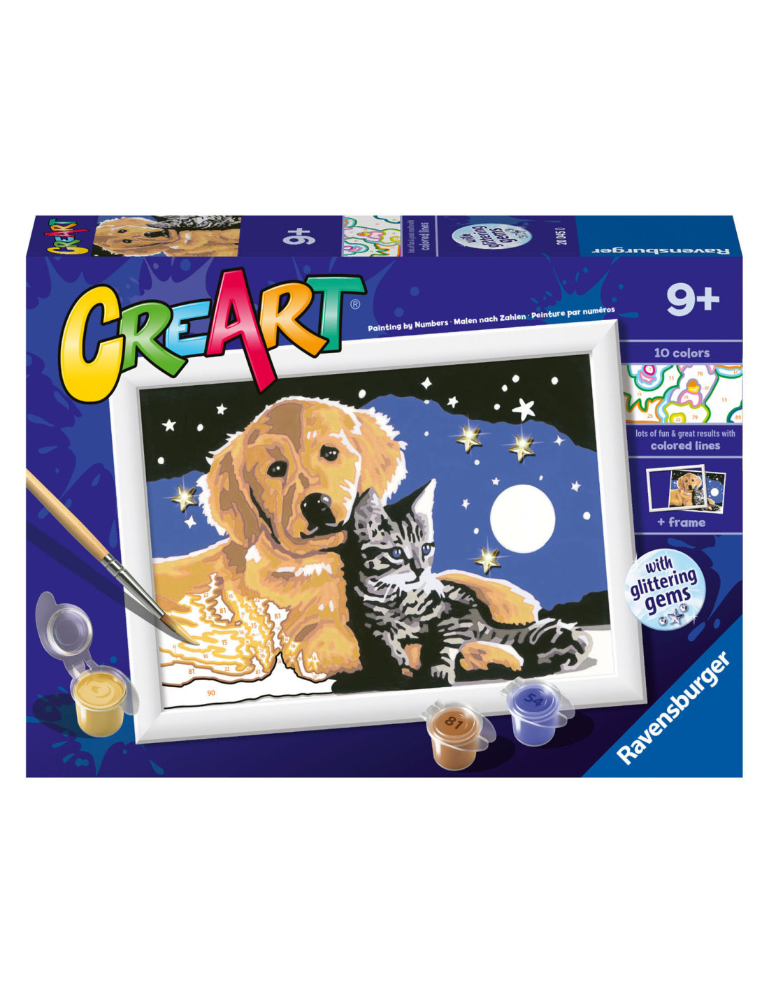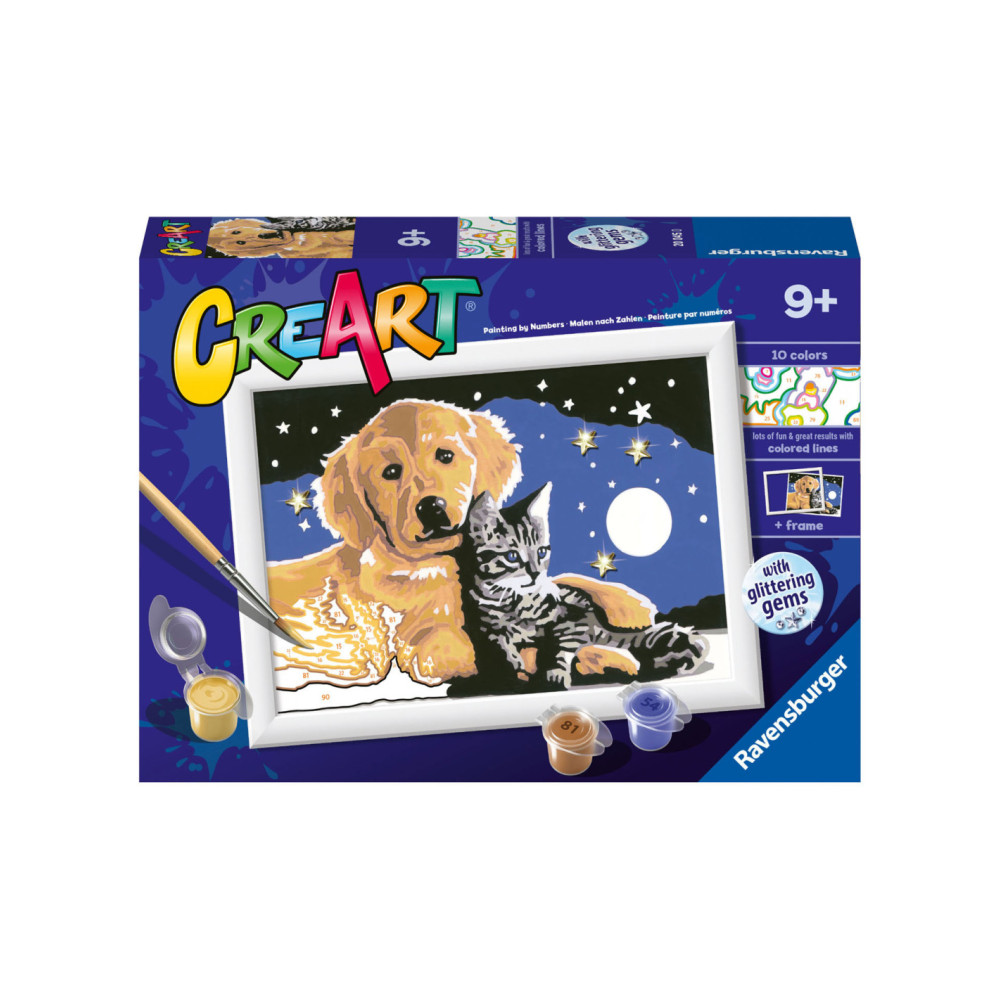 Schilder het kunstwerk CreArt Stargazing Sweetness!Schilderen op nummer van Ravensburger - iedereen kan schilderen! Dankzij de eenvoudige schildertechniek van schilderen op nummer is het kinderlijk eenvoudig de kunstenaar in jezelf wakker te maken! Dankzij de duidelijke schildervakjes met gekleurde buitenlijnen ontstaat een klein en prachtig kunstwerk van x . De fijnere kleurnuanceringen zorgen voor een elegant kleurverloop en schaduwspel. Uitpakken en aan de slag, met de afbeelding van Stargazing Sweetness!Iedereen Kan Schilderen! De schilderset bevat hoogwaardig materiaal: acrylverf op waterbasis in hersluitbare potjes, schilderpaneel en penseel. De verschillende series zijn verdeeld in verschillende moeilijkheidsniveaus: eenvoudig met weinig maar grote schildervlakken voor de kleinsten tot heel geraffineerd met veel kleine vakjes voor geroutineerde schilders.