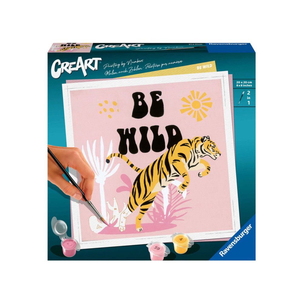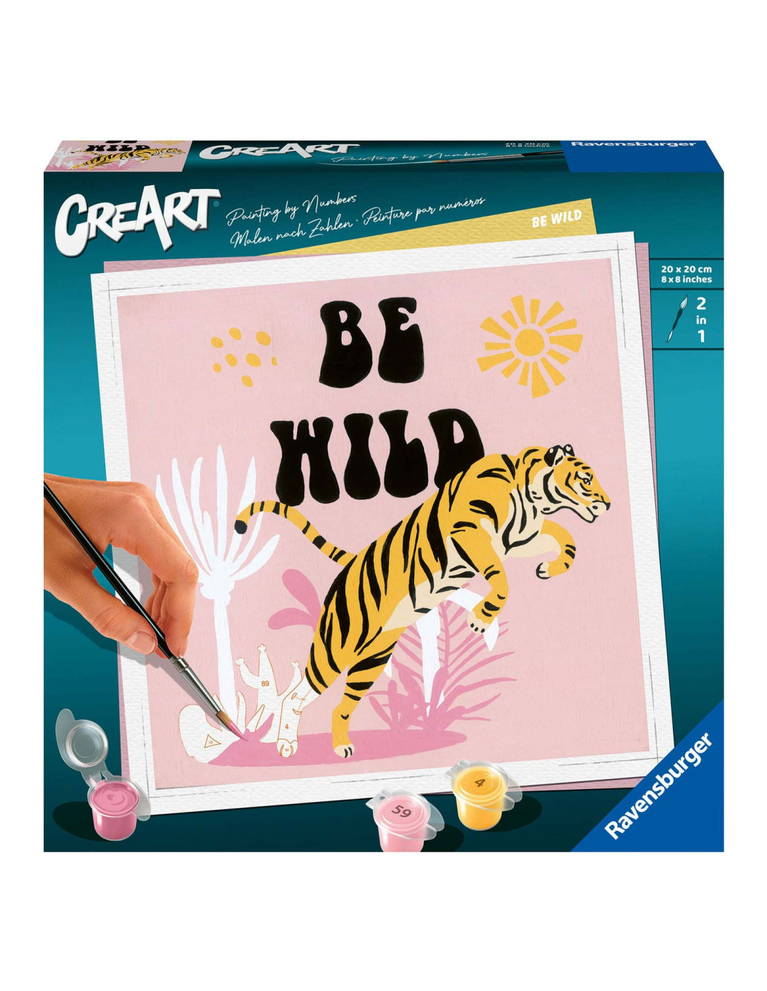 Schilderen op nummer van Ravensburger - iedereen kan schilderen! Dankzij de eenvoudige schildertechniek van schilderen op nummer is het kinderlijk eenvoudig de kunstenaar in jezelf wakker te maken! Dankzij de duidelijke schildervakjes ontstaat een klein en prachtig kunstwerk van 20,00 cm x 0,30 cm. De fijnere kleurnuanceringen zorgen voor een elegant kleurverloop en schaduwspel. Uitpakken en aan de slag, met de afbeelding van Be Wild!