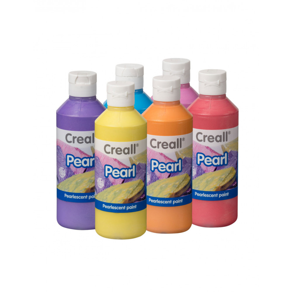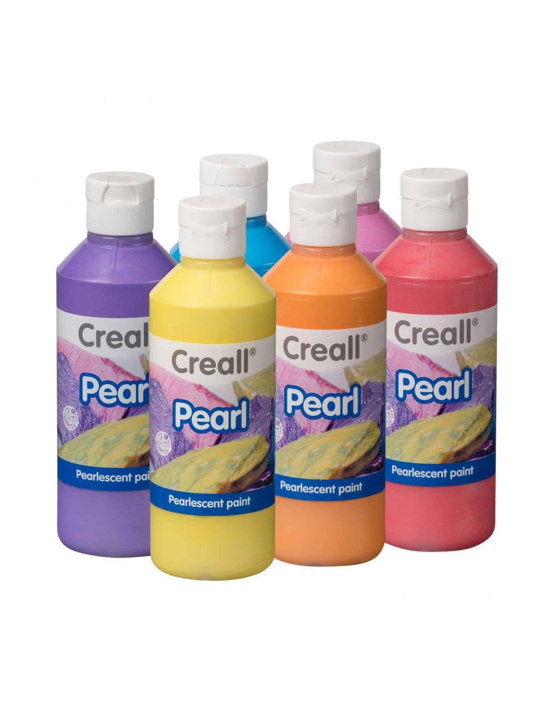 Creall waterbestendige parelmoerverf, gebruiksklaar, na droging zijdeglans. Inhoud 6 x 250 ml