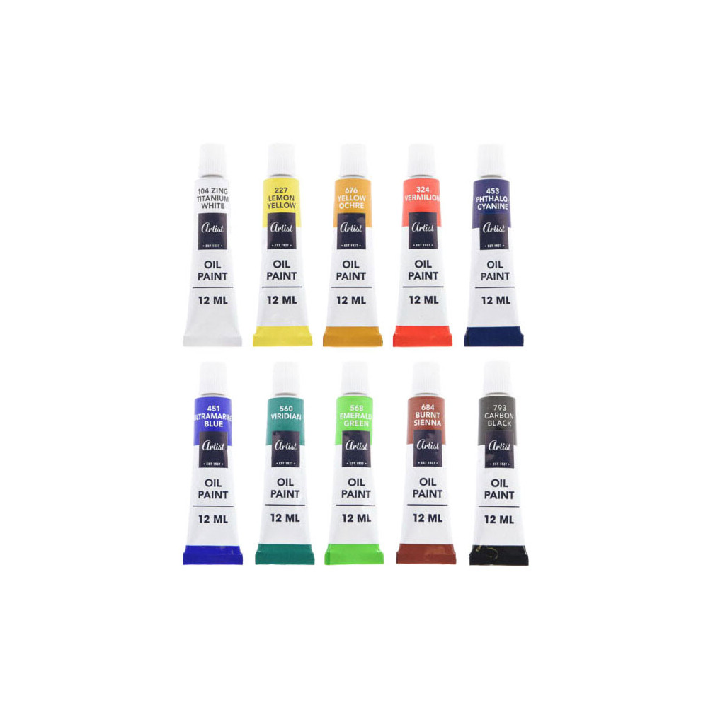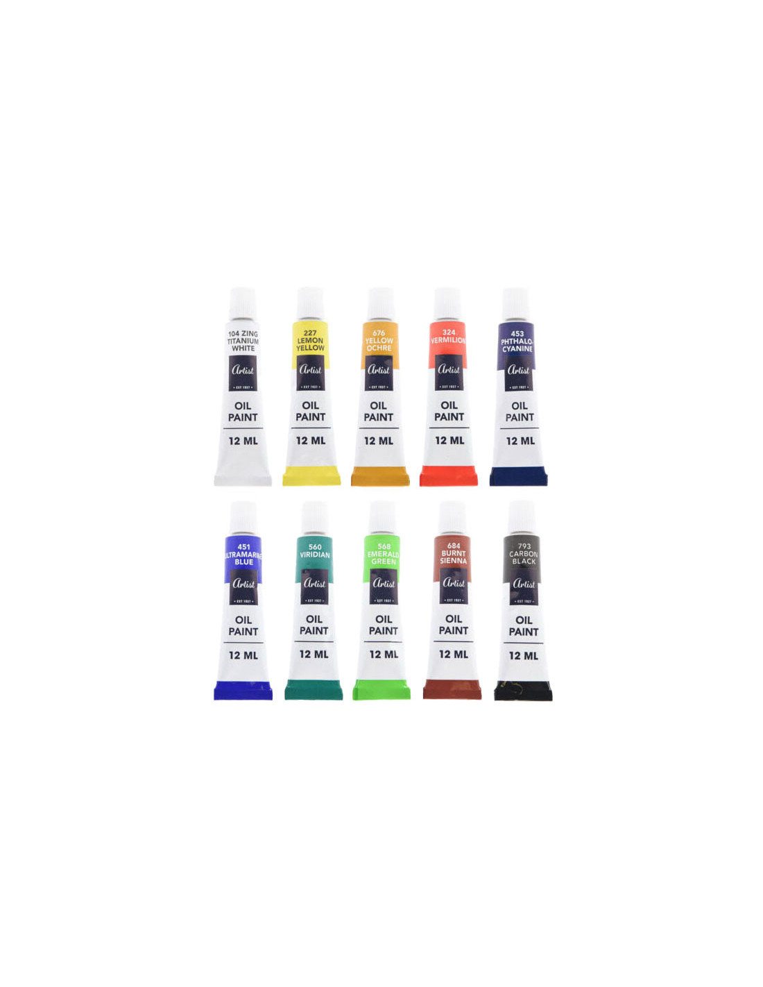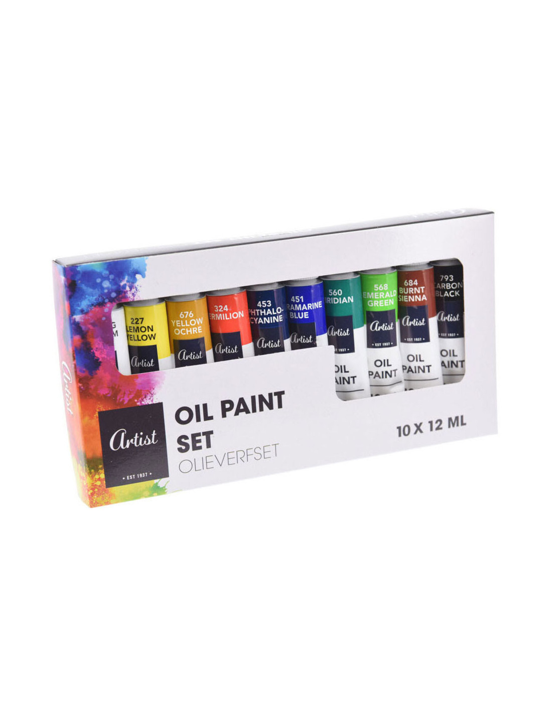 Set met 10 tubes olieverf in verschillende kleuren. De inhoud van elke tube is 12 ml. Geschikt voor kinderen vanaf 3 jaar en volwassenen.