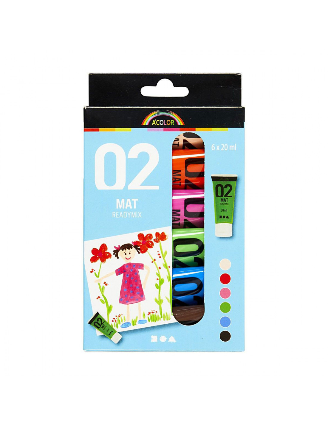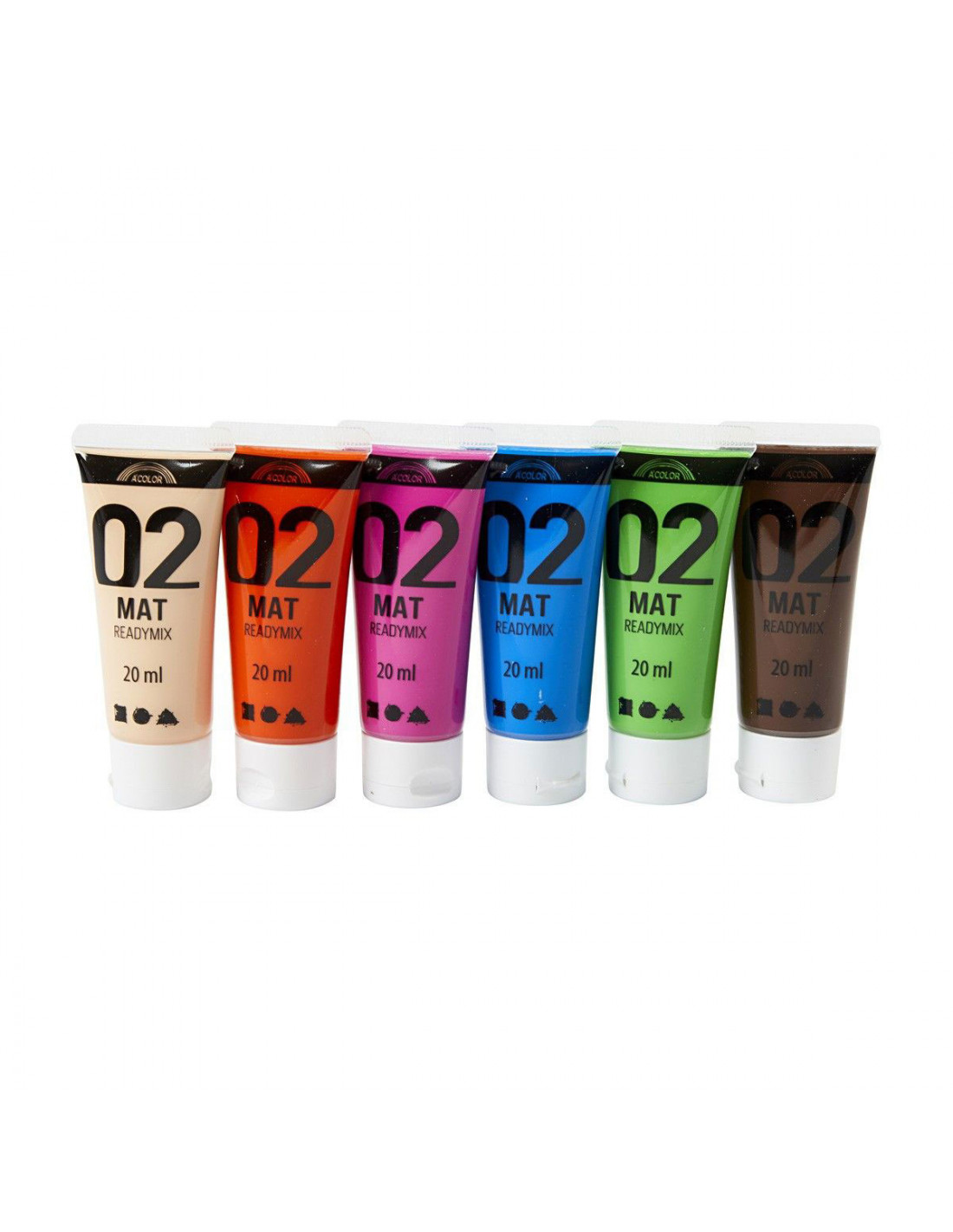 Hoge kwaliteit dekkende allround acrylverf op waterbasis. Kunnen gemengd worden. De kwasten moeten worden schoongemaakt met lauwwarm water. Pakket met 6 verschillende kleuren van elk 20 ml: lichthuidskleur, lichtgroen, bruin, oranje, primair blauw, roze.