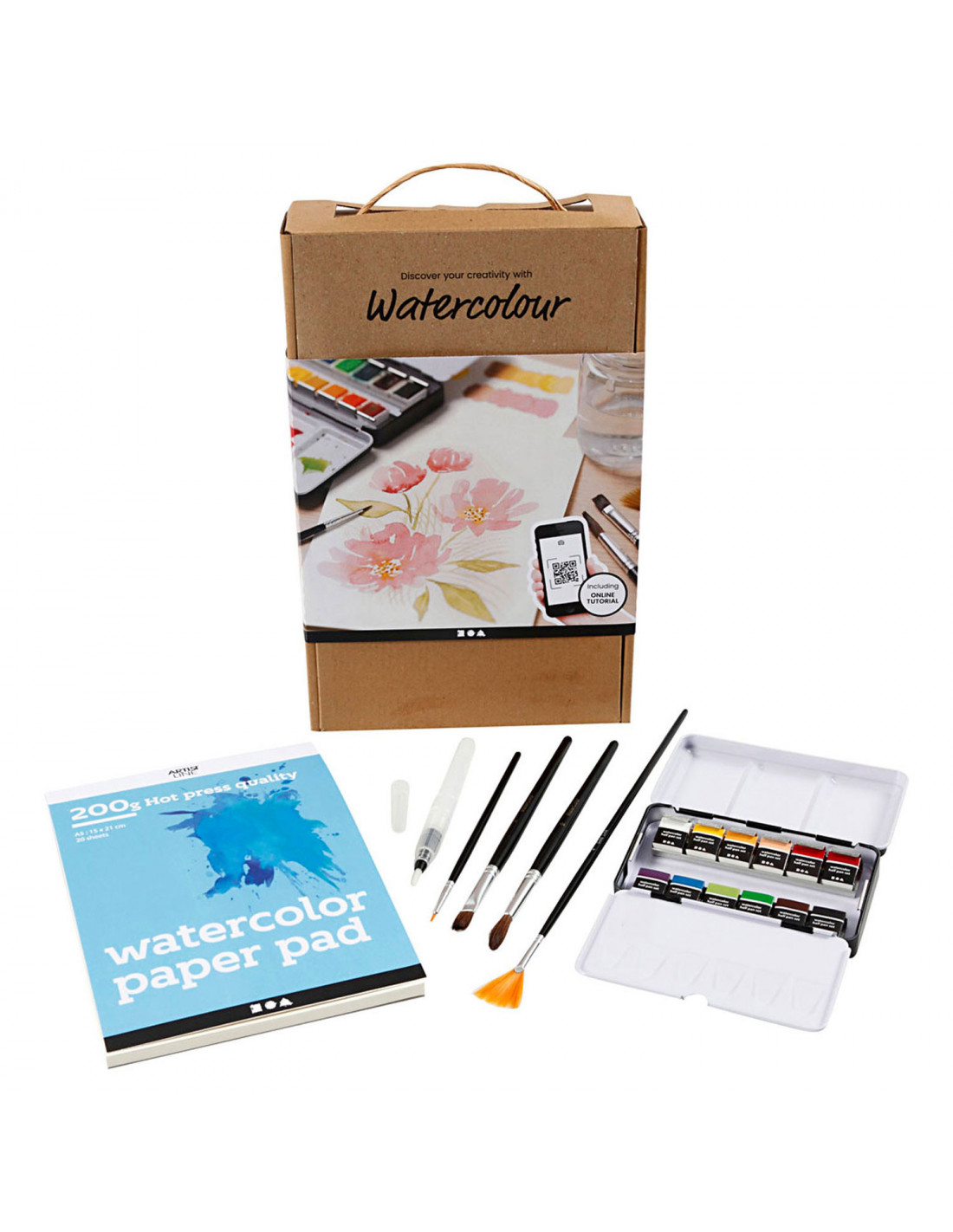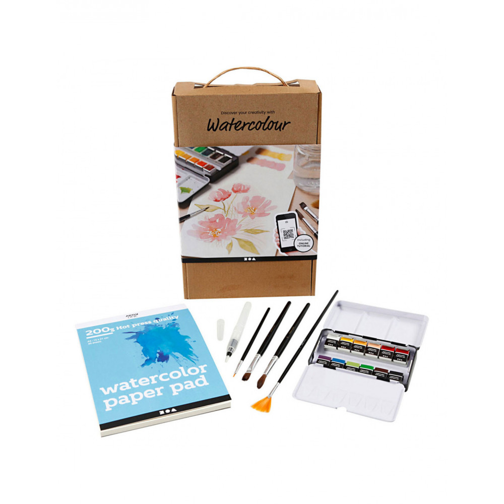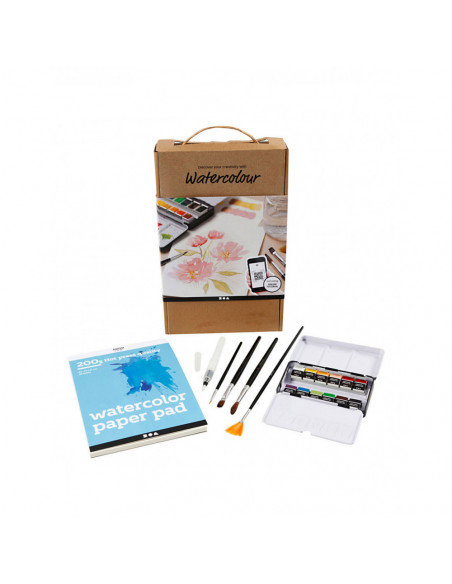 Leer schilderen met aquarelverf met deze trainingskit, die alles bevat wat u nodig heeft om aan de slag te gaan. Scan de QR-code en laat u veilig door de training leiden, waar u verschillende aquareltechnieken kunt leren. Bovendien heeft u aan het einde een prachtige aquarel