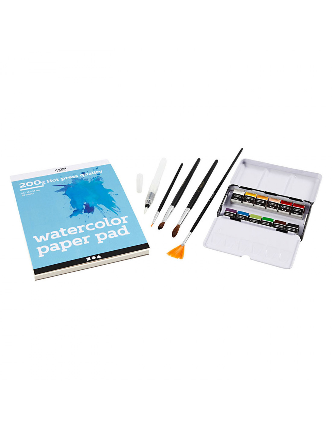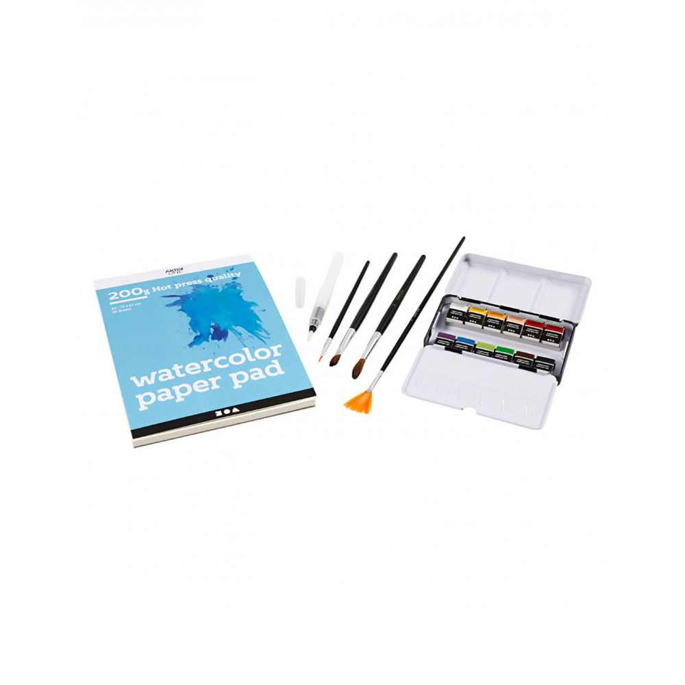Inhoud: Art Aqua aquarelverf halve pan in 12 kleuren, aquarelblok met 20 pagina's plus penselen.