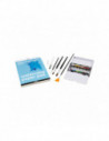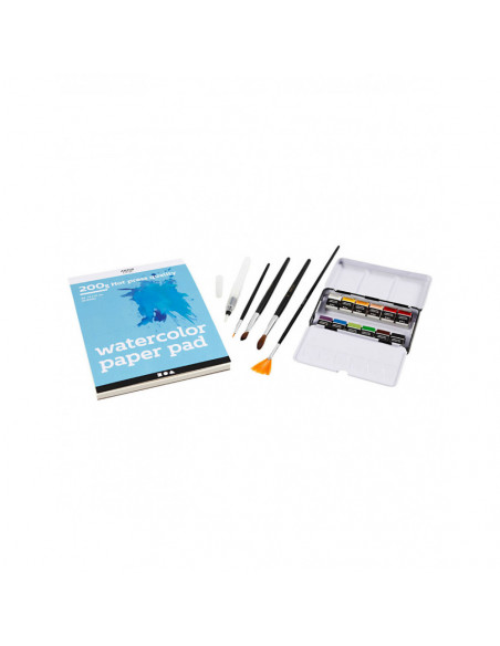 De hoog gepigmenteerde aquarelverf wordt geleverd in een metalen doos. Deze aquarelverf van topkwaliteit heeft indrukwekkende kleureigenschappen en een uitstekende lichtechtheid. Ze zijn gemakkelijk om mee te werken en geschikt voor zowel kleurintensief als gradueel wassen. Het aquarelpapier wordt geleverd in een A5-blok met 20 vellen 200g warmgeperst papier met fijne structuur. Het aquarelpenseel heeft fijne nylon haren en een hol plastic handvat om water op te slaan. Met lichte druk op het handvat kan gemakkelijk water worden bijgevuld en afgegeven. Het platte waaierpenseel heeft nylon haren. Ideaal voor het mengen van kleuren en het creëren van effecten zoals gras en haar. Met hun zachte haren zijn deze twee ponyhaarborstels bijzonder geschikt voor aquarel. Een kleine, platte kwast en een grote ronde kwast voor grotere oppervlakken. De kleine kwast met nylon haren is ideaal voor het aanbrengen van kleinere details.