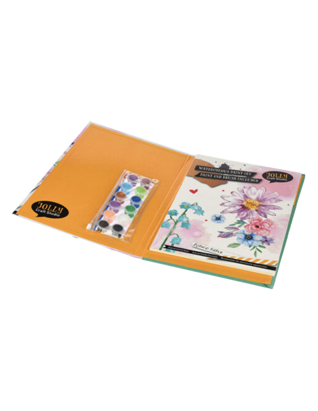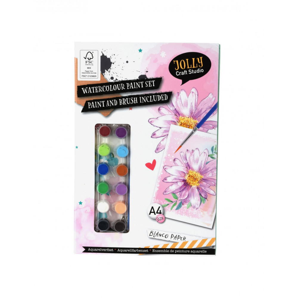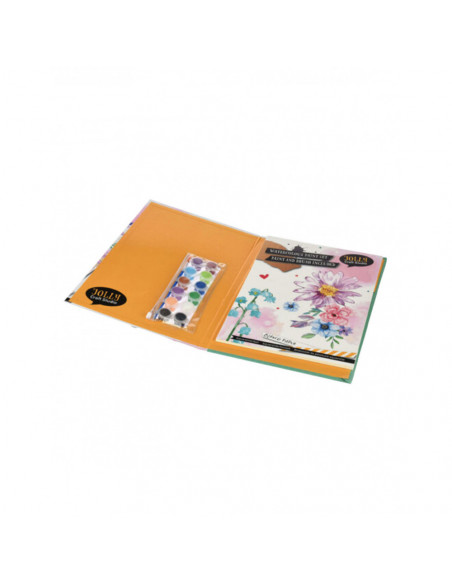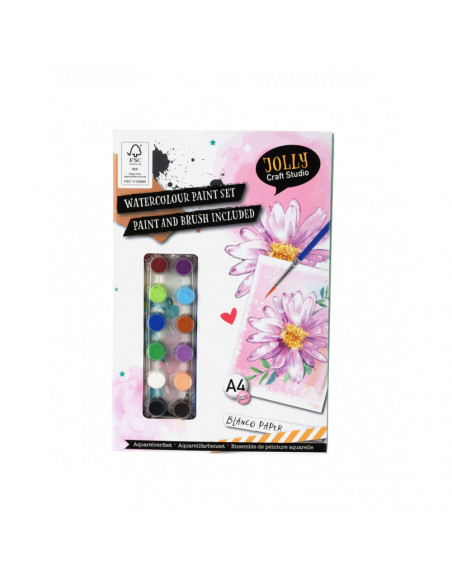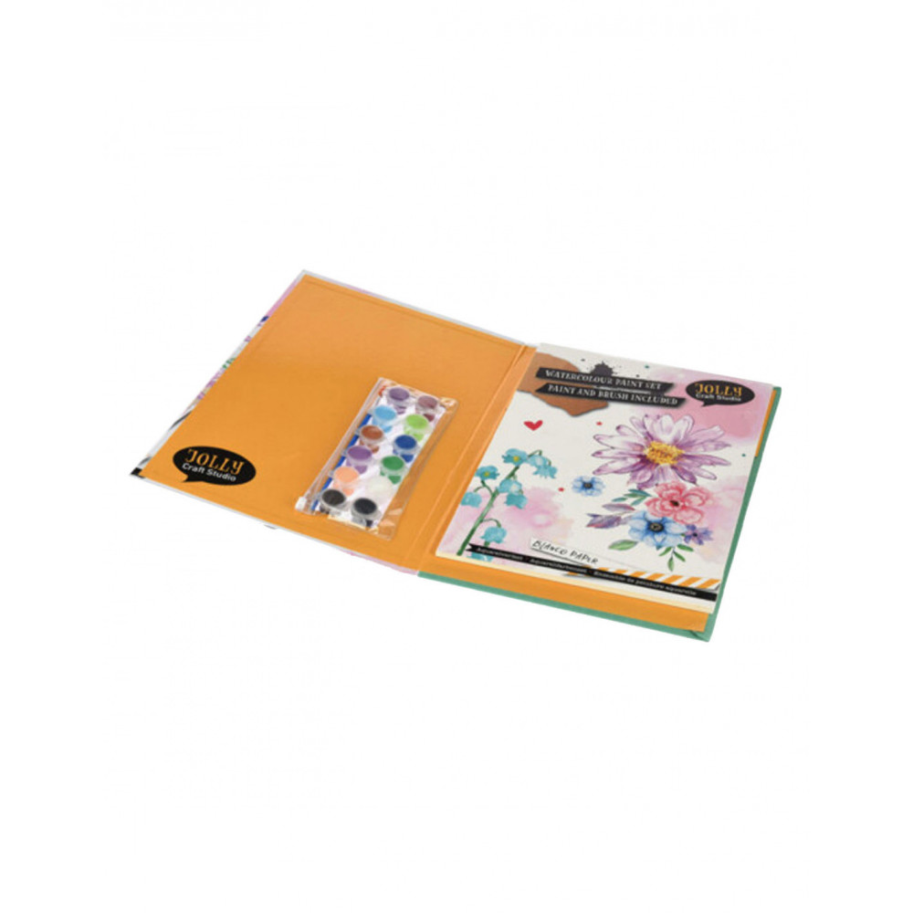 Aquarel verfset met papier en alles wat je nodig hebt om je verf creatie te maken.