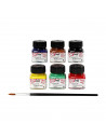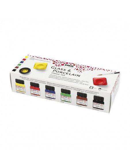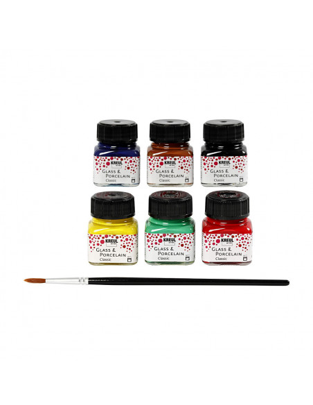 Glanzende, dekkende verf op waterbasis voor artikelen van porselein, terracotta en glas. Set met 6 sterke kleuren en 1 kwast. Breng aan op schone, vetvrije ondergronden. Laat drogen. Na afbakken vaatwasmachine bestendig. Zet in een koude oven, stel in op 160 °C. Bak af in 90 min. nadat de temperatuur bereikt is. Laat afkoelen in de oven. Inhoud: 6 x 20 ml - blauw, bruin, groen, geel, rood, zwart.