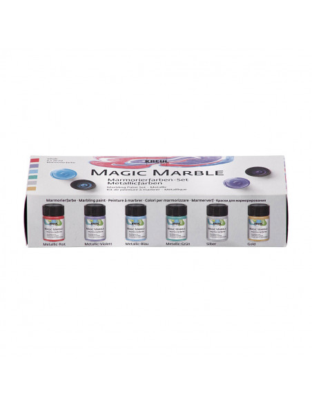 Vloeibare marmer verf. Kan gebruikt worden op hout, glas, plastic, karton, metaal, terracotta, styropor, kaarsen, etc. Hoge lichtvastheid en waterbestendig. Set met 6 kleuren van elk 20 ml. Instructie: Schud de verf. Doe water in een kom. Druppel wat verf voorzichtig in het water. Vermeng de verf voorzichtig met een stokje, zodat de kleuren marmeren. Doop het object voorzichtig in het water. Laat drogen.