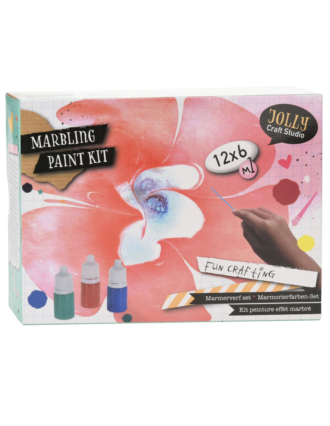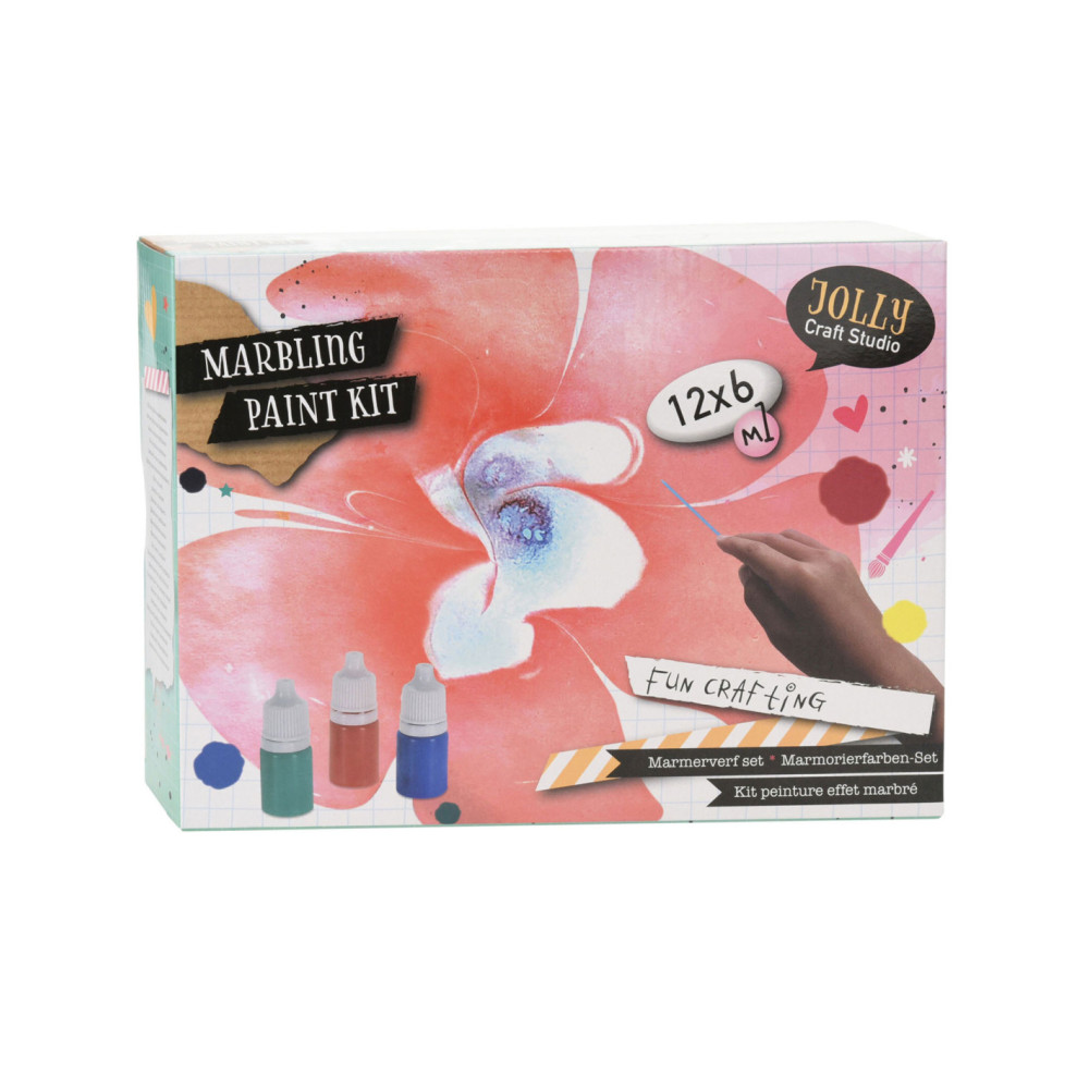 Marmerverfset met 12 potjes verf (6ml), papier, instructies en de benodigde tools.