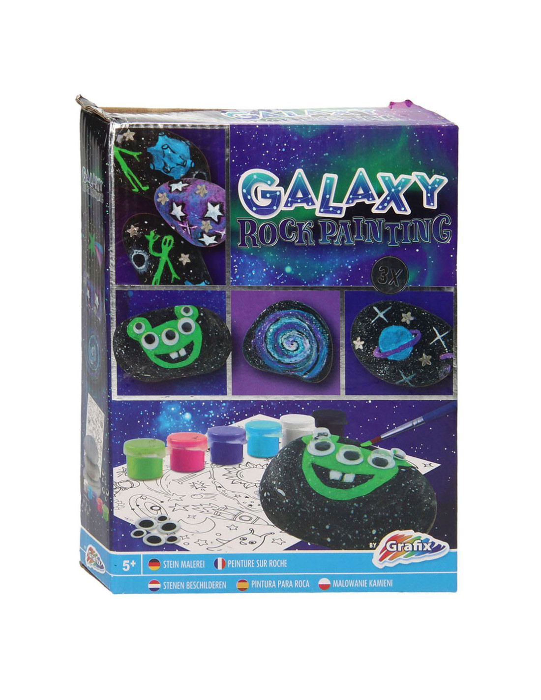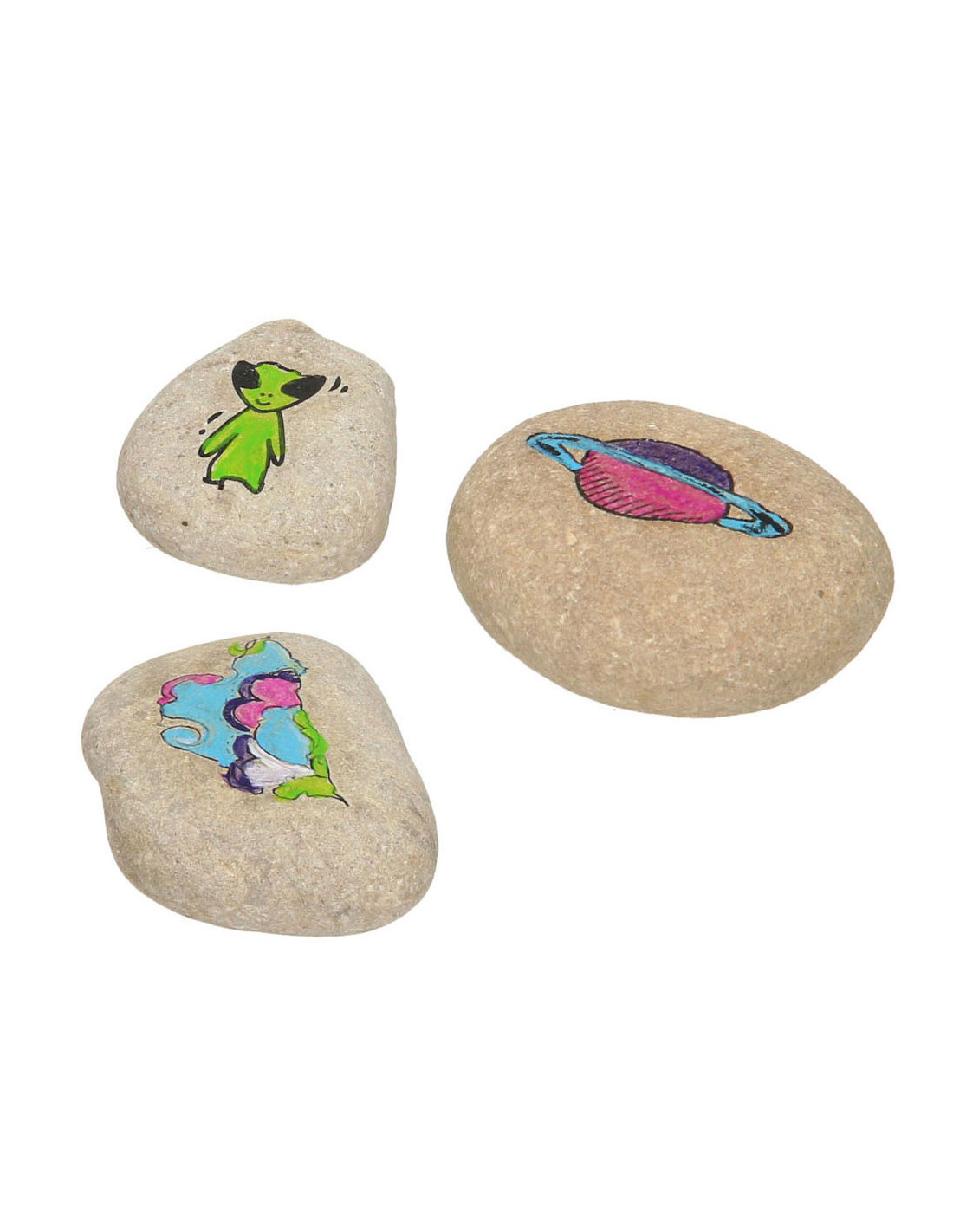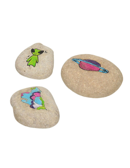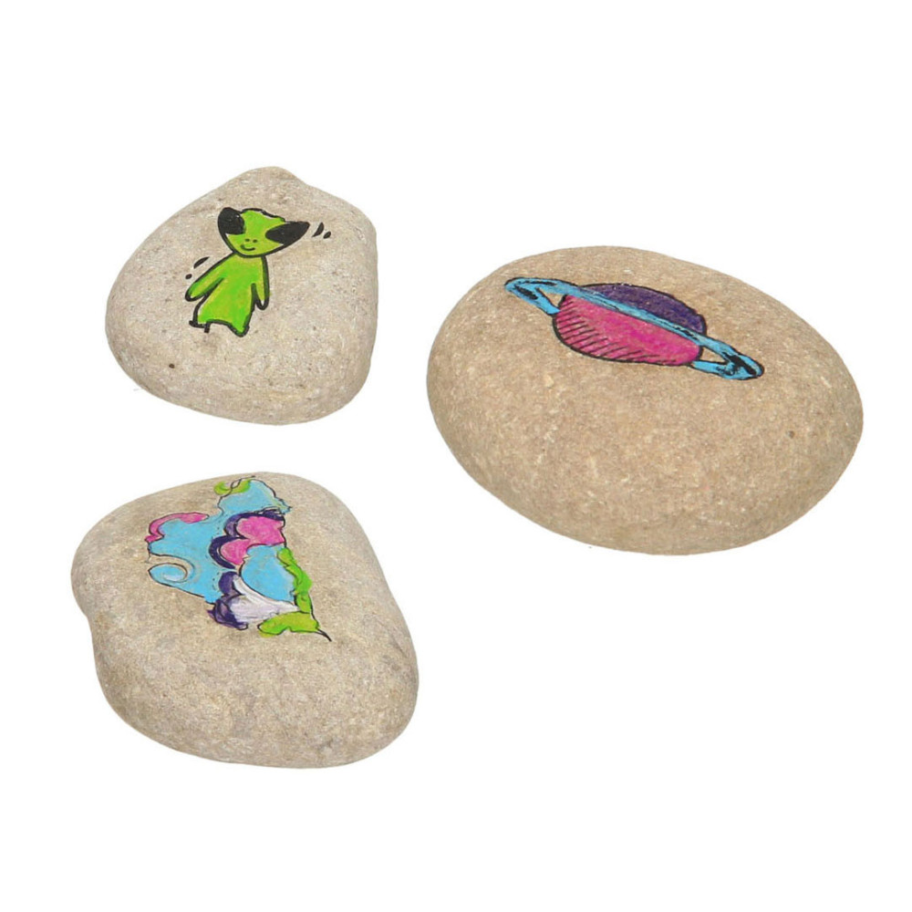 Tover 3 platte stenen om in indrukwekkende, buitenaardse kunstwerken! Met dit knutselpakket kunnen kinderen hun eigen Galaxy-stenen versieren met verf, zilveren glitters, alien- en planeetstickers en een kwast. Maak je eigen happy stones!