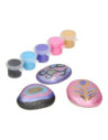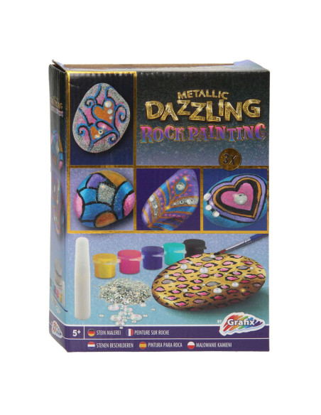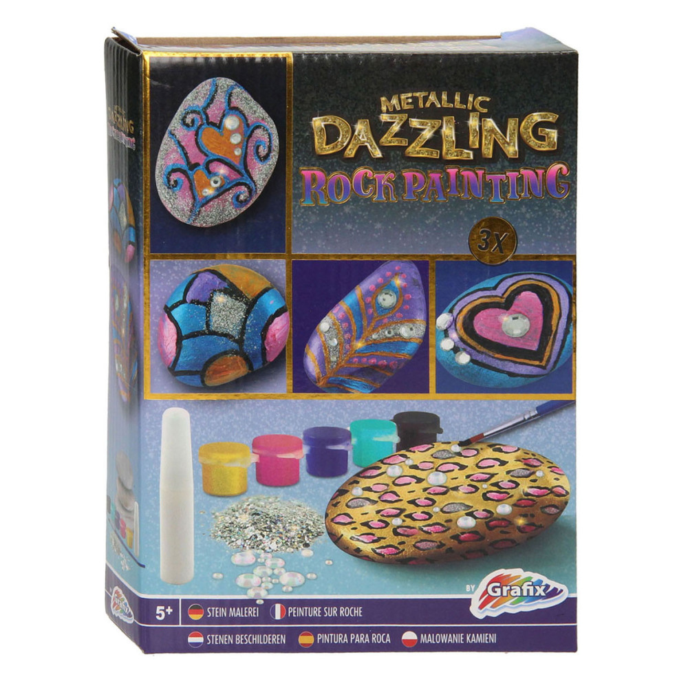 Stenen schilderen set met metallic verf, diamantjes en glitter. Inhoud: 3 stenen, 1 kwast, 1 lijmflesje, glitters en diamantjes. Geschikt vanaf 5 jaar.